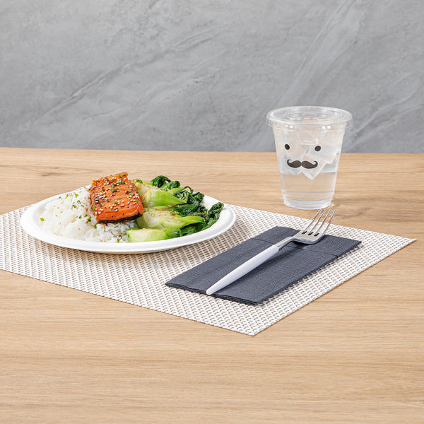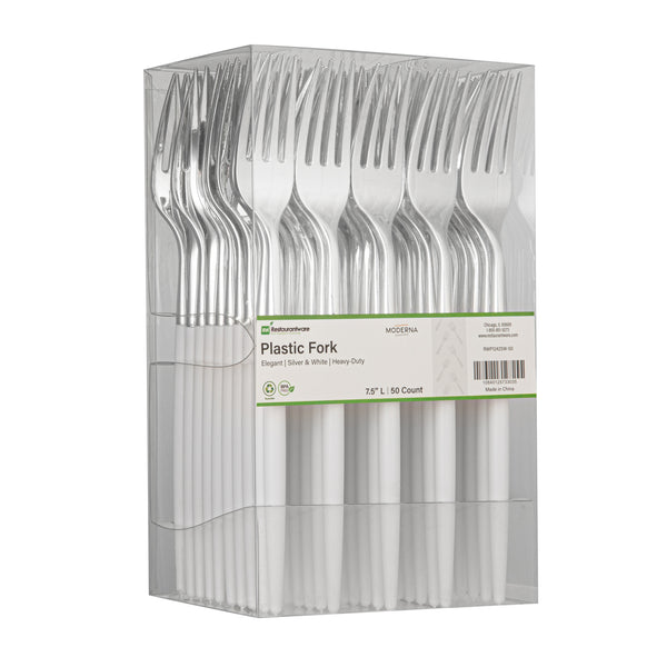 Provide sturdy utensils to your patrons with our Moderna Silver Plastic Forks. Crafted from resilient polystyrene plastic, these plastic forks exhibit exceptional durability, making them ideal for piercing hard foods with ease. These plastic cutlery items are, ensuring no harmful substances leach into your food. With the ability to withstand temperatures of up to 167F, these silver forks effortlessly handle both warm and cold dishes. These silver forks with white handles are recyclable, allowing you to minimize your carbon footprint. For added convenience, these fancy plastic silverware pieces are designed for seamless disposal, especially after large events. Completed with a stylish silver and white finish, these fancy plastic utensils provide an elegant touch to your tablescape, enhancing the overall aesthetic appeal. Each plastic fork measures 7.5 inches long. Shipped in a 50 count box.
