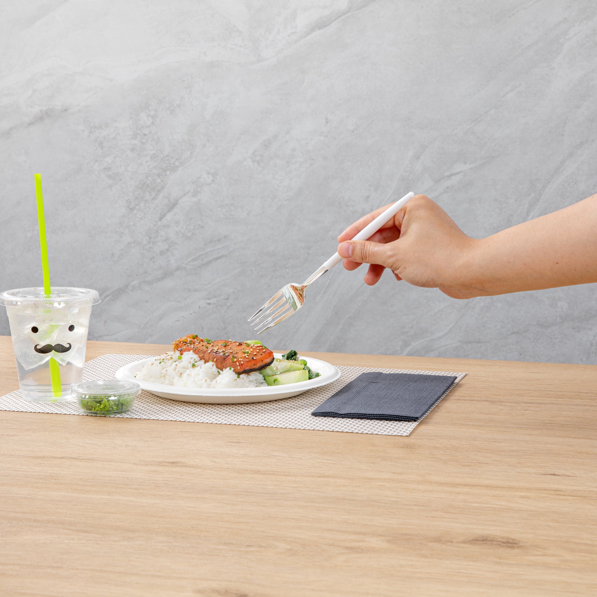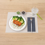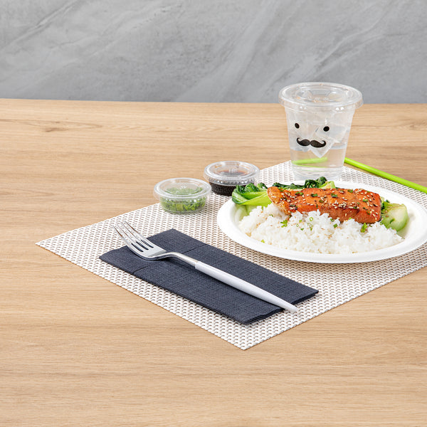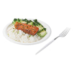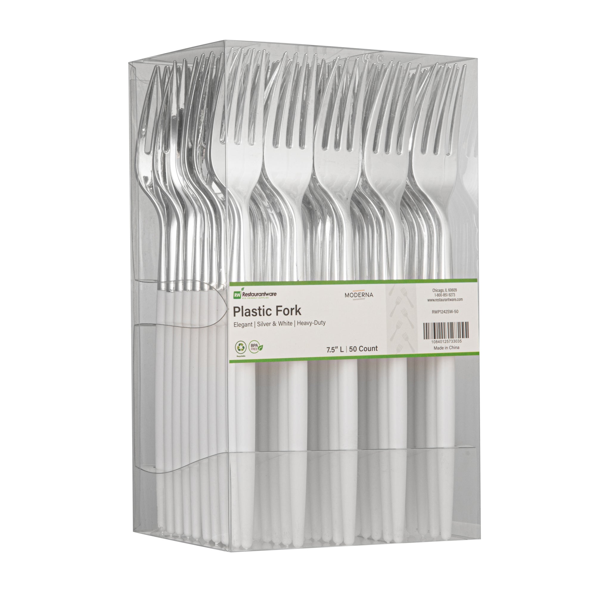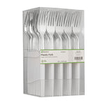 Provide sturdy utensils to your patrons with our Moderna Silver Plastic Forks. Crafted from polystyrene plastic, these plastic forks exhibit exceptional durability, making them ideal for piercing hard foods with ease. These plastic cutlery items are, ensuring no harmful substances leach into your food. With the ability to withstand temperatures of up to 167F, these silver forks effortlessly handle both hot and cold dishes. These silver forks with white handles are recyclable, allowing you to minimize your carbon footprint. For added convenience, these fancy plastic silverware pieces are designed for seamless disposal, especially after large events. Completed with a stylish silver and white finish, these fancy plastic utensils provide an elegant touch to your tablescape, enhancing the overall aesthetic appeal. Each plastic fork measures 7.5 inches long. Shipped in a 500 count box.