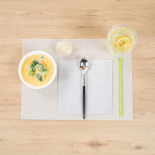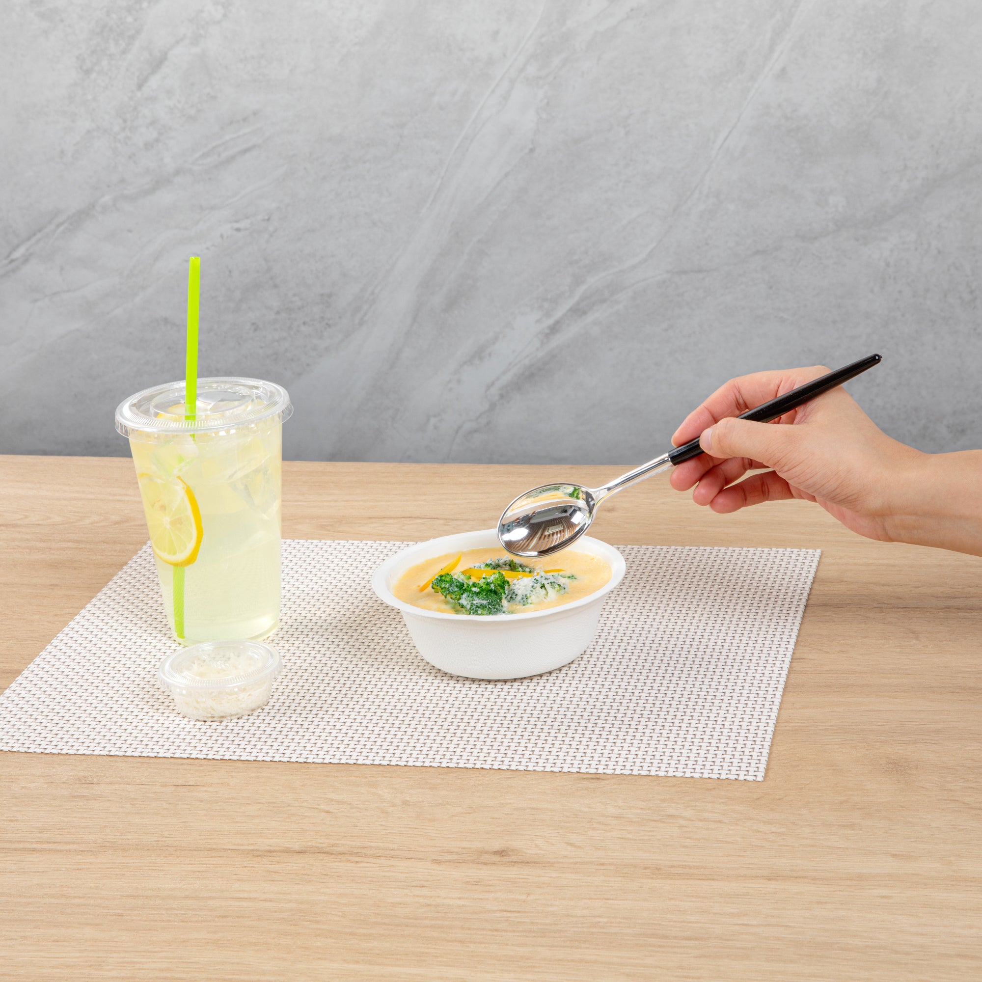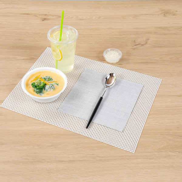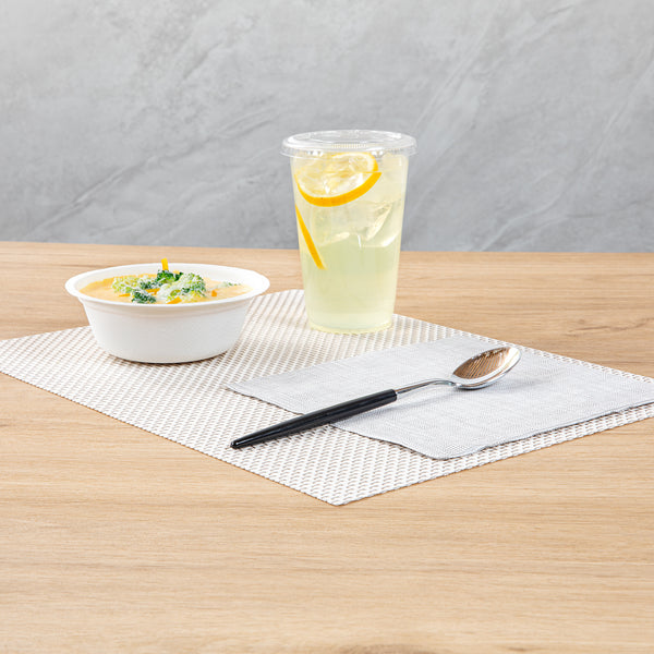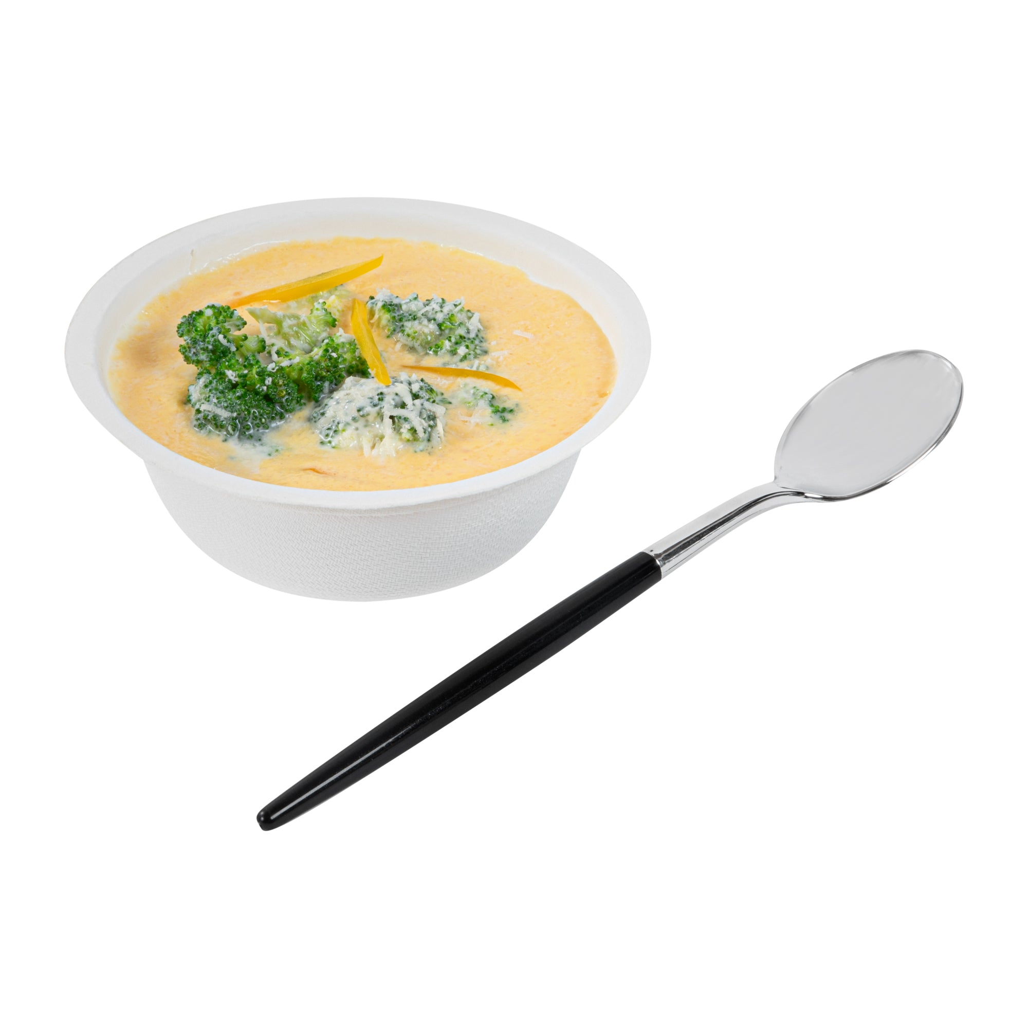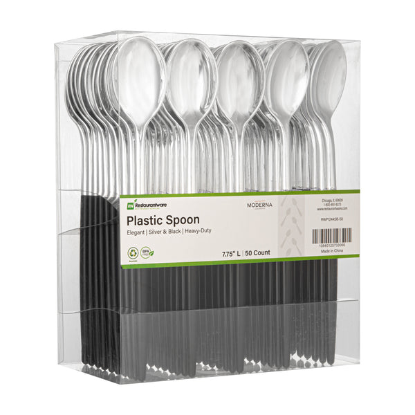 Provide a remarkable dining experience with our Moderna Silver Plastic Spoons. Made from polystyrene plastic, these plastic spoons exhibit exceptional durability, making them ideal for scooping and stirring various food items. These plastic utensils are, ensuring no harmful substances leach into your meals. Withstanding temperatures of up to 150F, these silver spoons effortlessly handle both warm and cold dishes. These silver spoons with black handles are recyclable, allowing you to minimize your carbon footprint. For added convenience, these fancy plastic silverware pieces are designed for seamless disposal, especially after large events. Adorned with a stylish silver and black finish, these fancy plastic utensils provide an elegant touch to your tablescape, enhancing the overall aesthetic appeal. Each utensil in this party cutlery set measures 7.75 inches long. Shipped in a 50 count box.