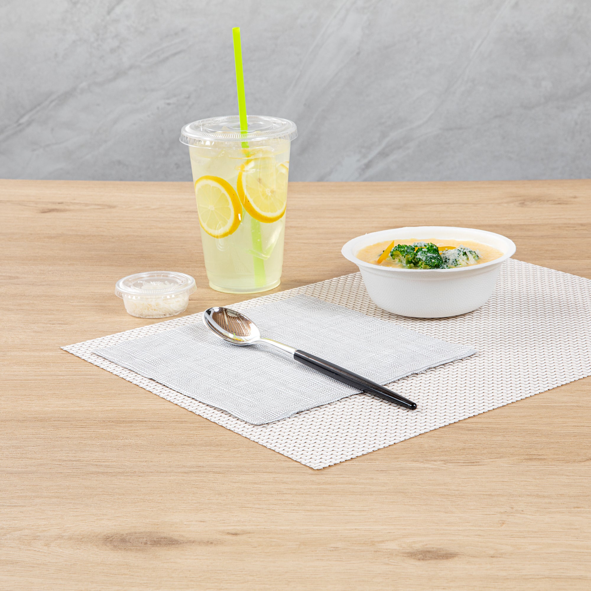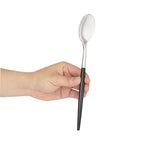 Provide a remarkable dining experience with our Moderna Silver Plastic Spoons. Made from polystyrene plastic, these plastic spoons exhibit exceptional durability, making them ideal for scooping and stirring various food items. These plastic utensils are, ensuring no harmful substances leach into your meals. Withstanding temperatures of up to 150F, these silver spoons effortlessly handle both warm and cold dishes. These silver spoons with black handles are recyclable, allowing you to minimize your carbon footprint. For added convenience, these fancy plastic silverware pieces are designed for seamless disposal, especially after large events. Adorned with a stylish silver and black finish, these fancy plastic utensils provide an elegant touch to your tablescape, enhancing the overall aesthetic appeal. Each utensil in this party cutlery set measures 7.75 inches long. Shipped in a 500 count box.
