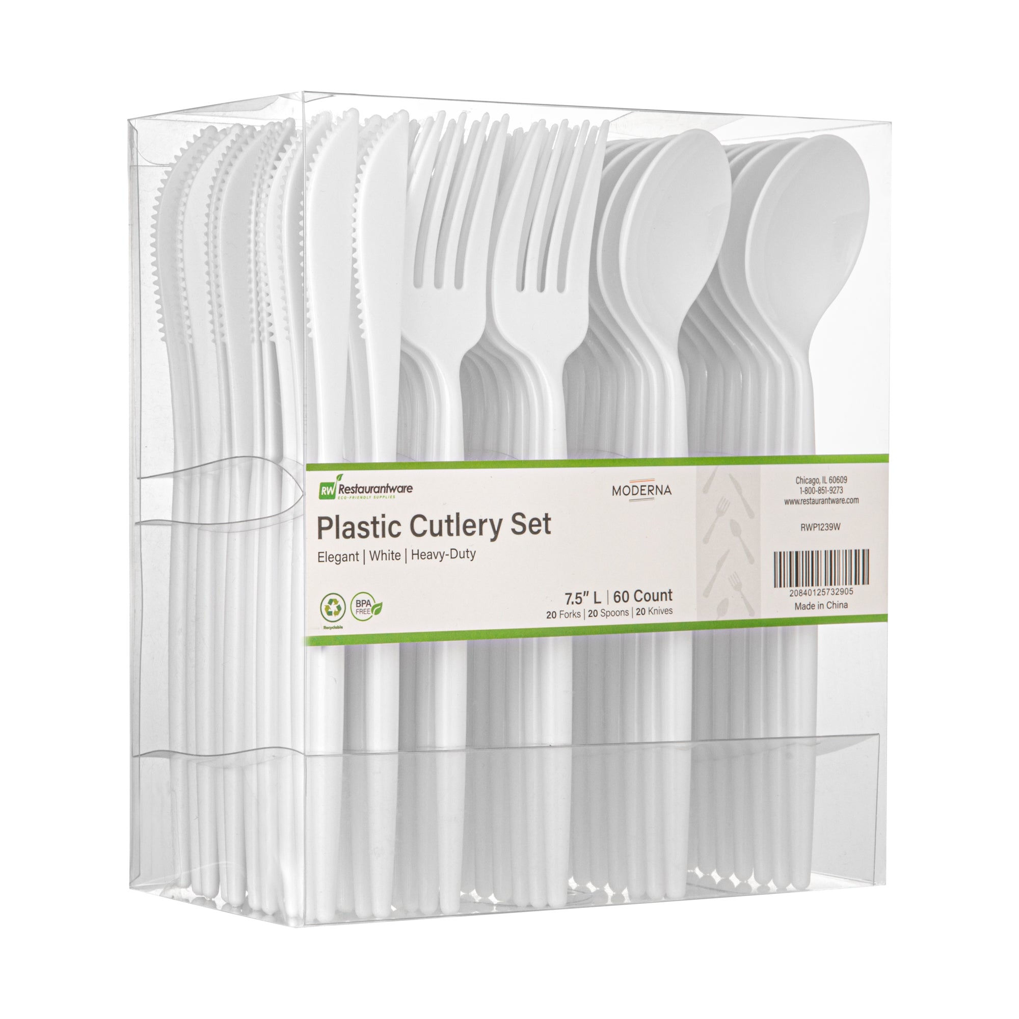 Introduce an air of elegance to your table with our Moderna White Plastic Cutlery Sets. These party cutlery sets comprise top-quality polystyrene utensils, ensuring style and durability. The sturdy handle design of these, heavy-duty plastic flatware sets ensures these utensils won't break, even when used with tough foods. The white finish of these recyclable plastic flatware sets adds a sophisticated flair to your table decor. With 20 forks, 20 knives, and 20 spoons, these disposable flatware sets are perfect for larger events. For a simplified cleanup, these white plastic utensil sets are disposable. Each utensil in these party cutlery sets measures 7.5 inches long. Shipped in a 60 count box.