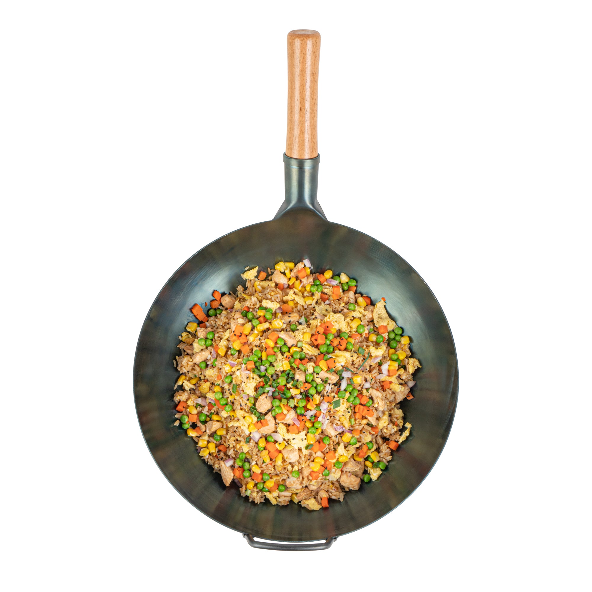 Equipped with a welded handle featuring a wooden grip, these Asian woks provide a comfortable and firm hold. The handle protects hands from heat and enables easy handling and maneuvering during cooking, ensuring a pleasant cooking experience.