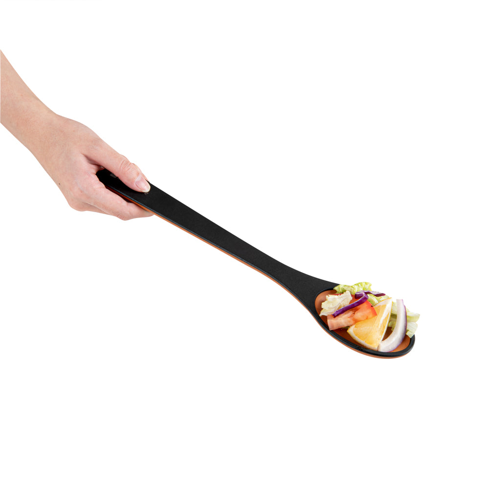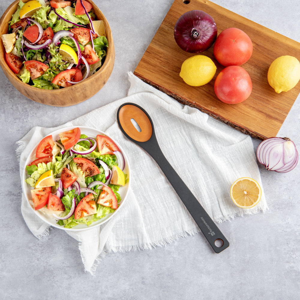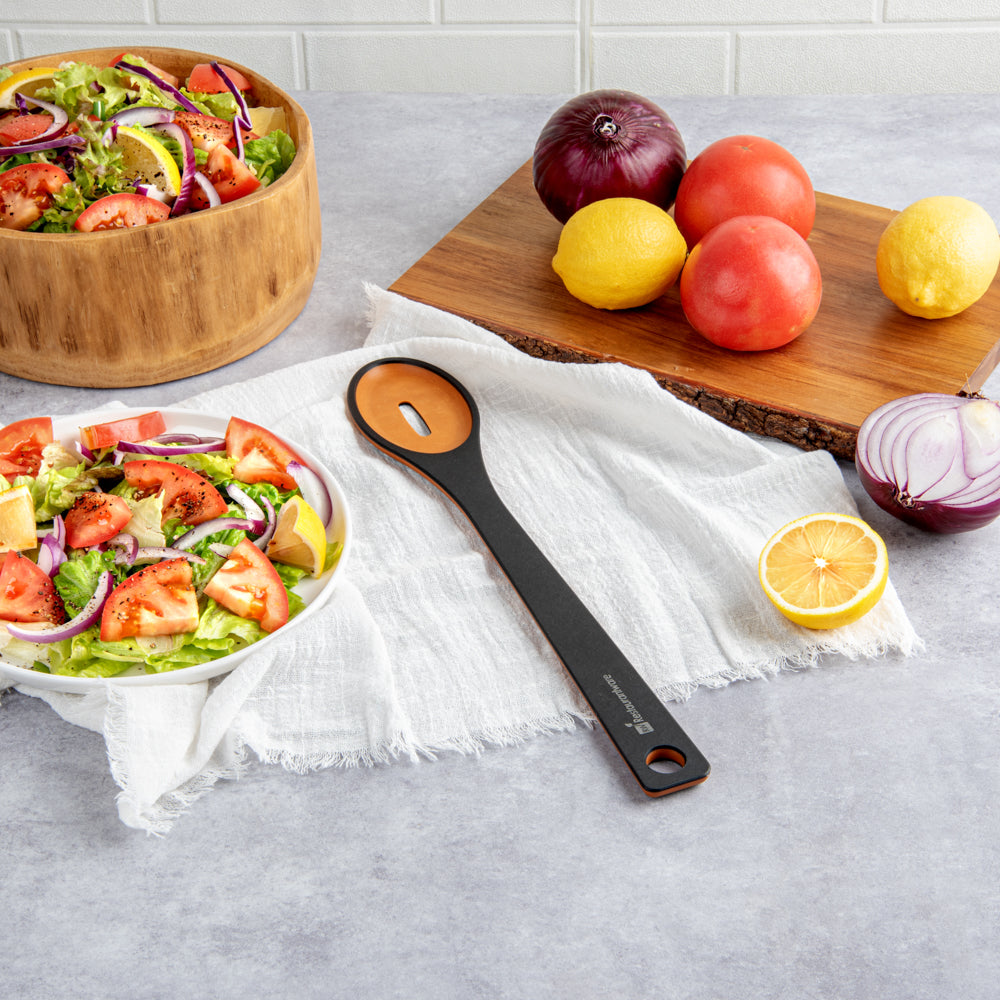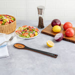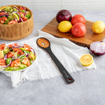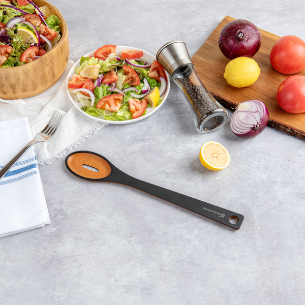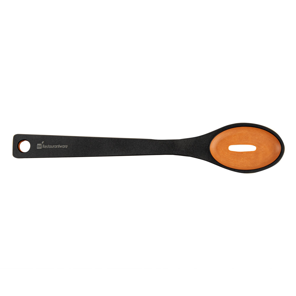 Remove your vegetables from the broth using our Nature Tek Black Wood Slotted Spoon. This black pine wood spoon has a single-slot design suitable for cooking or serving tasks requiring liquid draining. Manufactured from premium wood pulp, this slotted serving spoon is durable to withstand rigorous long-term use. The long handle of this wooden spoon with a slot has a smooth splinter-free surface, providing a comfortable grip for effective handling. With a hole in the handle, you can hang this wooden kitchen spoon anywhere after use to save space on your countertop and for easy access. This wooden spoon has a thick handle that does not conduct heat, letting you filter fried food from grease without burning your skin. With soft edges, this non-stick wooden cooking spoon protects your pots and pans from scratches. The dishwashable feature of this spoon for cooking simplifies the cleaning process and makes it reusable. This wooden slotted spoon for frying measures 13 inches in length by 2.4 inches in width. Shipped in a 1 count box.