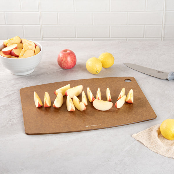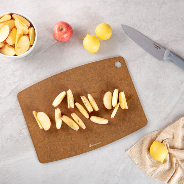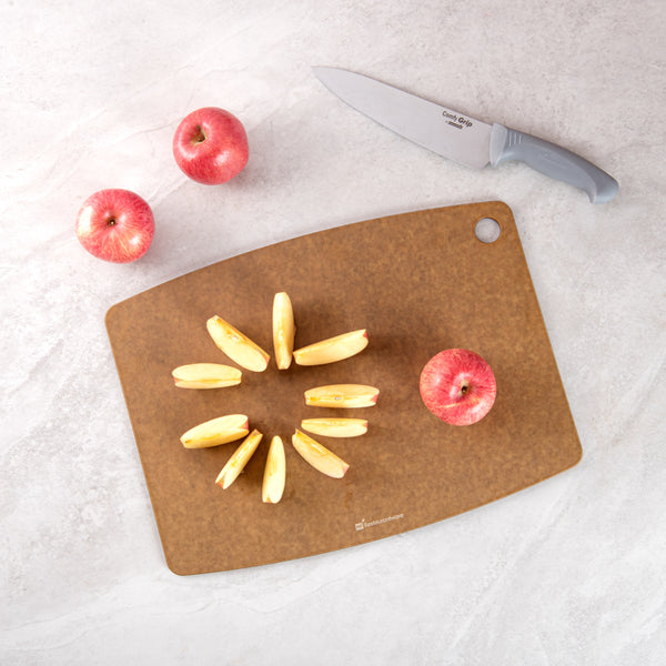 These double-sided cutting boards don't dull knives even after heavy use, as the wood fiber material is gentle on the blades. Can be used with serrated knives too!