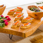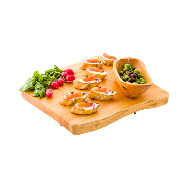 Display your fare on our one-of-a-kind Nature Tek Natural Wood Large Serving Stand. This wooden display stand includes three metal legs that are easily attached to elevate your elegant presentations. Its metal legs can also be removed to use the wooden slab as a stylish serving tray. Featuring unique natural edges and a wood grain pattern, this handcrafted wooden serving stand elegantly showcases signature dishes, baked goods, and delicious snacks at your foodservice establishment. Constructed from durable wood, this tree slice stand is shatterproof and chip-resistant to withstand high-volume use and maintain its premium appearance. Designed with a sleek and smooth surface, this wood slice cake stand can be quickly wiped down to streamline the cleaning process at your buffet, bakery, and catering event. This wooden food display stand measures around 15 inches in length and 14 inches wide, while the metal legs are 3 inches tall. This display stand's wooden slab will vary in size, shape, and color due to its handmade nature. Ships in a 1 count box.
