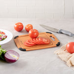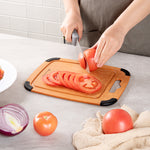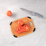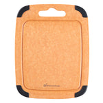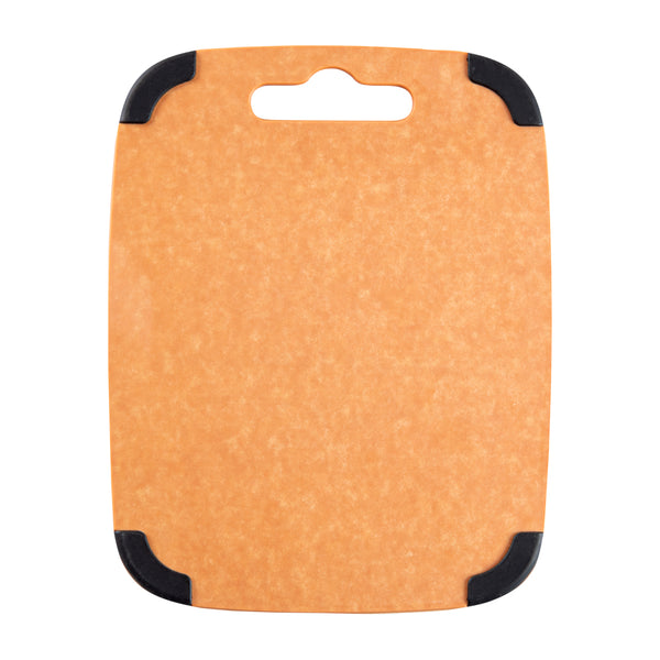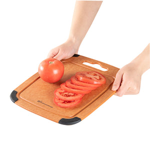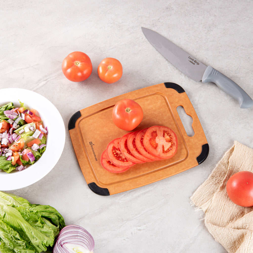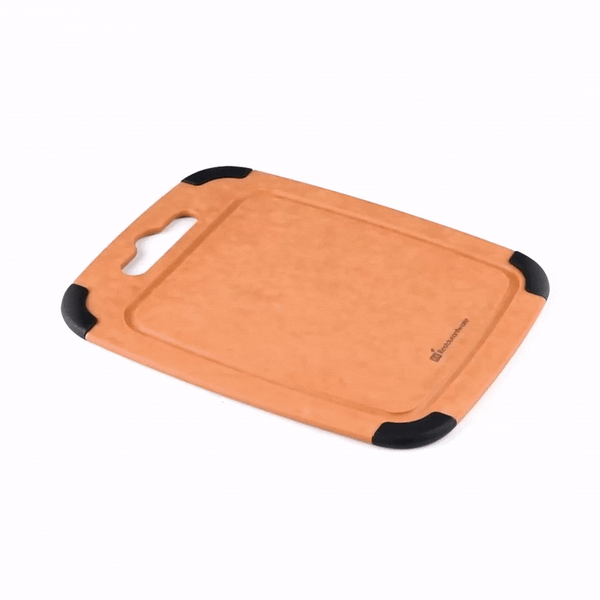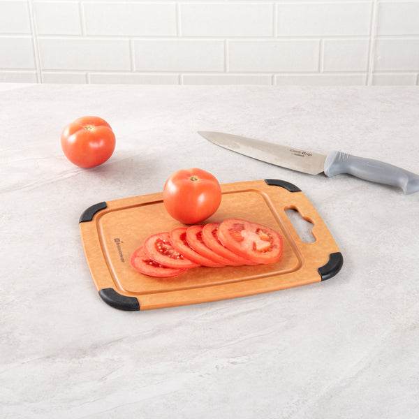 Use our Nature Tek Wood Cutting Board to cut, chop and slice fruits and veggies in your kitchen in a mess-free manner. This chopping board is manufactured from pine wood composite, making it ultra-durable and long-lasting. Featuring a juice groove around the perimeter on one side, this vegetable cutting board prevents liquids from spilling onto the countertop. The built-in hanger hole of this lightweight, wood composite cutting board makes it easy to grab, use, and store. This cutting board with a juice groove comes with non-slip silicone corners, providing added grip to avoid the board from slipping. Just flip this cutting board with a handle to use it as a flat food prep board without grooves. Heat-resistant up to 350F, this natural fiber cutting board can be used as a trivet for hot pans. This dishwashable kitchen board is hot and cold-friendly, enabling you to use it as a food serving tray. The non-porous material of this bread cutting board prevents the absorption of grease, odor, and moisture to stall bacterial growth. This non-slip chopping board is knife-safe to avoid dulling of straight or serrated blades. Measuring 11.75 inches in length by 9.25 inches wide, this wood fiber chopping board is perfect for slicing fruits or light snacks. Shipped in a 1 count box.