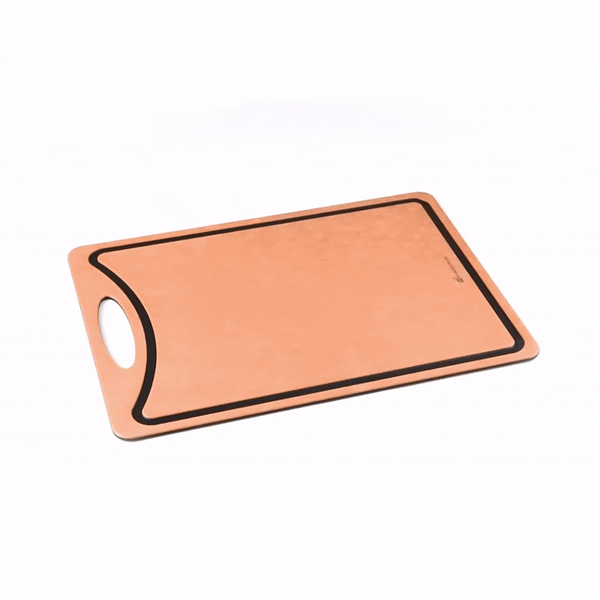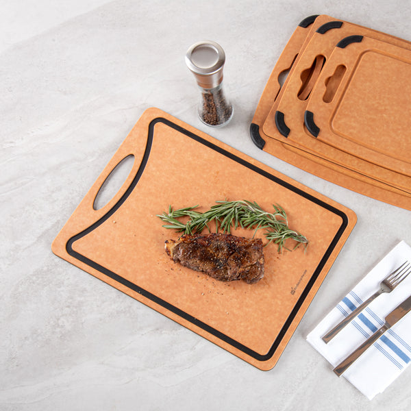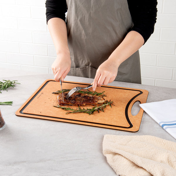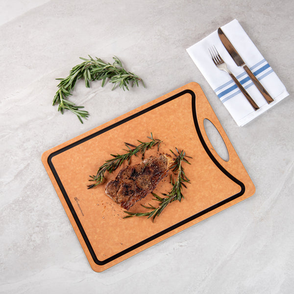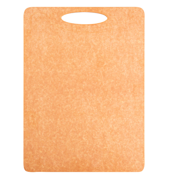 Cut up meats and vegetables in a mess-free manner with our Nature Tek Wood Gourmet Cutting Board. Made with pine wood fibers, this wood composite cutting board is durable yet lightweight. This vegetable cutting board features an oval handle for comfortable use and space-efficient storage. With an integrated juice groove on one side, this chopping board captures liquids before it gets to the countertop. The non-grooved side of this kitchen board can be used as a food-prep tray or serving tray. This wooden chopping board is dishwasher-safe for effortless cleaning. To maintain hygiene and to resist bacteria, this non-stick natural fiber cutting board won't absorb moisture or odors. The hot and cold-friendly surface of this carving board is heat-resistant up to 350F, enabling you to use it as a trivet. This knife-safe cutting board with juice groove prevents your blades from becoming dull over time and is safe to use with serrated knives. With a dual-tone design, this gourmet cutting provides a rustic look to match the environment of your kitchen while keeping it clean. Measuring 17.25 inches long by 12.75 inches wide, this standard-size cutting board provides ample room to cut up multiple food items. Shipped in a 1 count box.