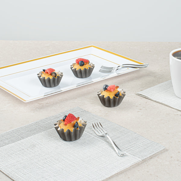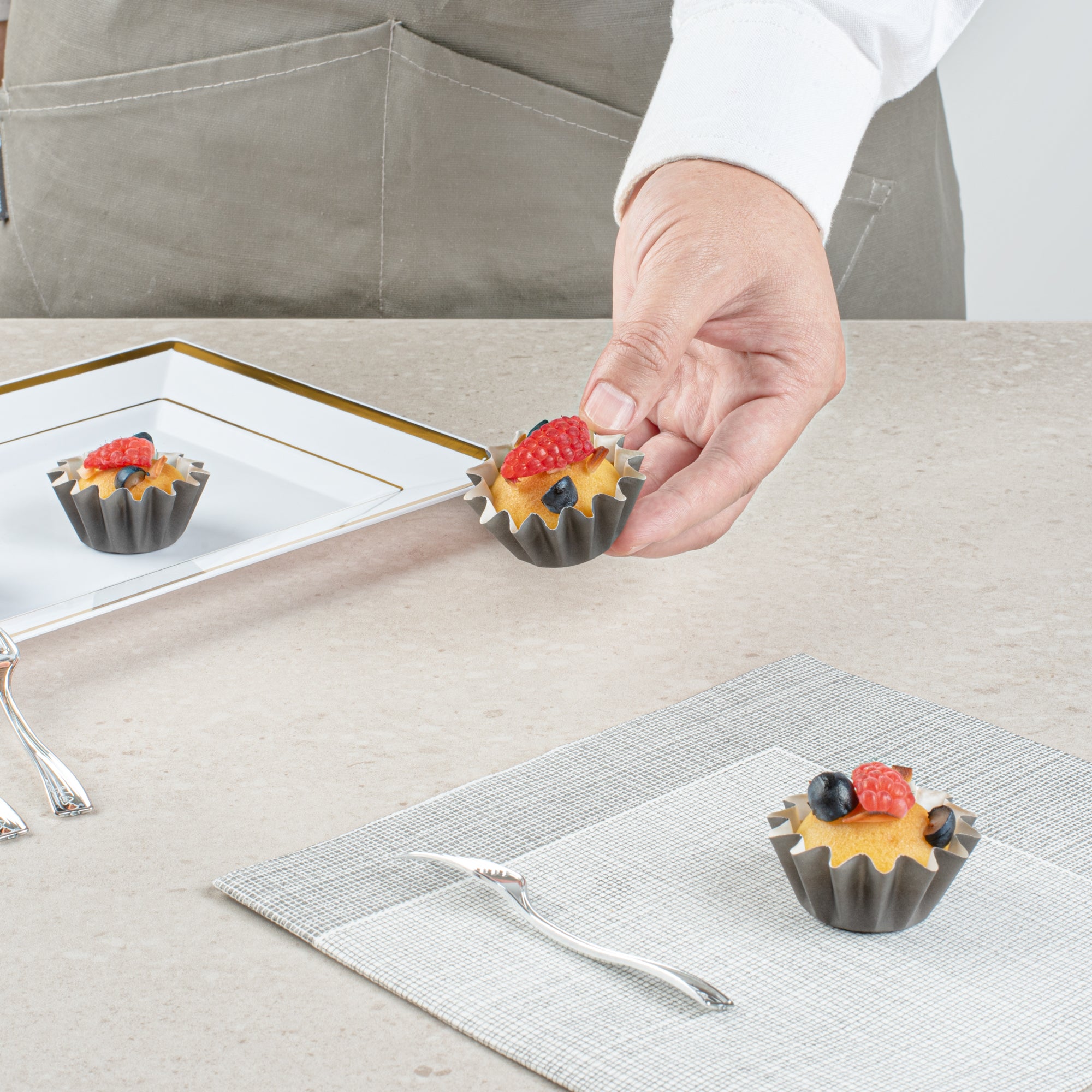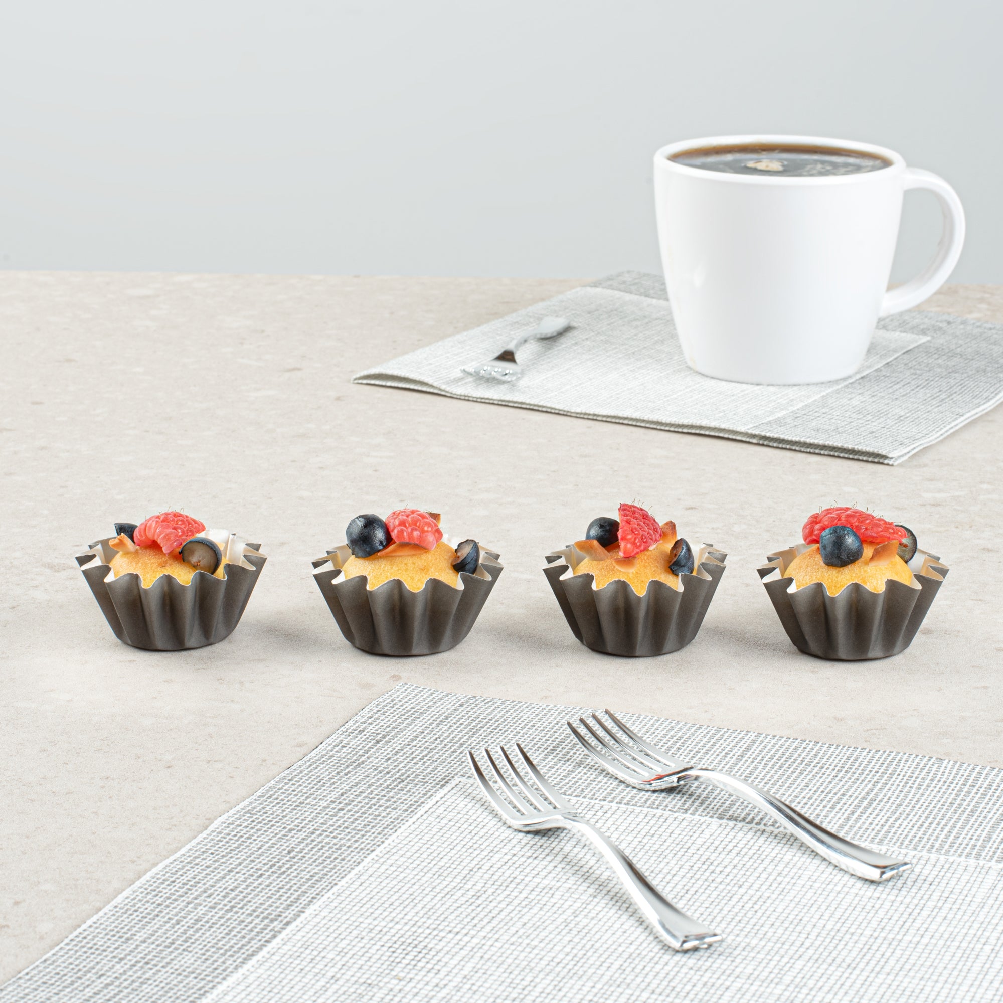 Enhance your bakery's presentation with effortless release. Panificio Grease-Resistant Mini Baking Cups feature a specialized grease-resistant coating, ensuring mini cakes and muffins release smoothly, minimizing mess and maximizing efficiency. These round muffin liners are crafted from heavyweight paper, expertly designed to withstand oven temperatures up to 425 degrees Fahrenheit, making them ideal for consistent baking results. The flared design of these disposable cupcake cups accentuates and frames your baked creations, highlighting their artisanal appeal and drawing customers' attention to your delicious offerings. Measuring 2 inches in length and width, with a height of 0.6 inches, these gray paper liners provide a reliable solution for both baking and display, enhancing the overall foodservice experience. Upgrade your bakery essentials today with these versatile mini baking cups. Sold in a 200 count box.