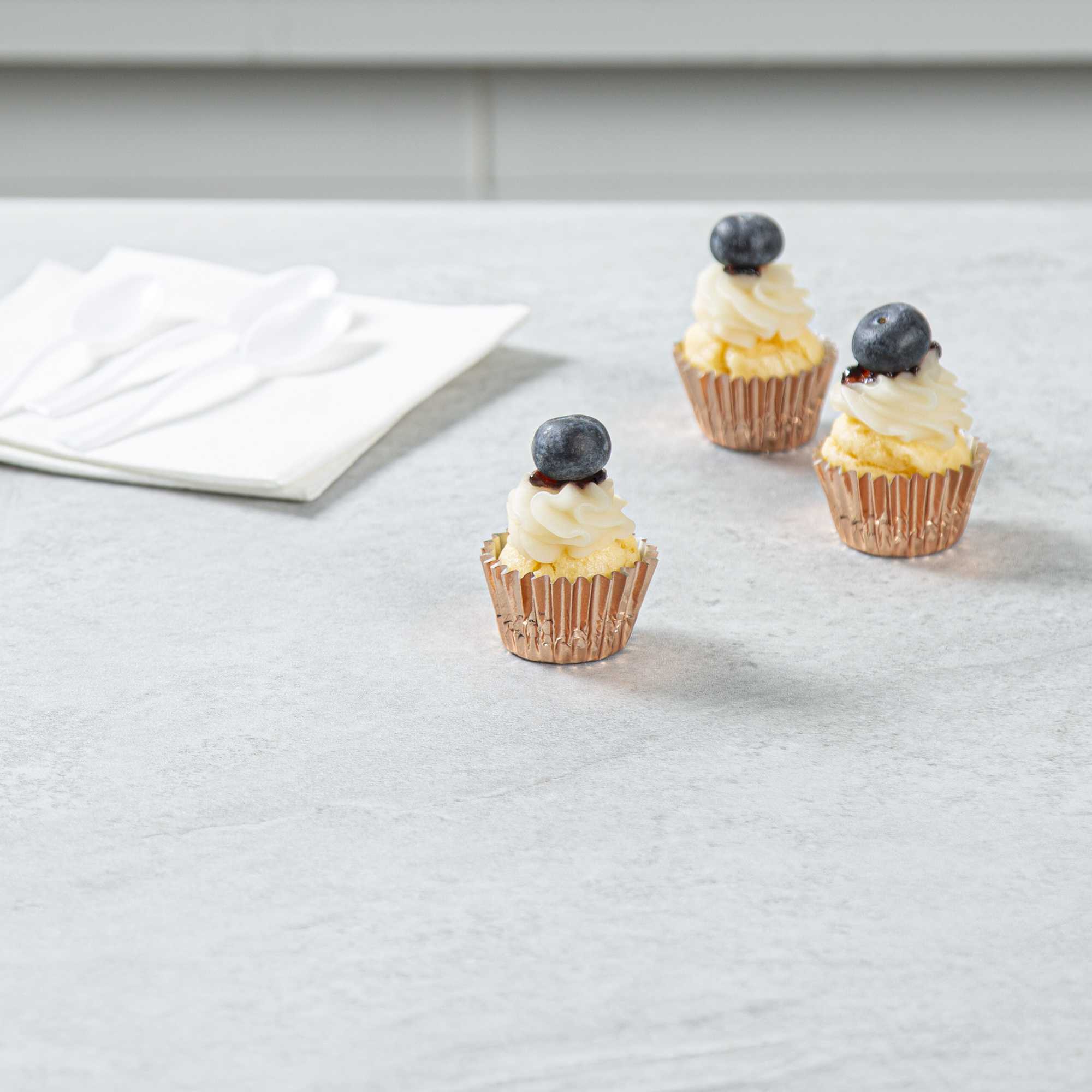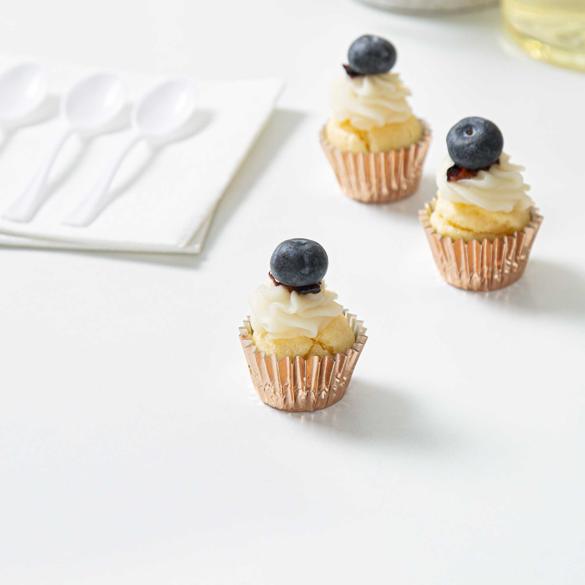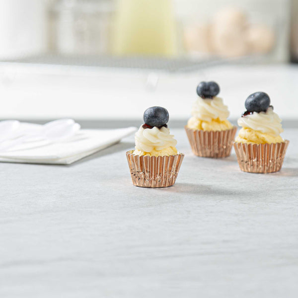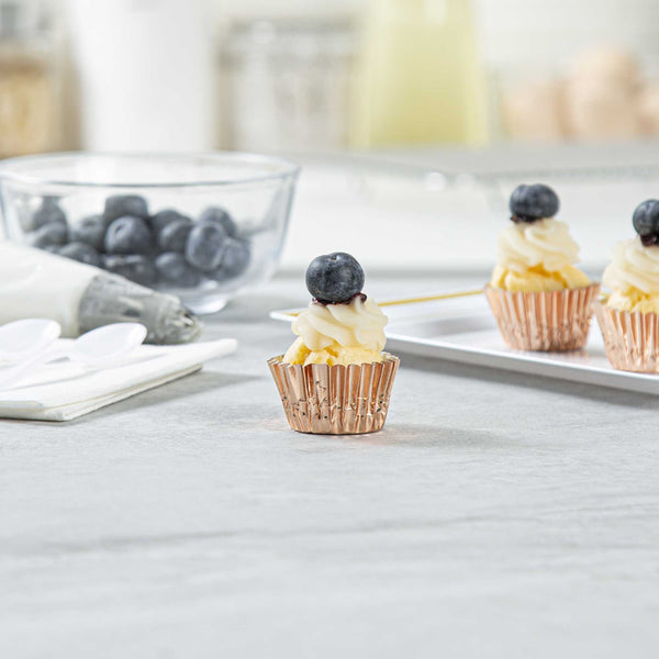 Give bite-sized appetizers and desserts a makeover with our Panificio 0.4 oz Round Metallic Rose Gold Paper Baking Cups. These baking cups feature an exterior foil coating that adds a touch of refinement to your confectionary presentation. Made from grease-resistant paper, these mini cupcake wrappers also provide additional protection against spills and stains. Easily bake your confections in these mini cupcake liners, which are oven-safe. Plus, they are freezable, making them suitable for cold desserts. After large events, these silver baking cups can be effortlessly disposed of for added convenience. Measuring 1.25 inches in diameter by 0.75 inches in height, these round cupcake cups contain up to 0.4 ounces, making them ideal for bakeries, cake shops, and catered events. Shipped in a 200 count box.