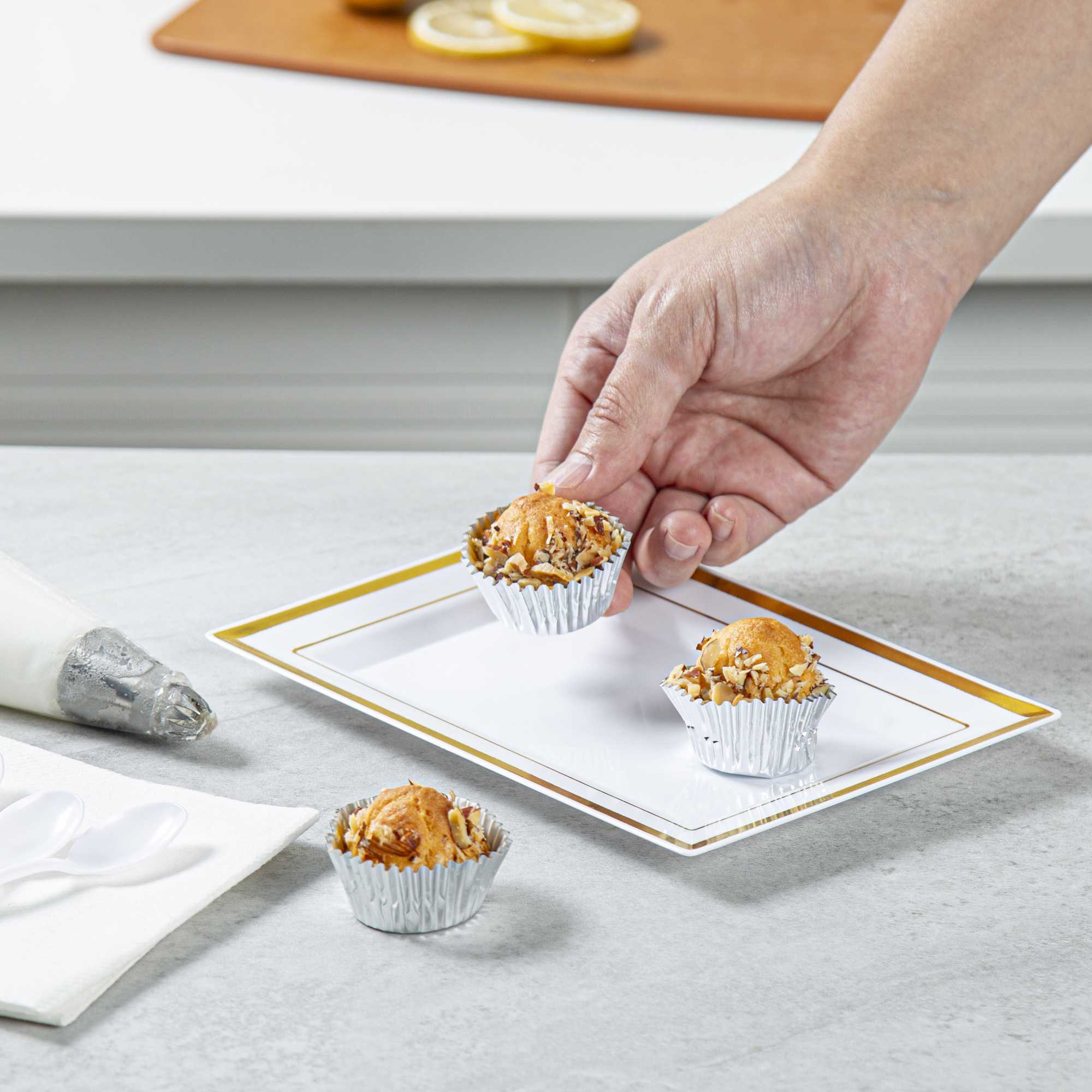 Present your bite-sized confections with our Panificio 0.4 oz Round Metallic Silver Paper Baking Cups. The external foil coat of these baking cups exudes ultra-chic vibes for your confectionary presentation. Crafted from grease-resistant paper, these mini cupcake wrappers offer extra protection against spills and stains. These mini cupcake liners are oven-safe to easily bake your confections. Plus, these paper baking cups are freezable to make cold desserts. These silver baking cups are conveniently disposable after events. Measuring 1.25 inches in diameter by 0.75 inches in height, these round cupcake cups contain up to 0.4 ounces, making them ideal for bakeries, cake shops, and catered events. Shipped in a 200 count box.