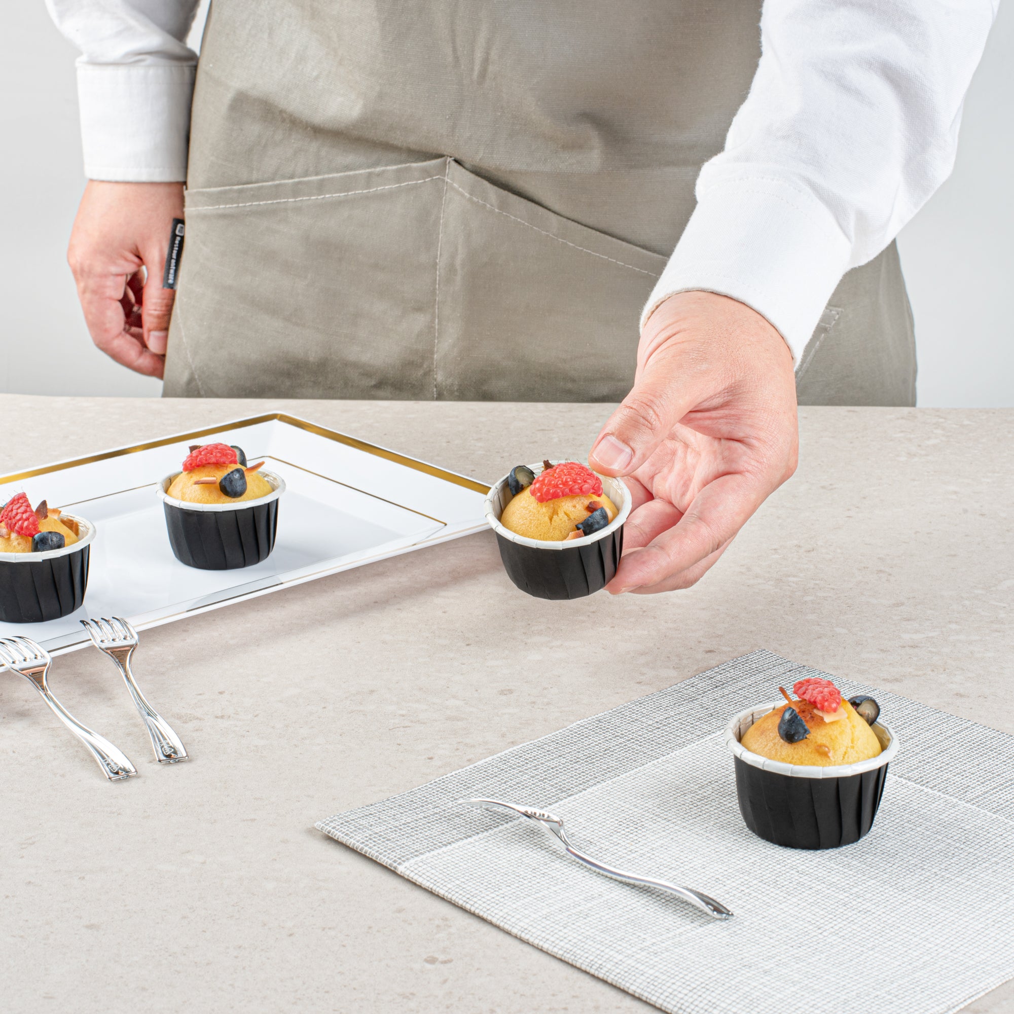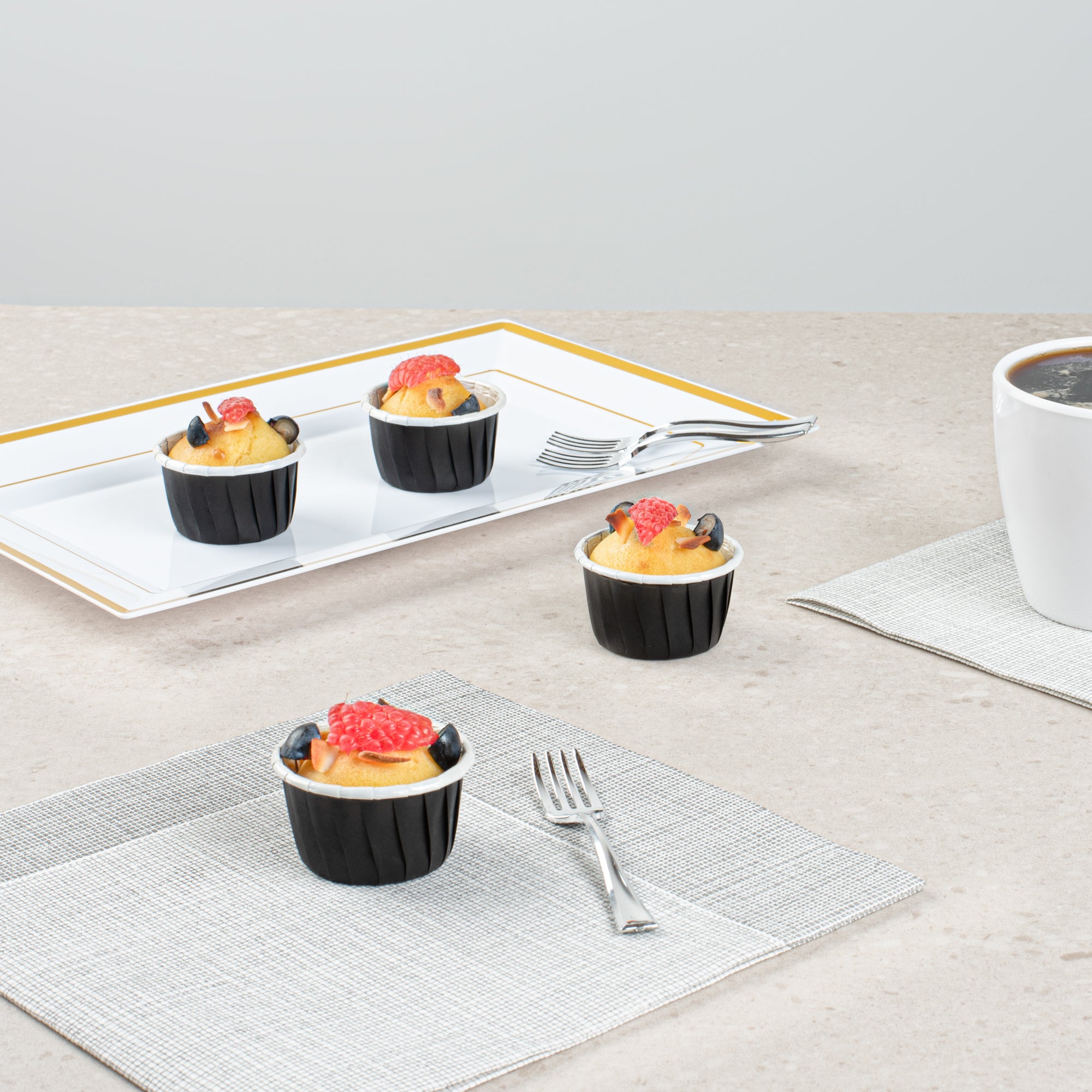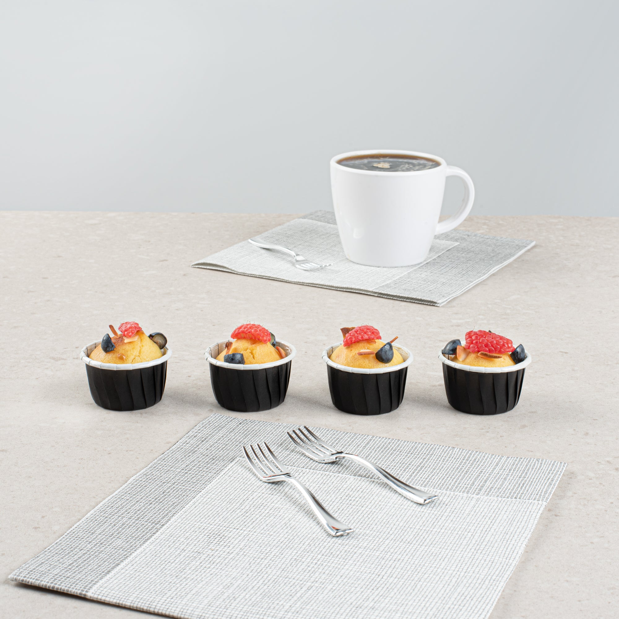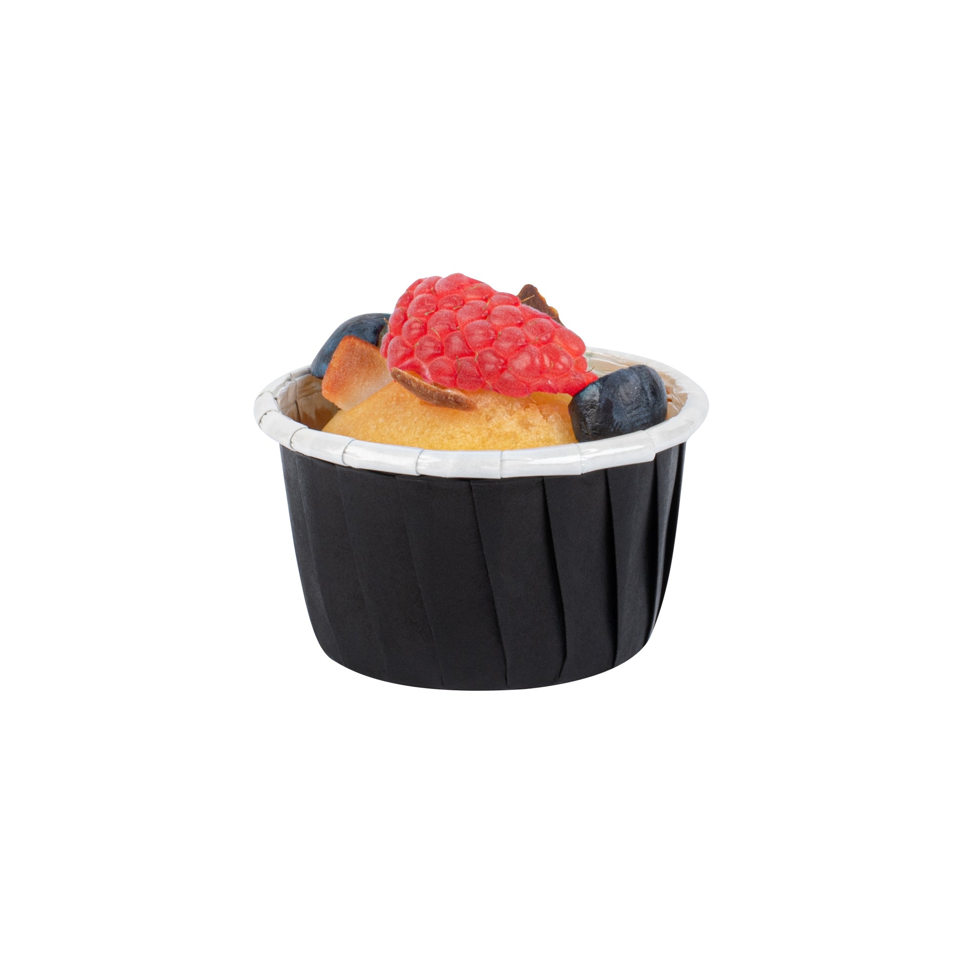 Enhance your bakery's efficiency with grease-resistant cupcake liners. The Panificio Grease-Resistant Black Paper Cupcake Liner is designed with a grease-resistant coating that ensures the easy release of baked treats, preventing sticking and mess. Each paper baking cup is crafted from heavyweight paper, allowing it to withstand high oven temperatures up to 425 degrees Fahrenheit, ideal for all your baking needs. The pleated design not only accentuates the presentation of your cupcakes and muffins but also adds a touch of elegance with its sleek black color. Measuring 2 inches in length, 2 inches in width, and 1.18 inches in height, these cupcake liners provide the perfect fit for standard-sized treats. Use these disposable liners to streamline your baking process while maintaining high foodservice standards. Each order includes 200 Panificio Grease-Resistant Black Paper Cupcake Liners.