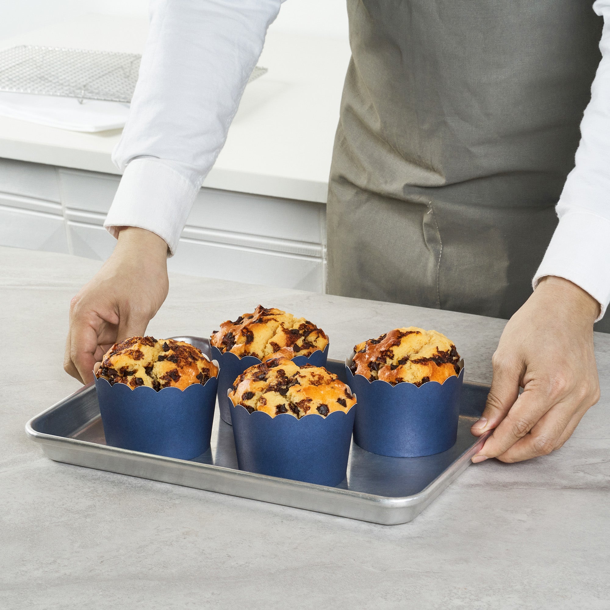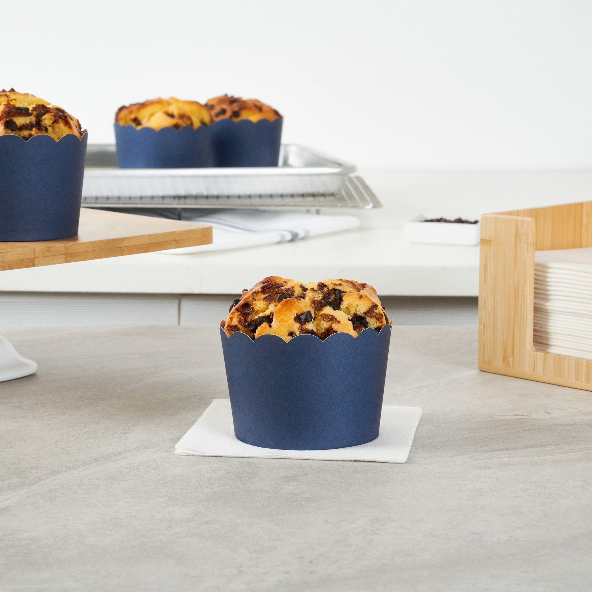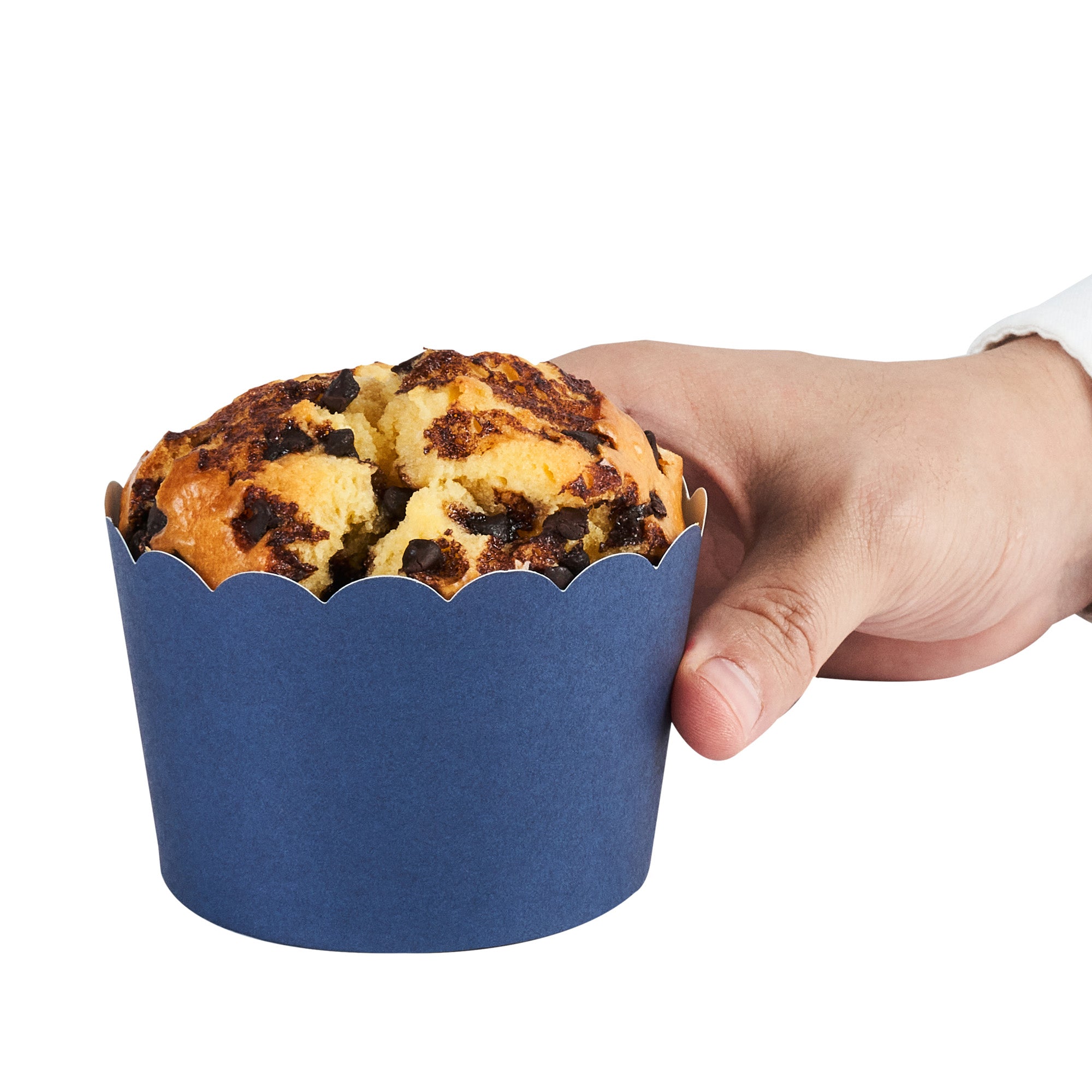 Elevate your baked goods with stylish, mess-free presentation. The Panificio Greaseproof Jumbo Cupcake Liners combine a greaseproof paper construction with a tulip design, ensuring that your culinary creations emerge from the oven with ease and elegance. These jumbo cupcake liners, with their generous 10-ounce capacity, accommodate larger portions, making them ideal for substantial servings at bakeries or cafes. The scalloped edges of these liners add an elegant flair, enhancing the visual appeal of cupcakes and pastries while the paper supports sustainable foodservice operations. Designed with an oven-ready feature, these greaseproof baking liners streamline your baking process by allowing treats to be baked directly in the cup, saving time and reducing waste. Perfect for catering events, these liners provide a sophisticated midnight blue color that captivates and entices customers. Each order includes 200 Panificio Greaseproof Jumbo Cupcake Liners.