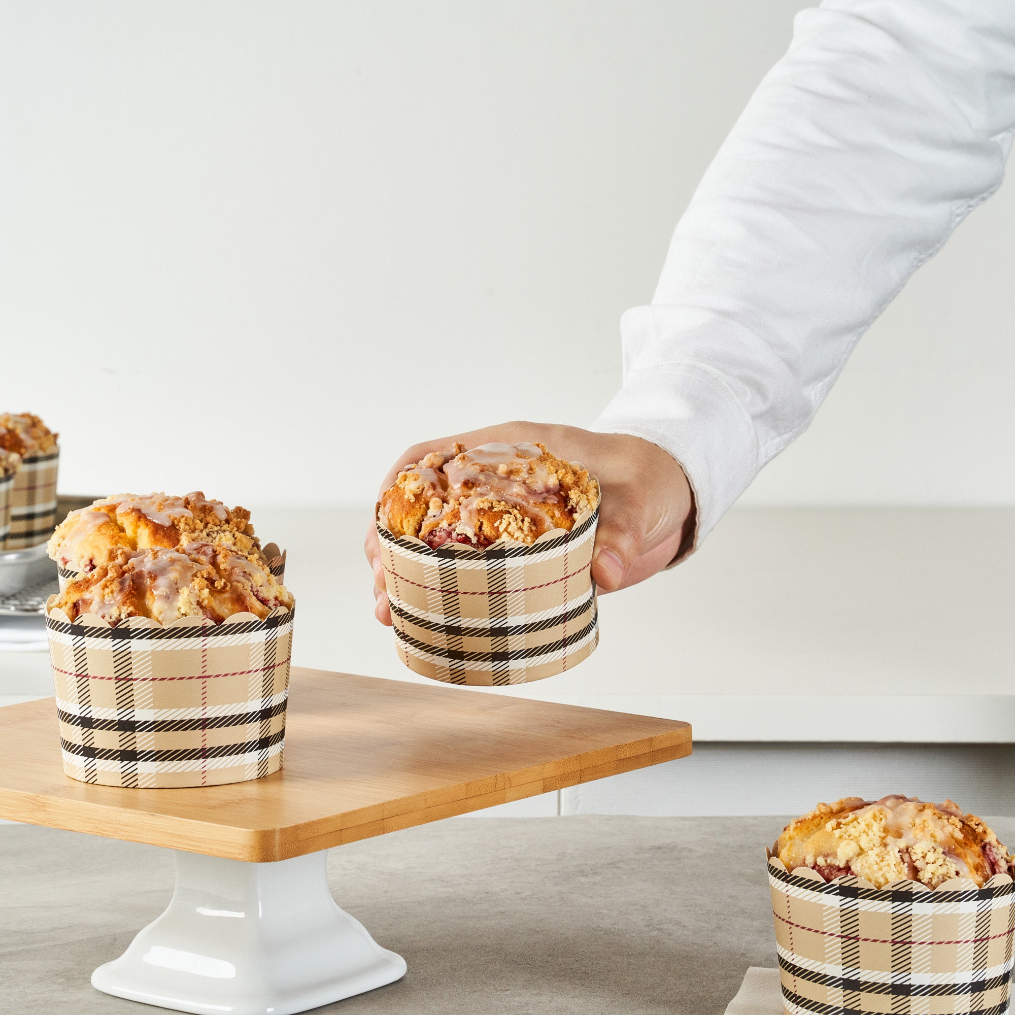 Elevate your bakery's dessert presentation with ease. The Panificio Greaseproof Jumbo Baking Cups feature a greaseproof lining that ensures easy release of your baked goods, making them perfect for busy bakeries and cafes. With their distinctive scalloped edges, these jumbo baking cups add an elegant flair to any confection, enhancing customer appeal. Their 10-ounce capacity is ideal for serving large muffins or cupcakes, accommodating generous portions that delight customers. Measuring 3.5 inches in diameter and 2.5 inches in height, these brown plaid greaseproof baking cups fit seamlessly into any culinary setting. Oven-ready, they allow for the convenient baking of treats directly in the cup, streamlining your cooking process. Choose these large cupcake liners to enhance your foodservice offerings with style and sustainability. Each order includes 200 Panificio Greaseproof Jumbo Baking Cups.