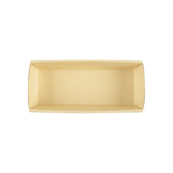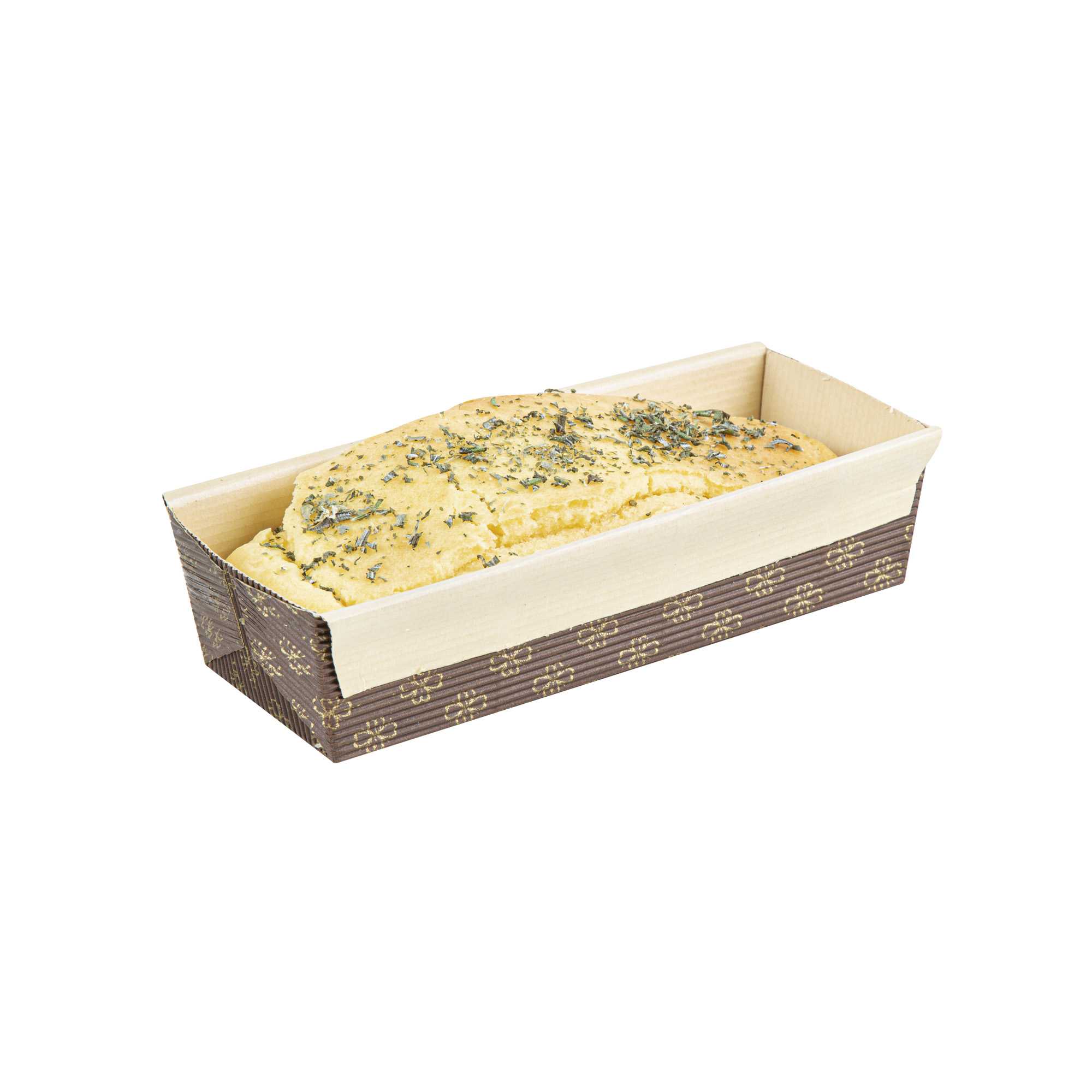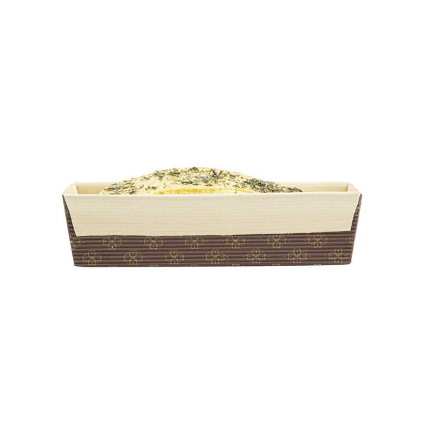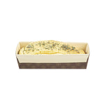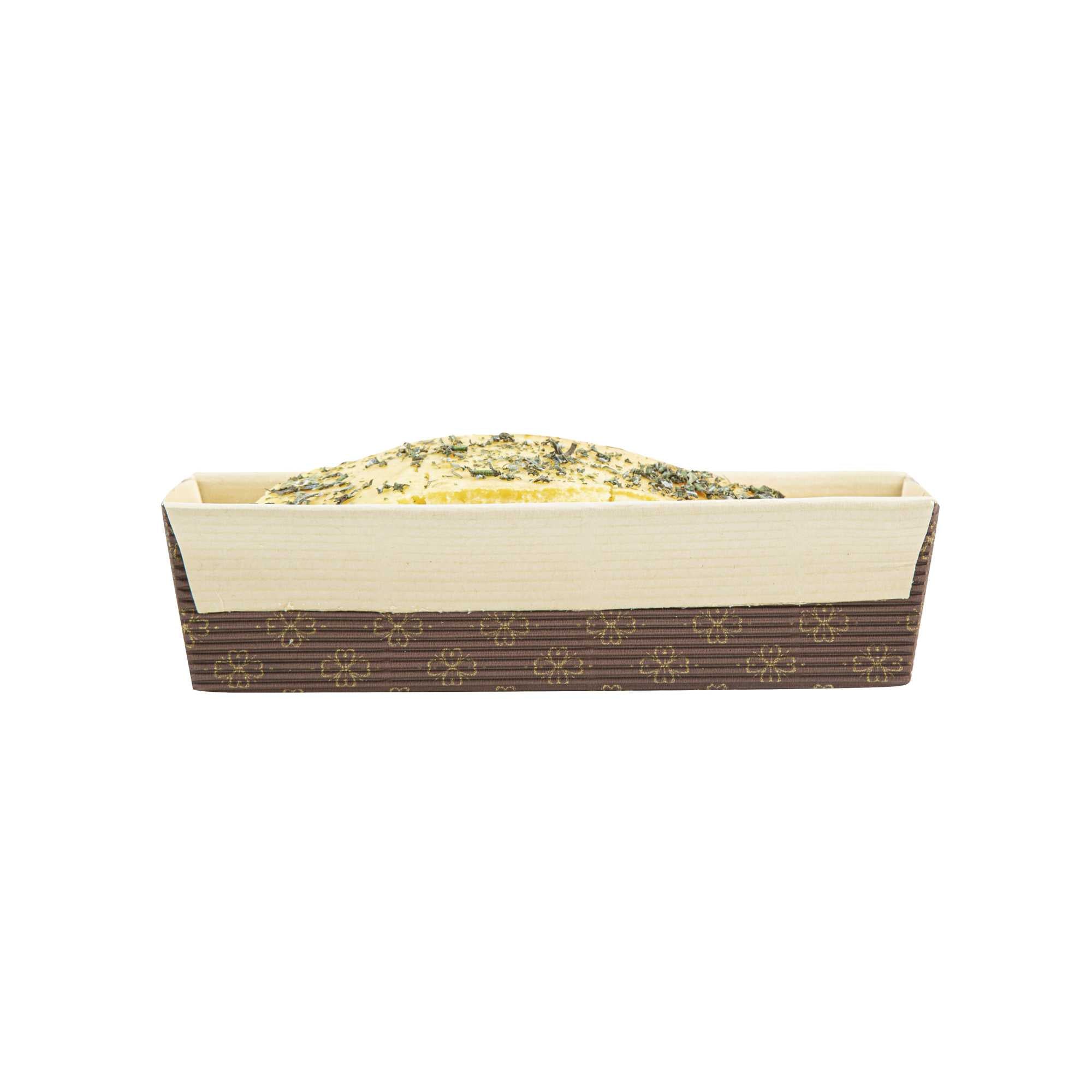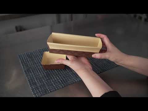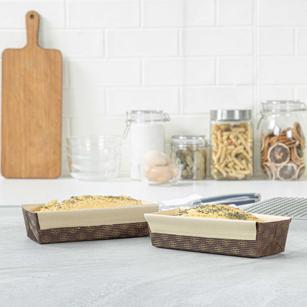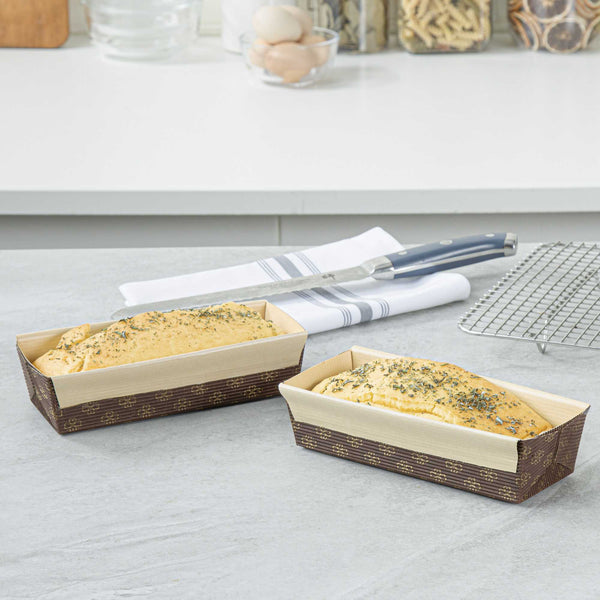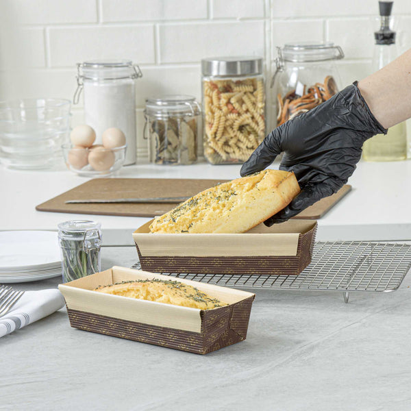 Serve your baked goods in style with our 18-ounce Panificio Kraft Paper Baking Loaf Pans. Featuring a greaseproof coating, these paper loaf pans prevent unwanted messes and ensure your banana cakes always look their best. The rippled exterior is dipped in a chocolate brown color to make your loaves all the more appetizing. Made with corrugated kraft paper, these baking loaf pans have a freestanding design to preserve the shape and look of your loaves in and out of the oven. These sturdy disposable loaf pans are equipped with reinforced edges that make handling and transporting your baked goods simple. Conveniently oven-safe up to 460F, these loaf pans can contain up to 18 ounces and measure 7.75 inches in length by 3.25 inches in width and 2 inches in height. Sold in a 10 count box.