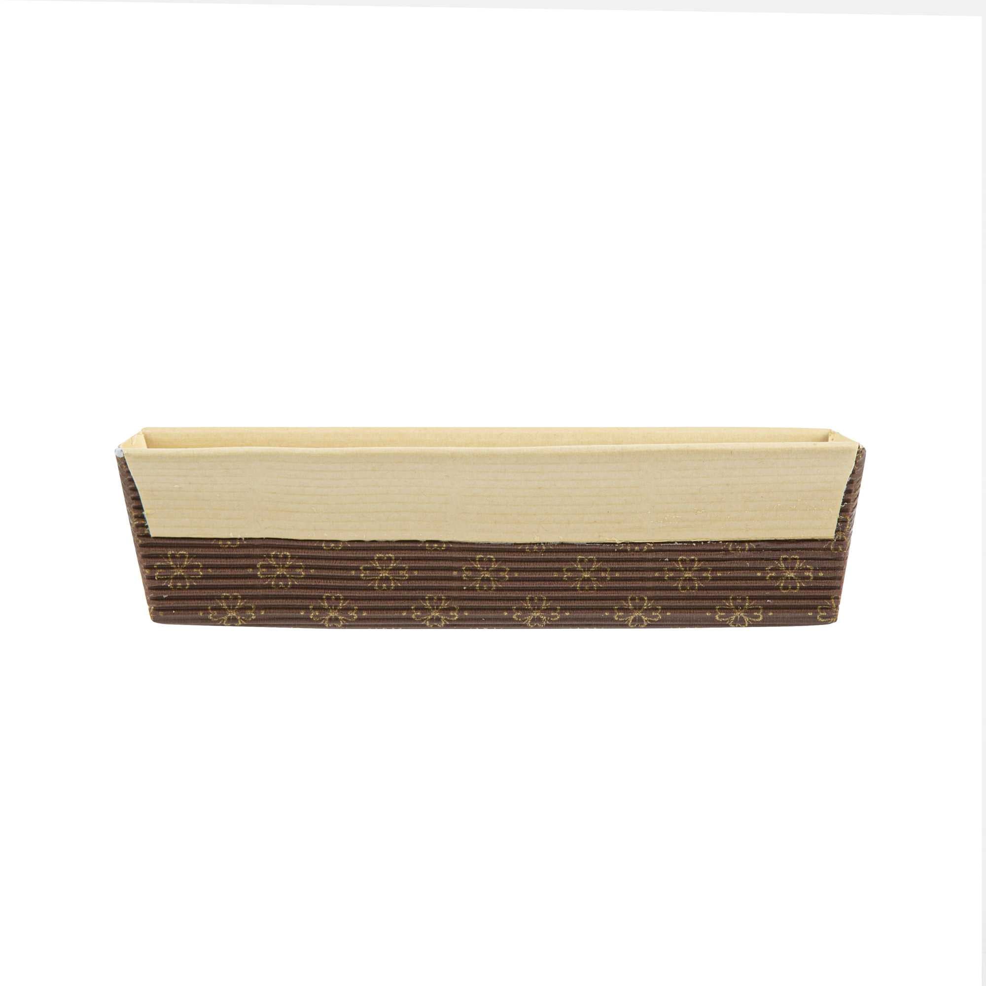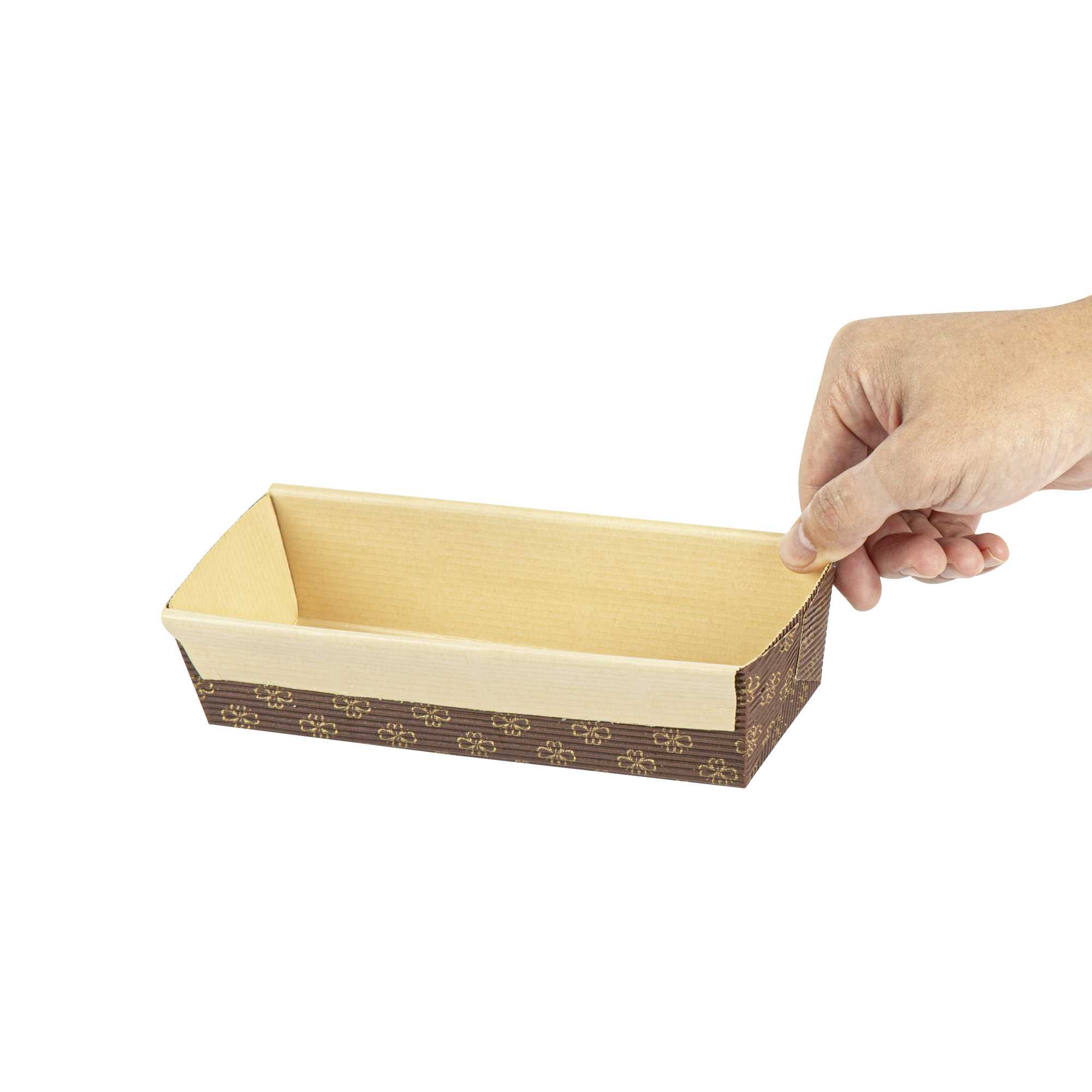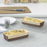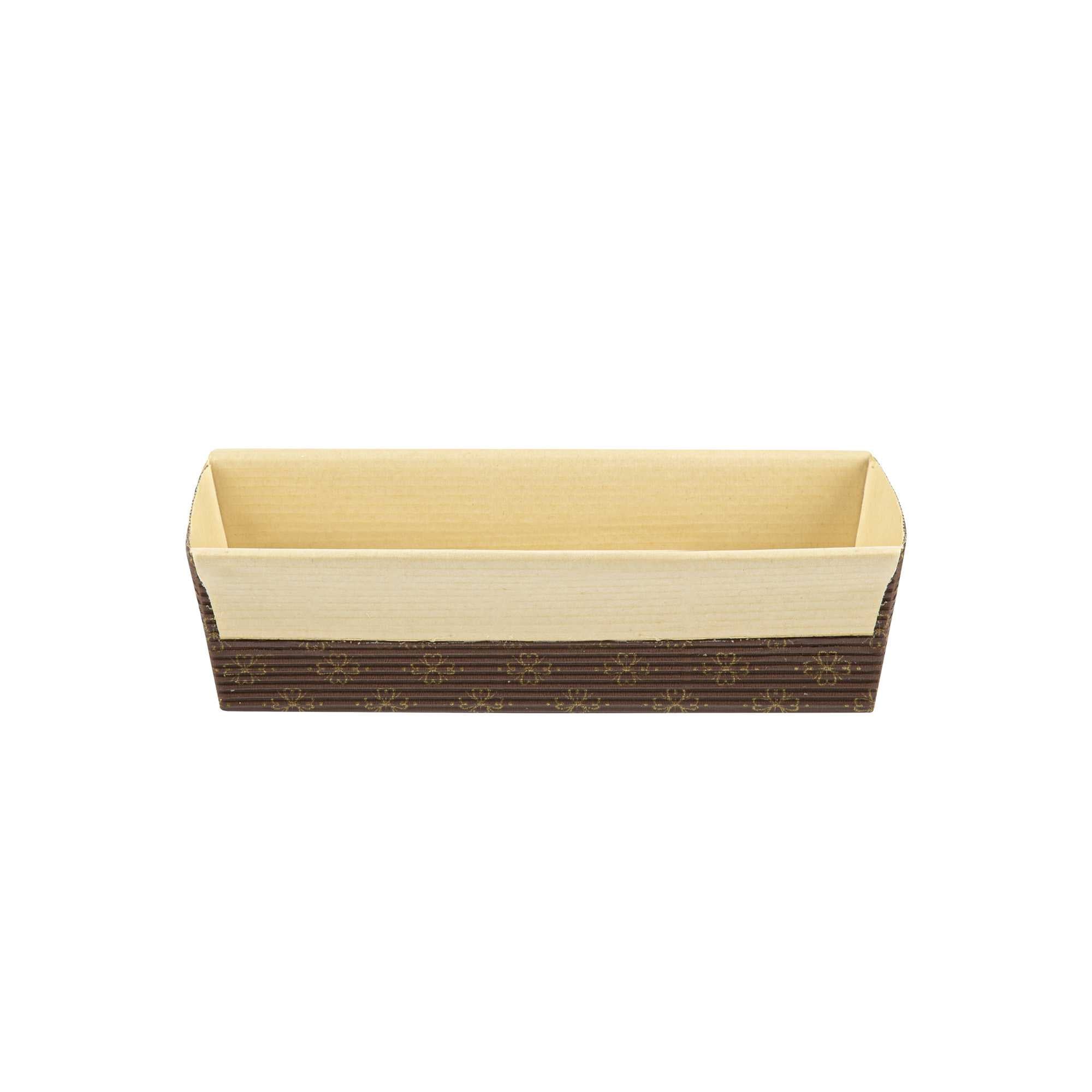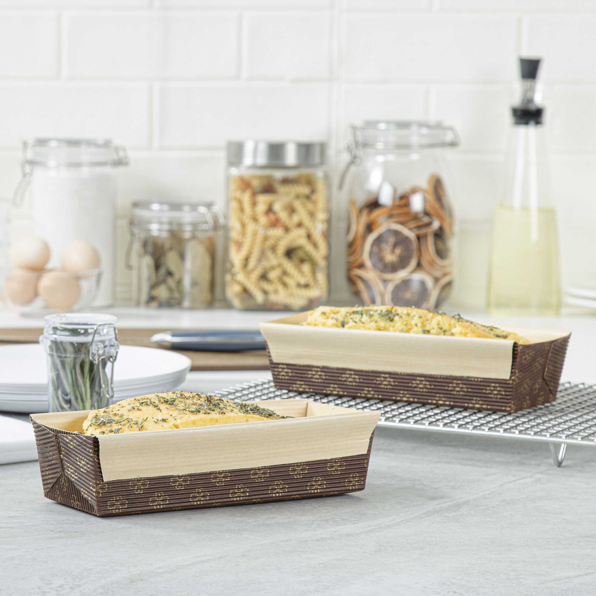 Serve your baked goods in style with our 18-ounce Panificio Kraft Paper Baking Loaf Pans. Featuring a greaseproof coating, these paper loaf pans prevent unwanted messes and ensure your banana cakes always look their best. The rippled exterior is dipped in a chocolate brown color to make your loaves all the more appetizing. Made with corrugated kraft paper, these baking loaf pans have a freestanding design to preserve the shape and look of your loaves in and out of the oven. These sturdy disposable loaf pans are equipped with reinforced edges that make handling and transporting your baked goods simple. Conveniently oven-safe up to 460F, these loaf pans can contain up to 18 ounces and measure 7.75 inches in length by 3.25 inches in width and 2 inches in height. Sold in a 10 count box.