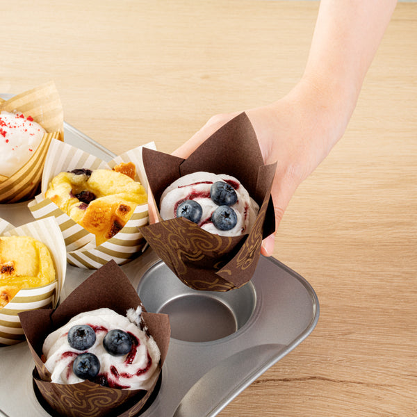 Showcase your culinary creations with elegance and precision. Panificio Greaseproof Tulip Baking Cups feature a greaseproof coating that ensures easy removal of treats, allowing you to present your cupcakes without any residue. These tulip baking cups are made from heavy-duty paper that maintains its shape during baking, even in demanding oven conditions, providing reliable support for your delectable desserts. The tulip design beautifully enhances dessert presentation, making it ideal for eye-catching displays at events or in bakery showcases. With a 3.35-inch length and 3.5-ounce capacity, these greaseproof cupcake liners fit standard baking trays, ensuring consistent and efficient production. Made from recyclable paper, these oven-safe cupcake wrappers offer an environmentally friendly option for bakers who prioritize sustainability. Enhance your dessert presentation with these versatile and practical cupcake liners. Sold in a 50 count box.