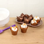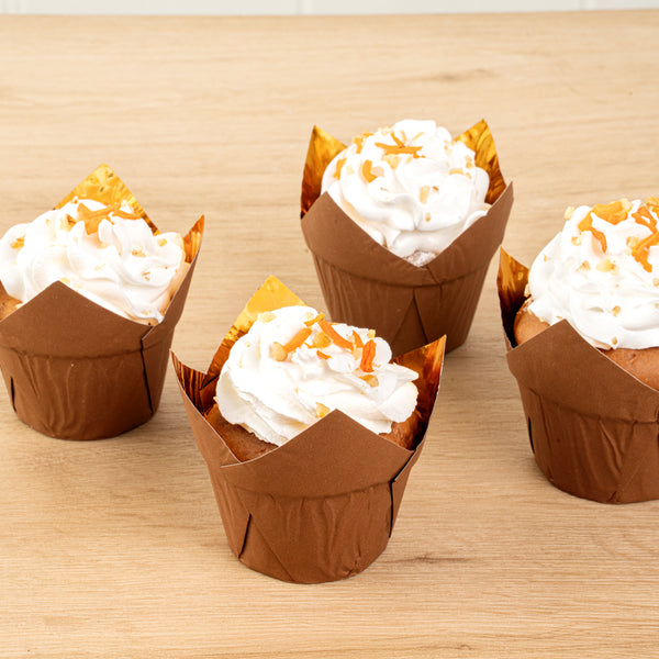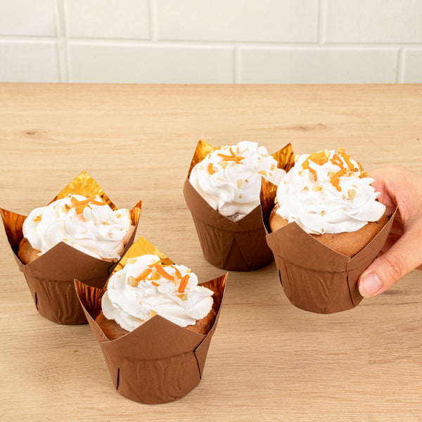 Ensure flawless presentations with Panificio Brown Tulip Cupcake Liners. These tulip cupcake liners feature a greaseproof coating that ensures easy removal and quick cleanup, allowing your kitchen staff to maintain efficiency and focus on creativity. Designed to beautifully showcase pastries and cupcakes, their tulip shape enhances the visual appeal of your baked goods, making them ideal baking cups for weddings or upscale events. Constructed from heavy-duty foil paper, these liners hold their shape in the oven, ensuring consistent baking results and maintaining a height of 2.75 inches. Elevate the presentation and performance of your desserts with these greaseproof muffin wrappers that combine functionality with elegance. Each order includes 50 Panificio Brown Tulip Cupcake Liners.