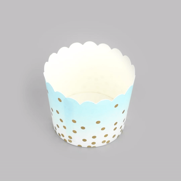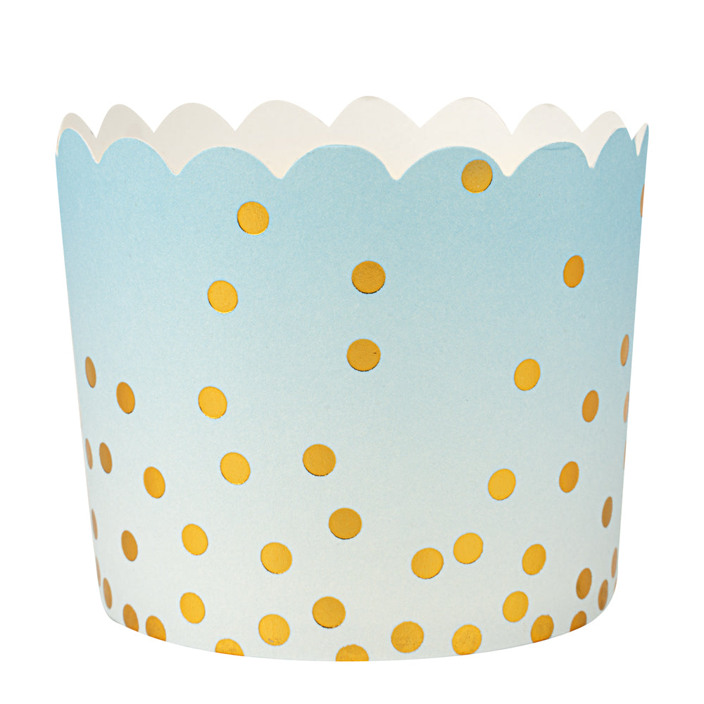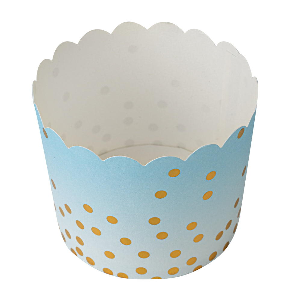 4.5 OZ BLUE PAPER SCALLOPED BAKING CUP - GOLD POLKA DOTS