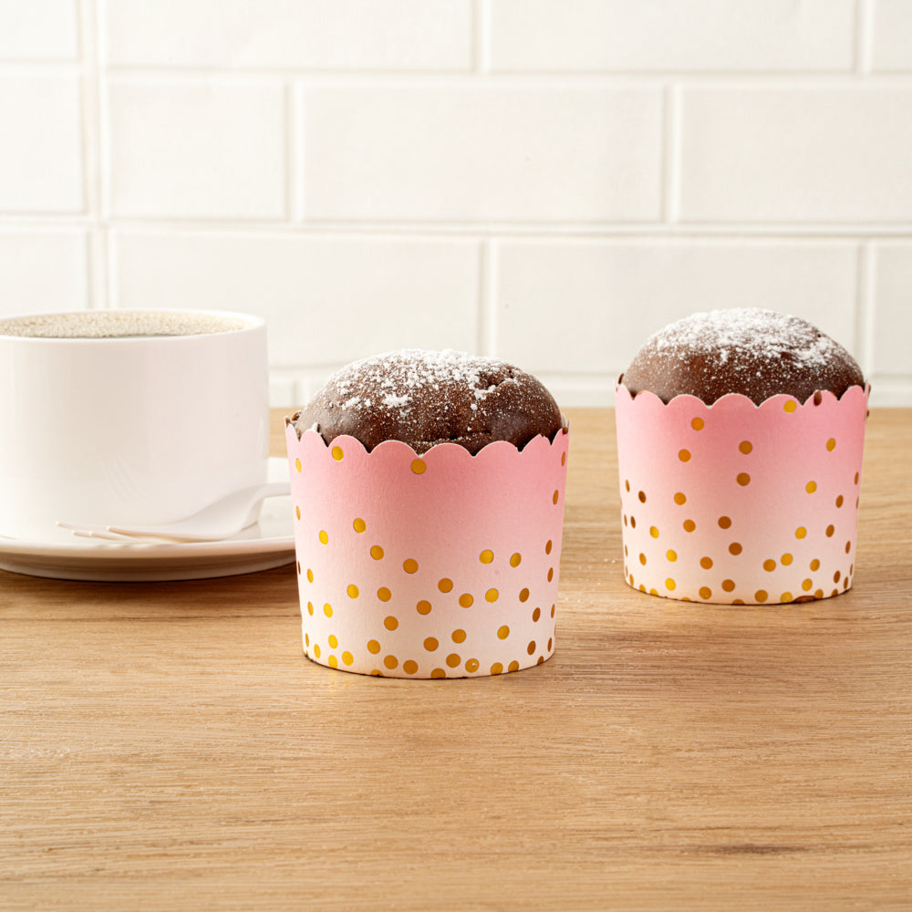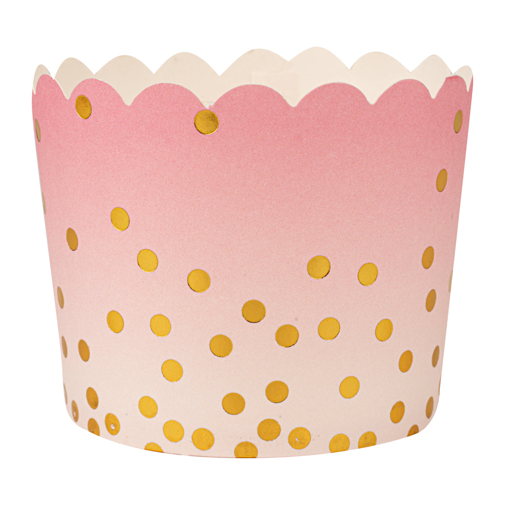 4.5 OZ PINK PAPER SCALLOPED BAKING CUP - GOLD POLKA DOTS