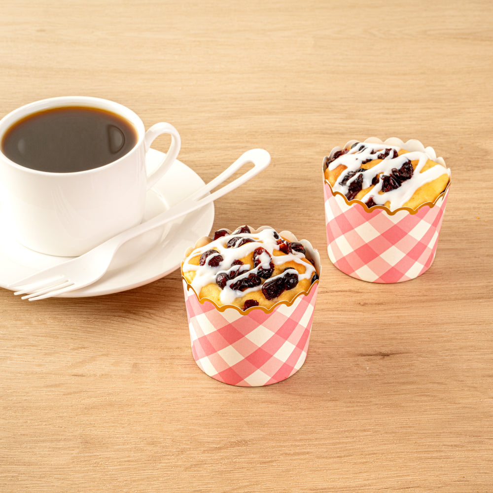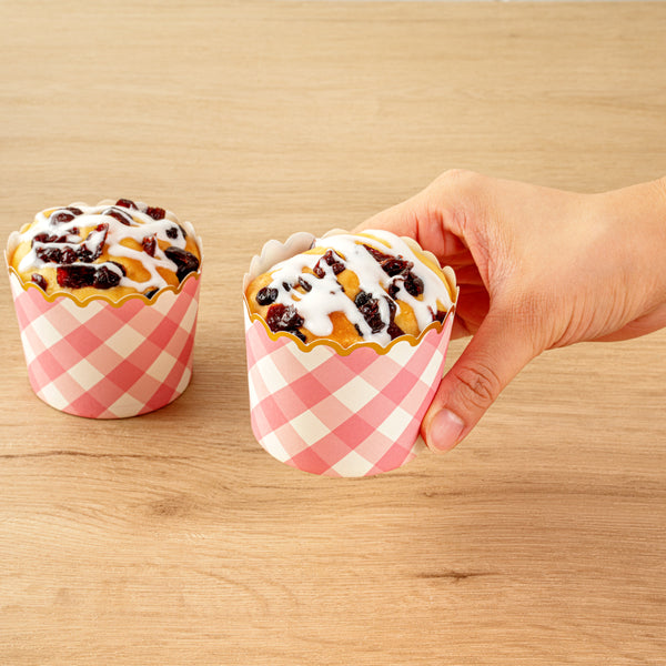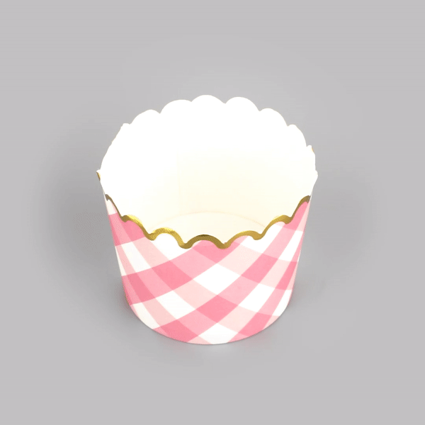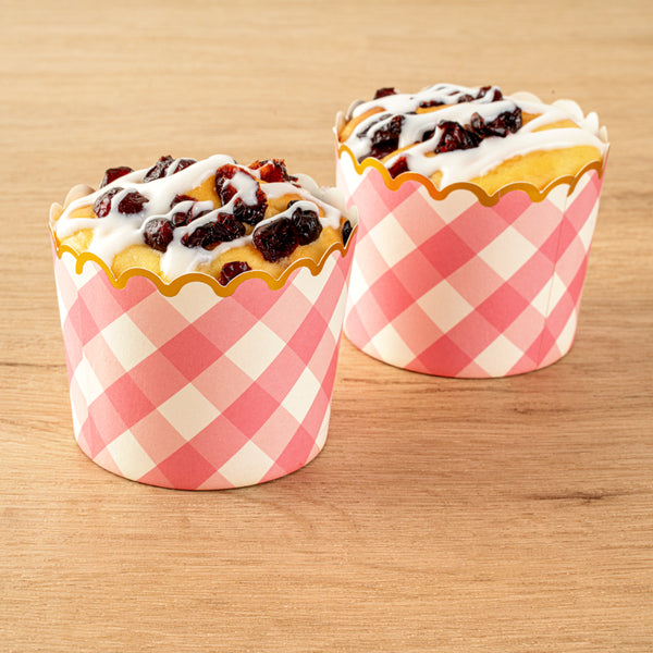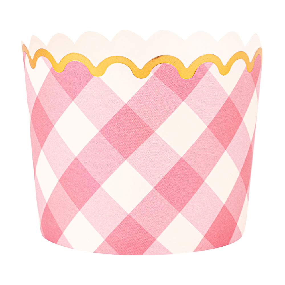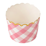 4.5 OZ PINK PLAID PAPER SCALLOPED BAKING CUP - GOLD RIM