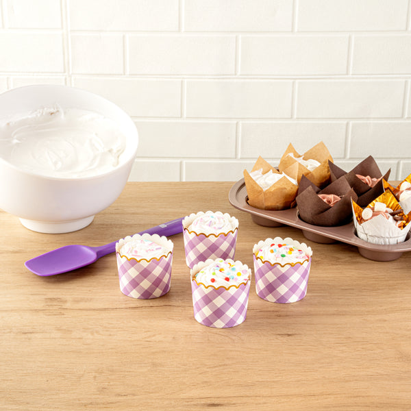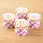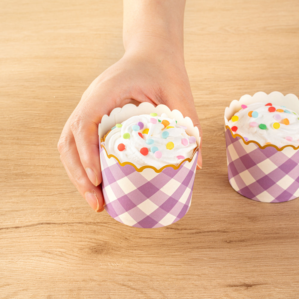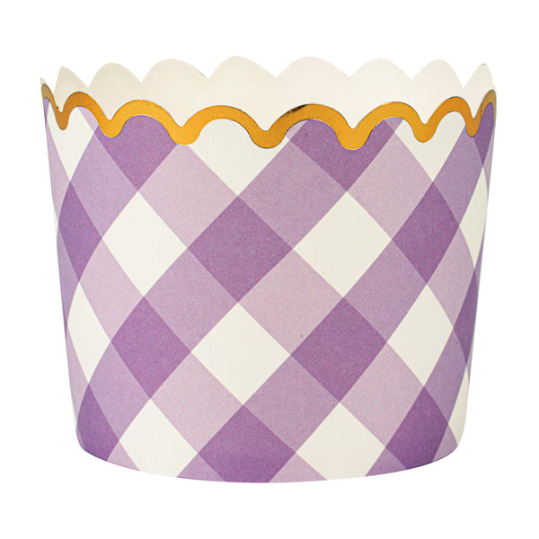 4.5 OZ PURPLE PLAID PAPER SCALLOPED BAKING CUP - GOLD RIM