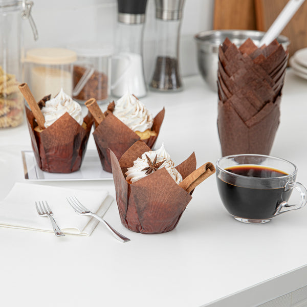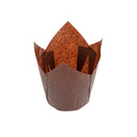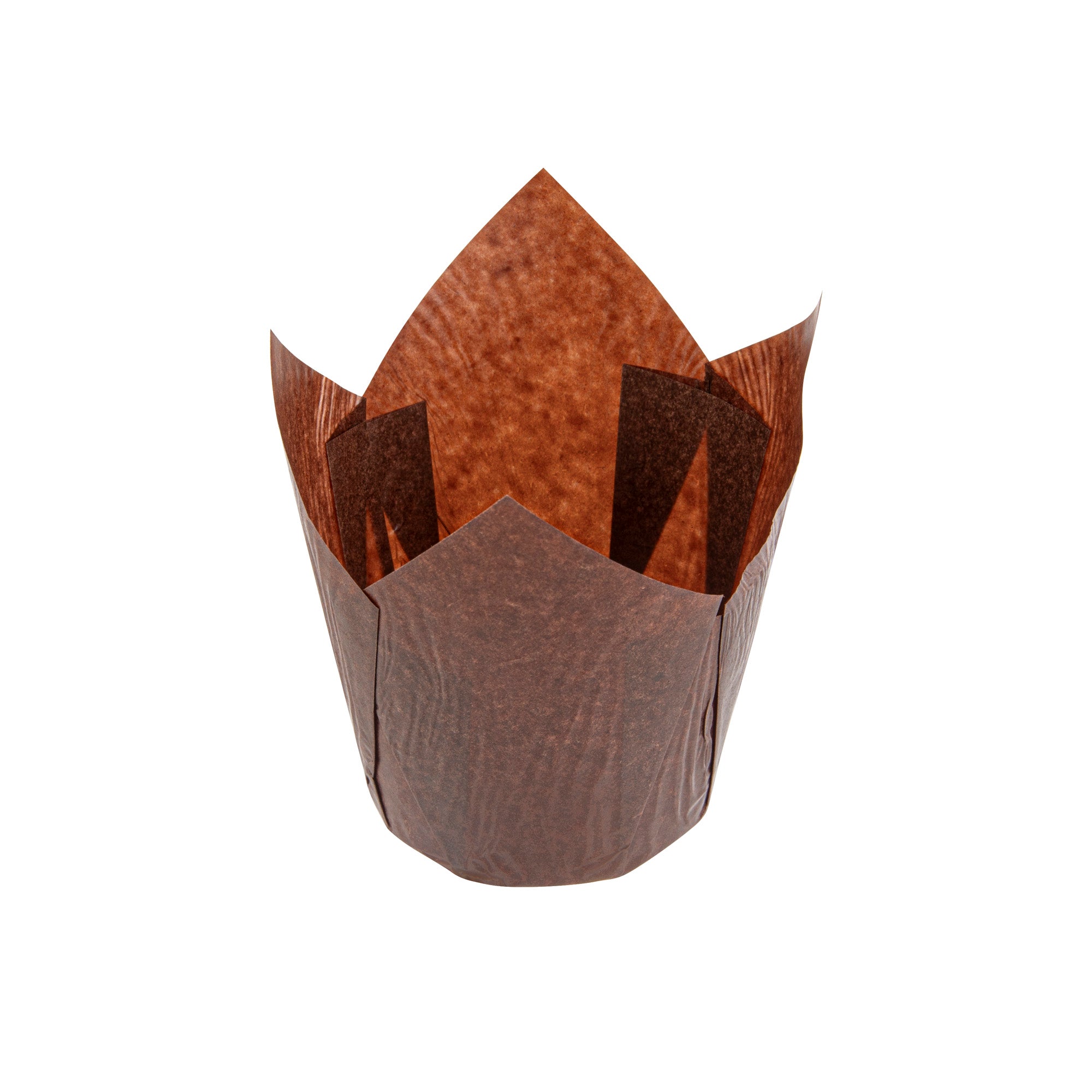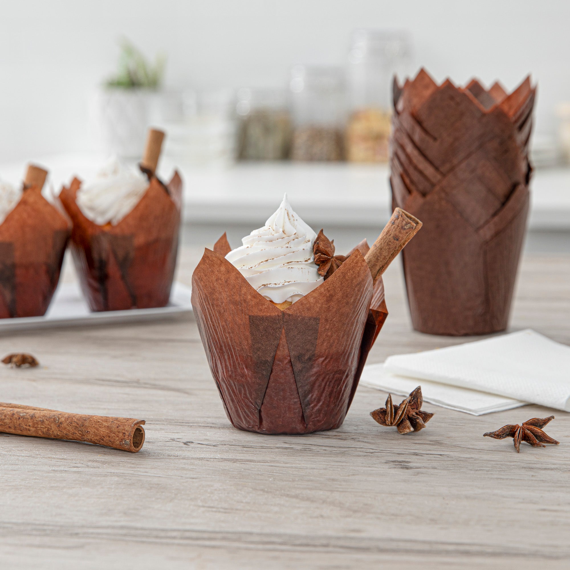 Add a charming touch to sweet treats with our Panificio 4-ounce Brown Paper Tulip Baking Cups. Featuring a vivid cocoa brown finish and tulip design, these beautiful cupcake wrappers effortlessly complete the look of baked goods from your cafe, bakery, catering event, or other foodservice establishment. With a greaseproof lining, these 4-ounce brown cupcake liners keep your treats looking fresh and provide a mess-free way to enjoy delicious desserts. These oven-safe paper cupcake cups are recyclable and can endure hot temperatures up to 425F. Use these paper baking cups to stylishly serve chocolate cupcakes at a bakery or to elegantly display caramel apples at a dessert buffet. Measuring 3.5 inches wide, these greaseproof cupcake wrappers are shipped in a 200 count box.
