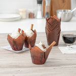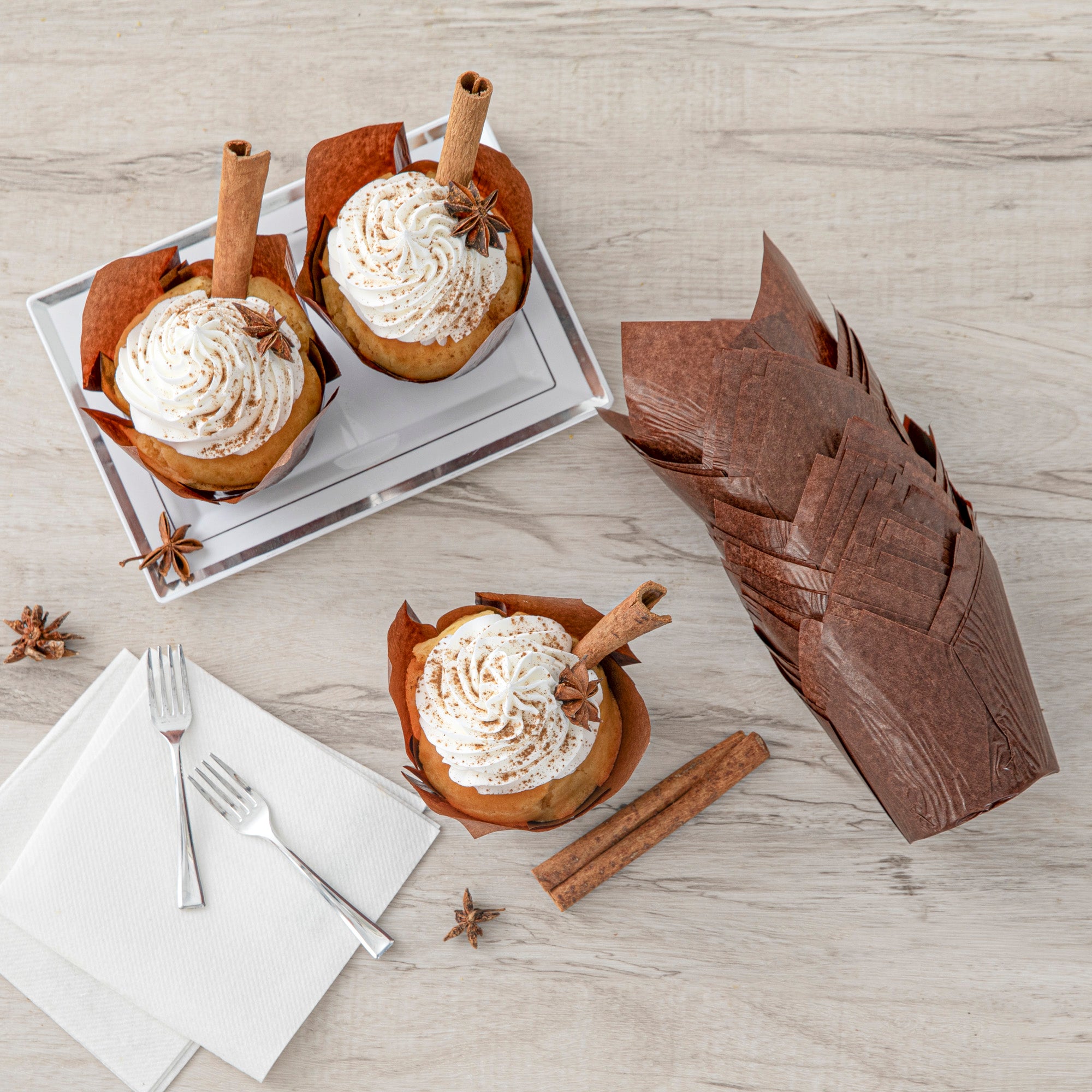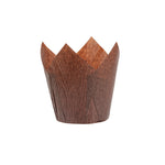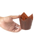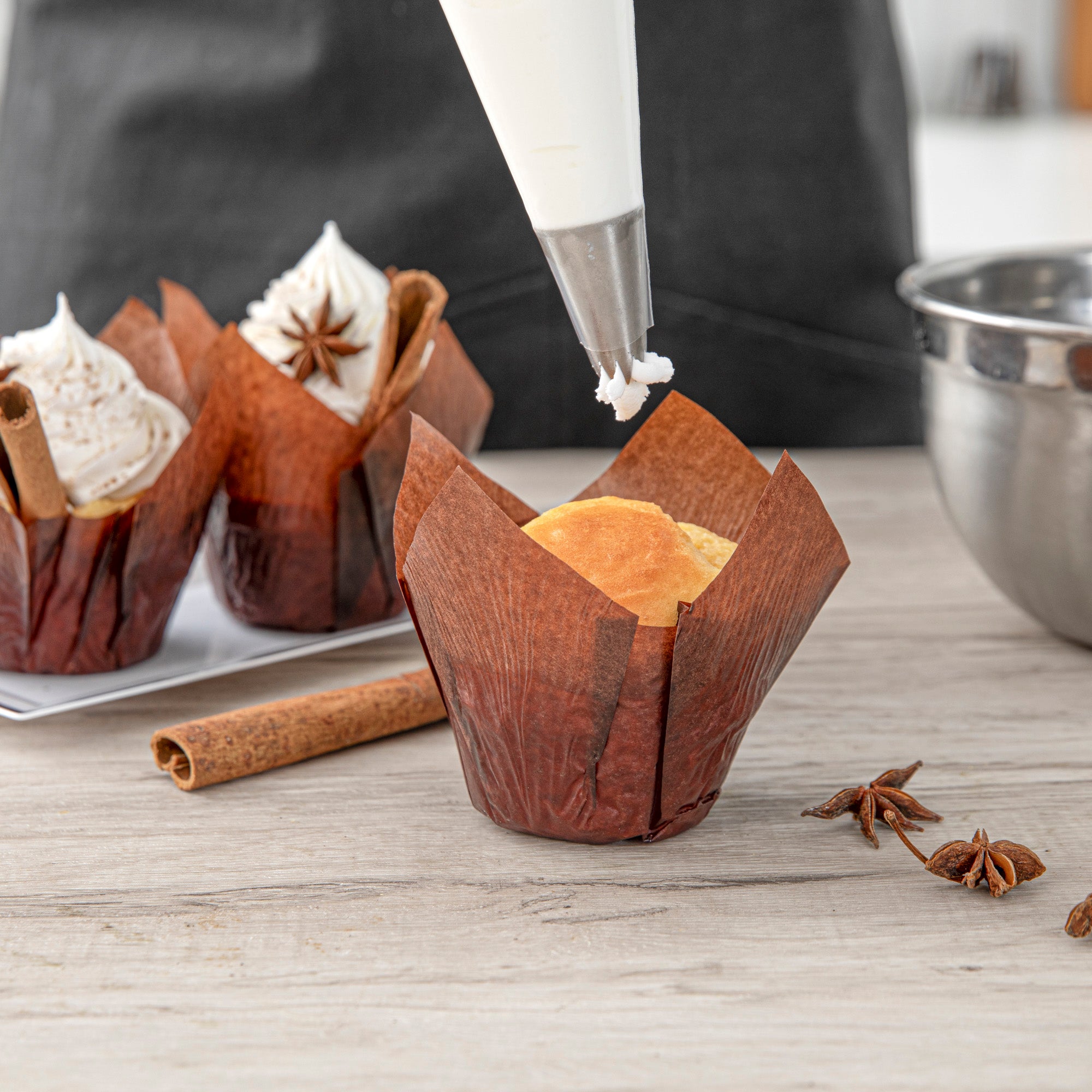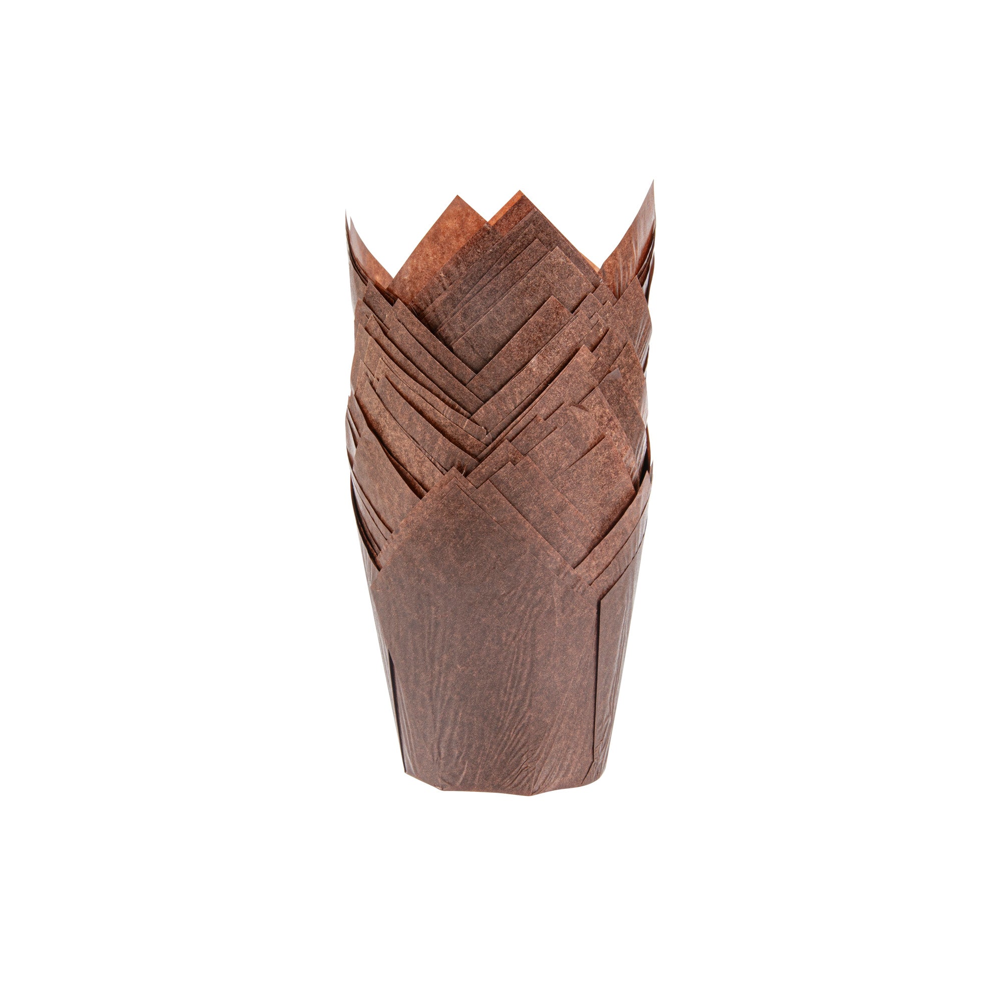 Add a charming touch to sweet treats with our Panificio 4-ounce Brown Paper Tulip Baking Cups. Featuring a vivid cocoa brown finish and tulip design, these beautiful cupcake wrappers effortlessly complete the look of baked goods from your cafe, bakery, catering event, or other foodservice establishment. With a greaseproof lining, these 4-ounce brown cupcake liners keep your treats looking fresh and provide a mess-free way to enjoy delicious desserts. These oven-safe paper cupcake cups are recyclable and can endure hot temperatures up to 425F. Use these paper baking cups to stylishly serve chocolate cupcakes at a bakery or to elegantly display caramel apples at a dessert buffet. Measuring 3.5 inches wide, these greaseproof cupcake wrappers are shipped in a 200 count box.