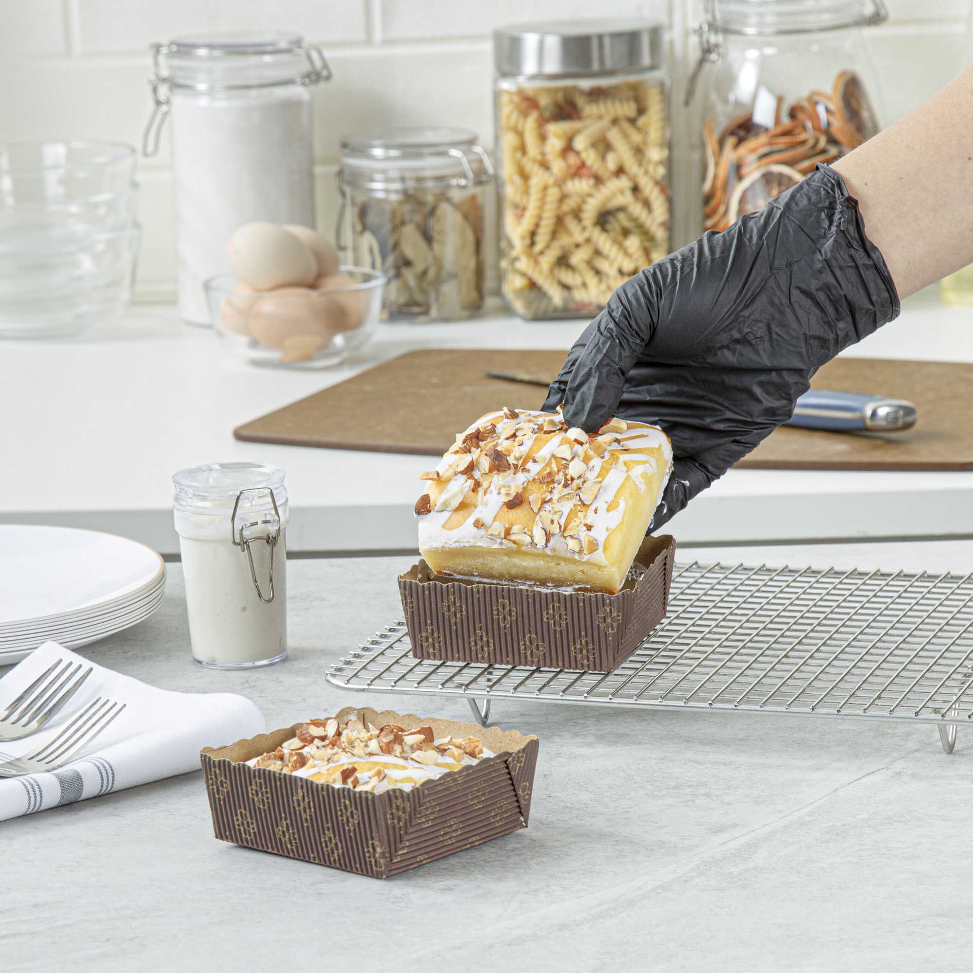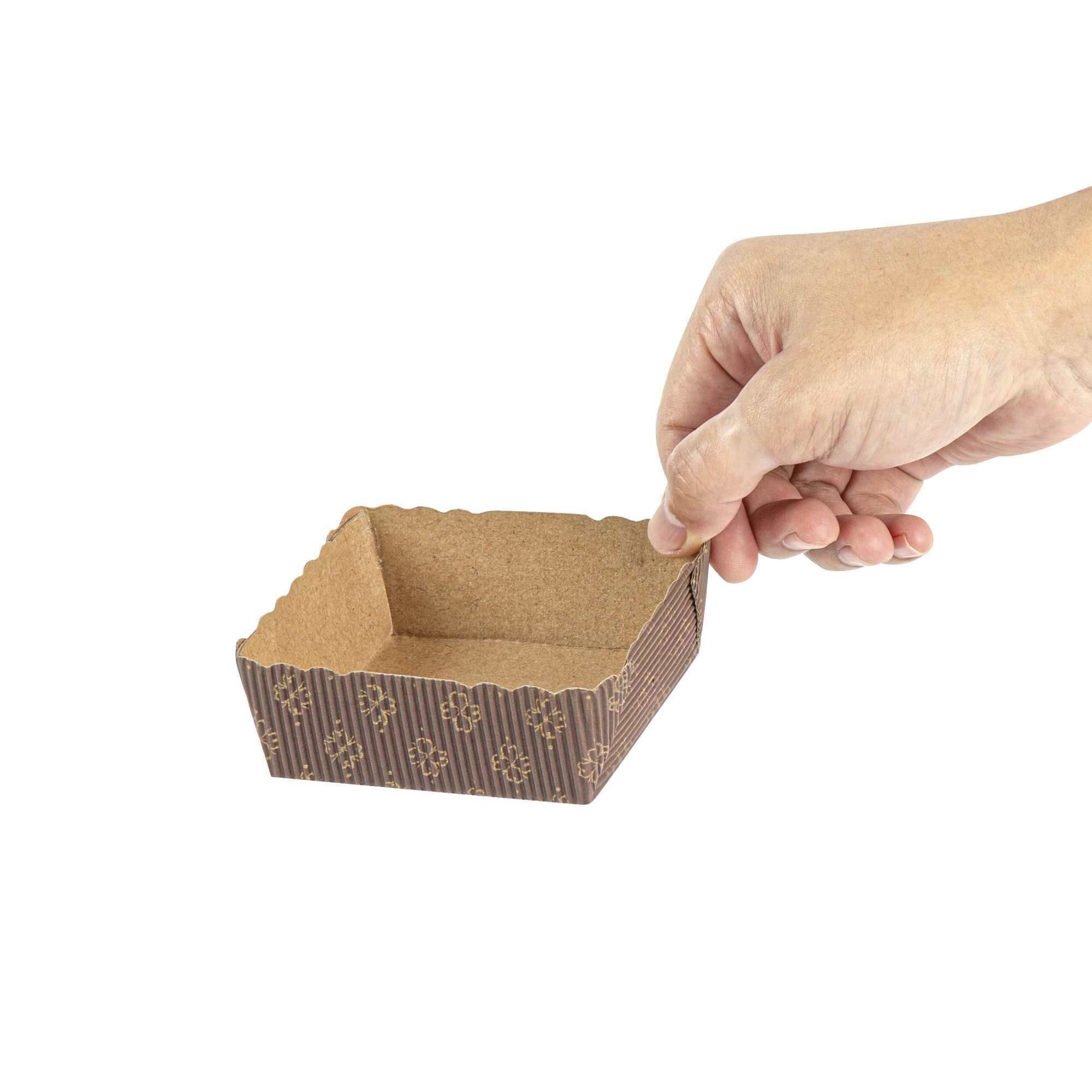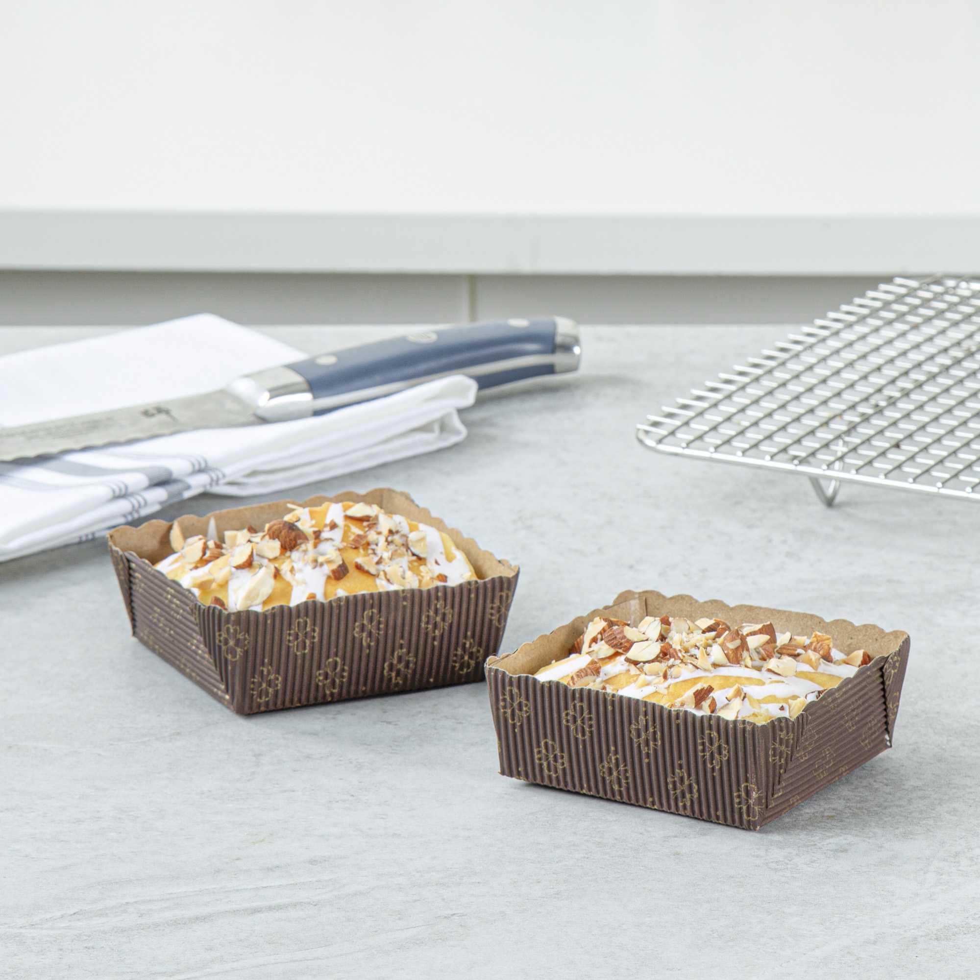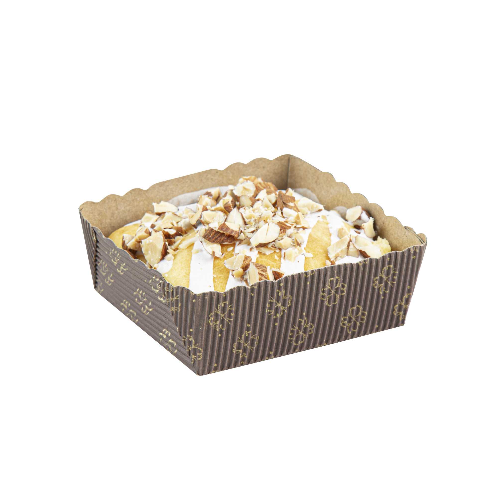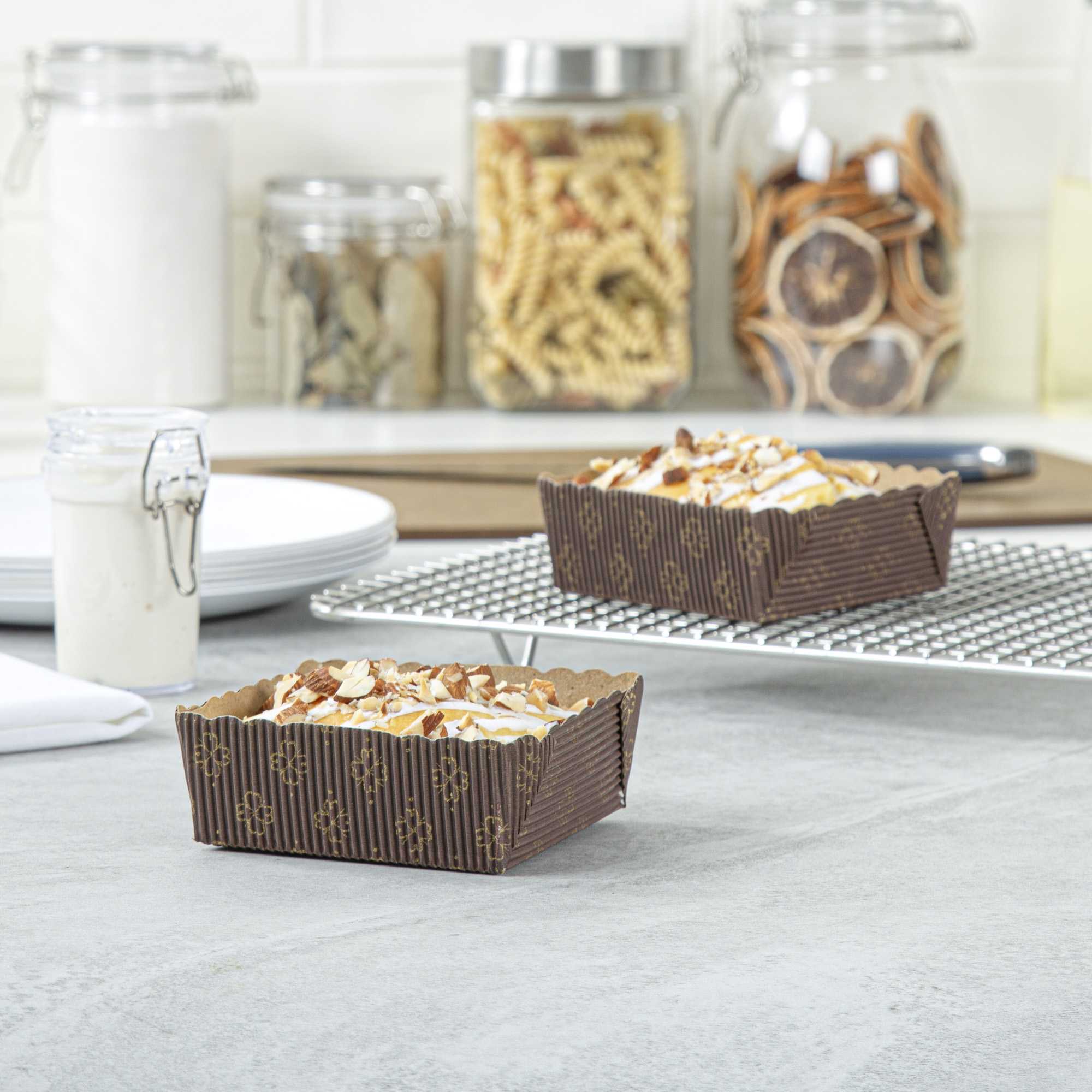 Upgrade your baking pans with our Panificio 4-ounce Kraft Paper Square Baking Cups. These baking pans have a sturdy and freestanding design that enables them to easily stand up to heavy cake batters. The grease-resistant interior lining of the disposable baking cups helps the bread to not stick to the pan. Made of corrugated kraft paper, these baking cups are conveniently oven-safe up to 460F. These paper baking cups make it easy to dispose of after baking and serving your delicious brownies. With a coffee brown color, these paper baking cups are perfect for giving your cupcakes and muffins an air of sophistication. Measuring 3 inches in length by 2.75 inches in width by 1.75 inches in height, your desserts will retain the stylish cubic shape provided by our square paper baking cups. These kraft paper baking cups can contain up to 4 ounces. Sold in a 100 count box.
