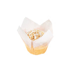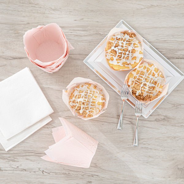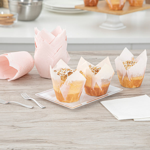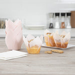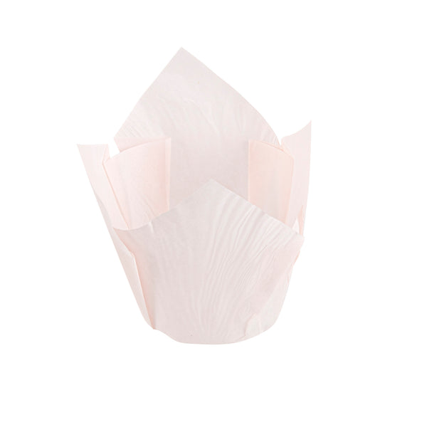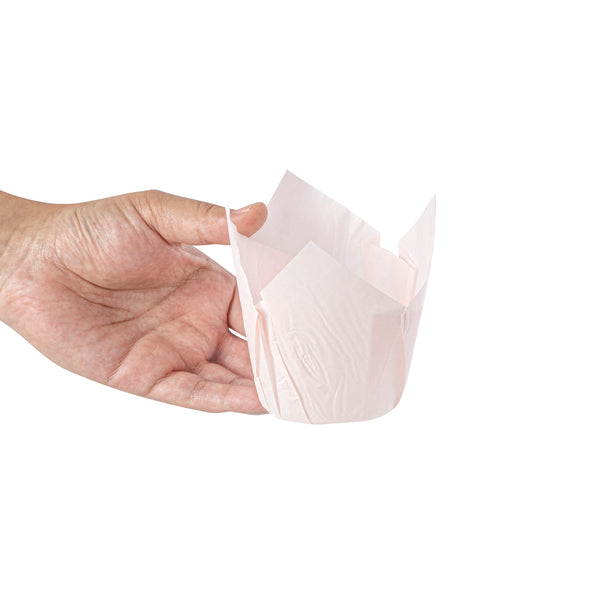 Add a stylish touch to your baked goods using our Panificio 4-ounce Pink Paper Tulip Baking Cups. Featuring a premium paper construction and petal pink finish, these tulip cupcake liners add an elegant touch to cupcakes, muffins, and other personal-sized desserts. Their four-pointed petal design beautifully frames your sweets, while their interior grease-resistant coating prevents oily batters or buttery frostings from leaking through. Conveniently freezer-safe and oven-safe up to 425°F, these pink cupcake liners are a great way to prepare and serve all types of chilled or warm treats. Each of these paper cupcake liners can hold up to 4 ounces and measures 3.5 inches in diameter. These pink tulip cupcake liners are sold in a 200 count box.