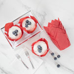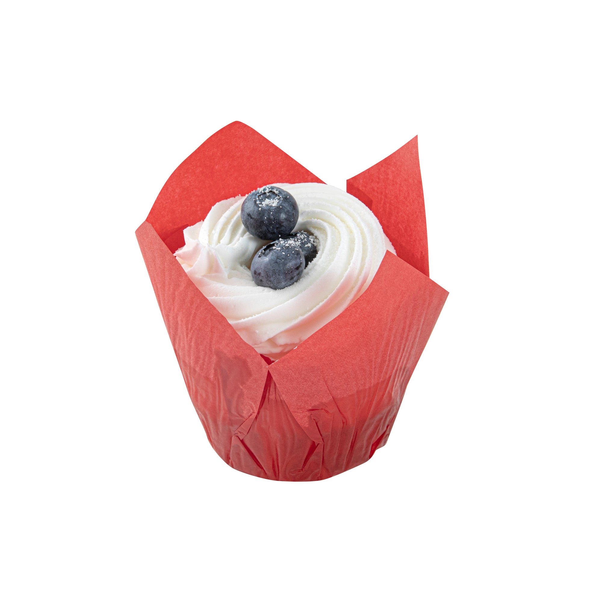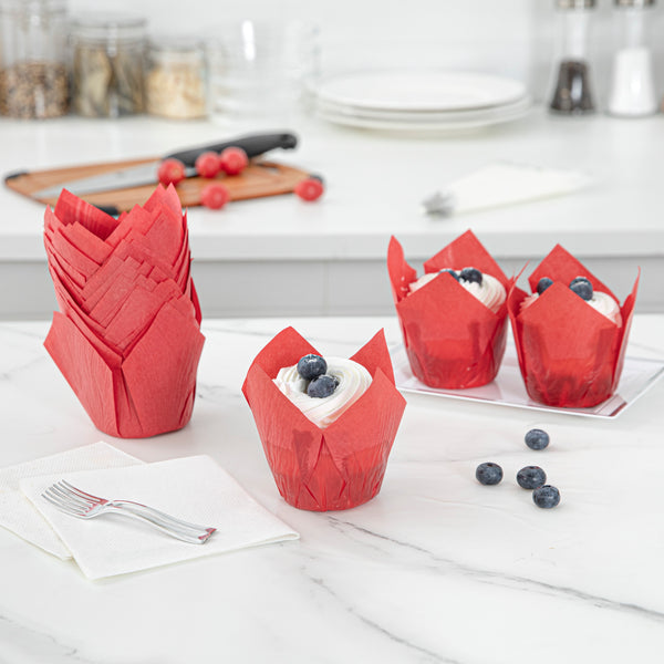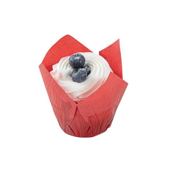 Bring some added style to your dessert displays with these Panificio 4-ounce Red Paper Tulip Baking Cups! Combining a bright red finish with a unique four-petaled design, these paper baking cups are an eye-catching way to bake and serve all types of treats. Conveniently freezer-safe and oven-safe up to 425°F, these versatile cupcake liners are perfect for preparing and storing cupcakes, muffins, crab cakes, and other dishes. Featuring a grease-resistant design, these tulip muffin papers help to lock in moisture while reducing the risk of grease stains and messes. These bright red cupcake liners can contain up to 4 ounces of cupcake or muffin batter and measure 3.5 inches in diameter. Sold in a 200 count box.