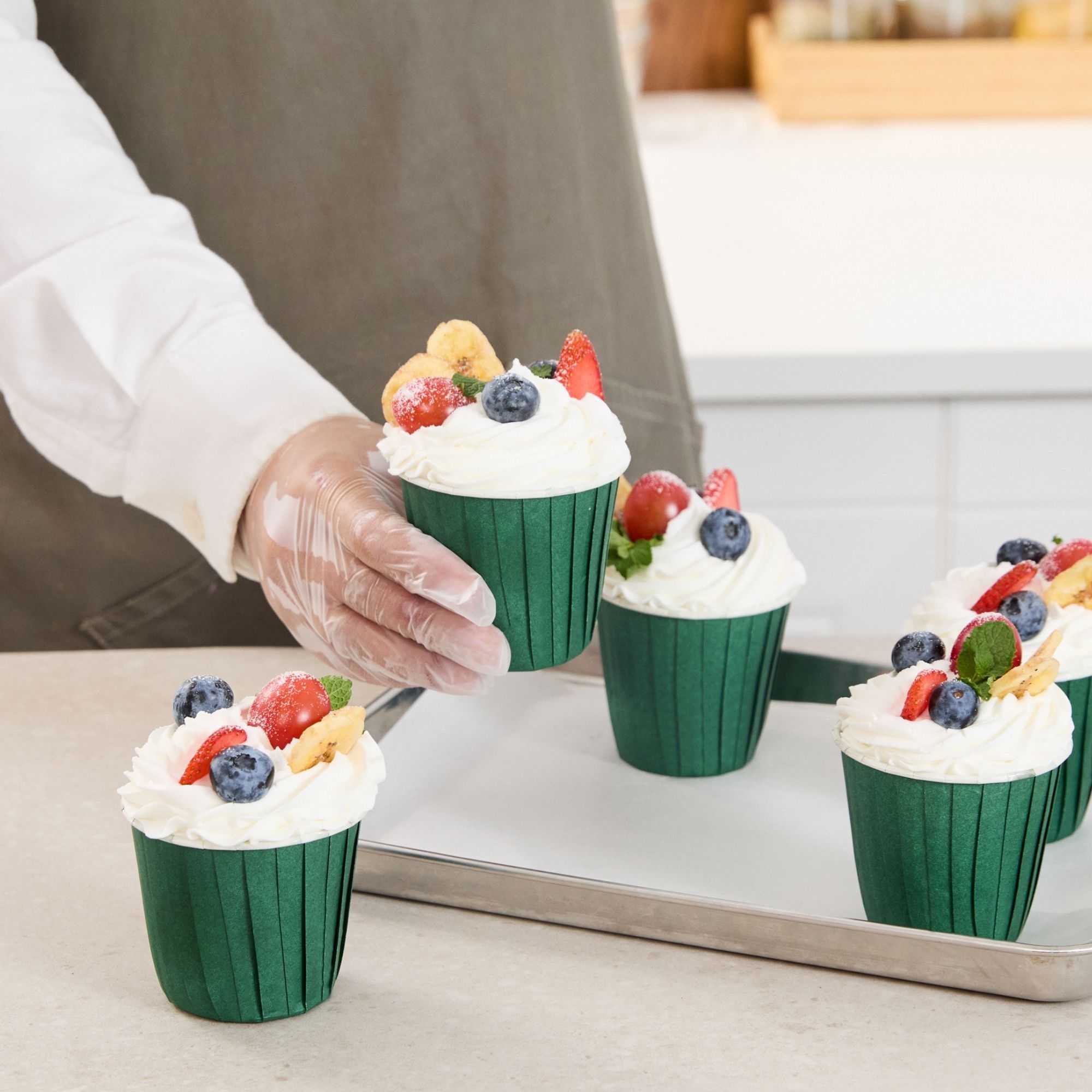 Enhance your baking presentation with grease-resistant elegance. The Panificio Grease-Resistant Baking Cup's pleated design beautifully accentuates your baked delights, making them the star of any display. Crafted from heavyweight paper, these green baking cups are engineered to withstand oven temperatures up to 425 degrees Fahrenheit, ensuring your creations bake perfectly every time. The grease-resistant coating of each cupcake liner guarantees an easy release of treats, keeping your presentations pristine and professional. With a capacity of 3.5 ounces and measuring 3 inches in length, 3 inches in width, and 2.75 inches in height, these muffin liners provide ample room for your culinary creations. Ideal for bakeries and cafes, these disposable, oven-safe, and freezer-safe liners simplify cleanup and enhance operational efficiency. Reinforce your brand's quality and appeal with these reliable baking cups. Each order includes 200 Panificio Grease-Resistant Baking Cups.