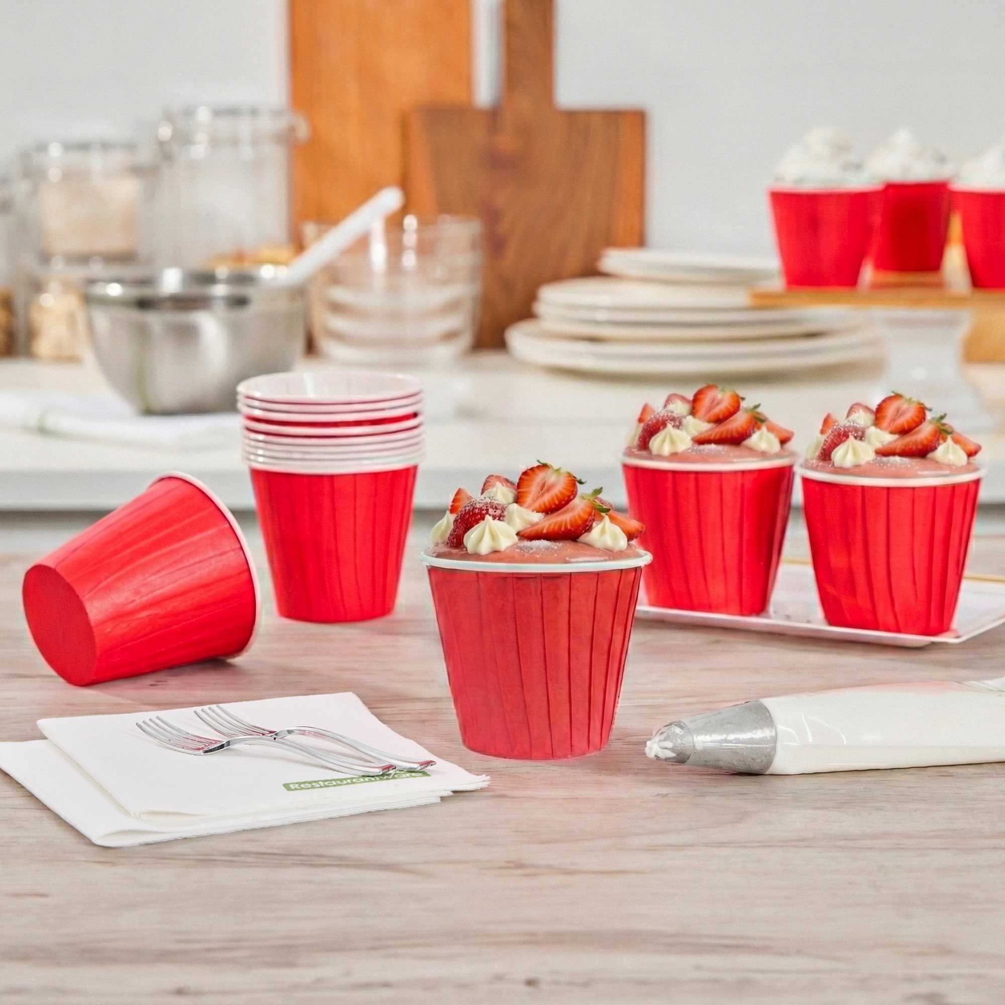 Enhance your bakery's presentation with elegant and functional liners. Panificio Grease-Resistant Paper Muffin Liners feature a grease-resistant coating that ensures easy release of treats, preventing any sticking during serving. Made from heavyweight paper, these non-stick baking cups withstand high oven temperatures up to 425 degrees Fahrenheit, making them ideal for high-volume baking environments. The pleated design of these tall cupcake liners accentuates your baked delights, adding visual appeal that impresses customers and elevates your offerings. With a height of 2.75 inches, these liners provide ample space for your delicious muffins and cupcakes, while their vibrant red color enhances the display. Perfect for bakeries and cafes, these disposable liners streamline operations while maintaining professional standards. Each order includes 200 Panificio Grease-Resistant Paper Muffin Liners.
