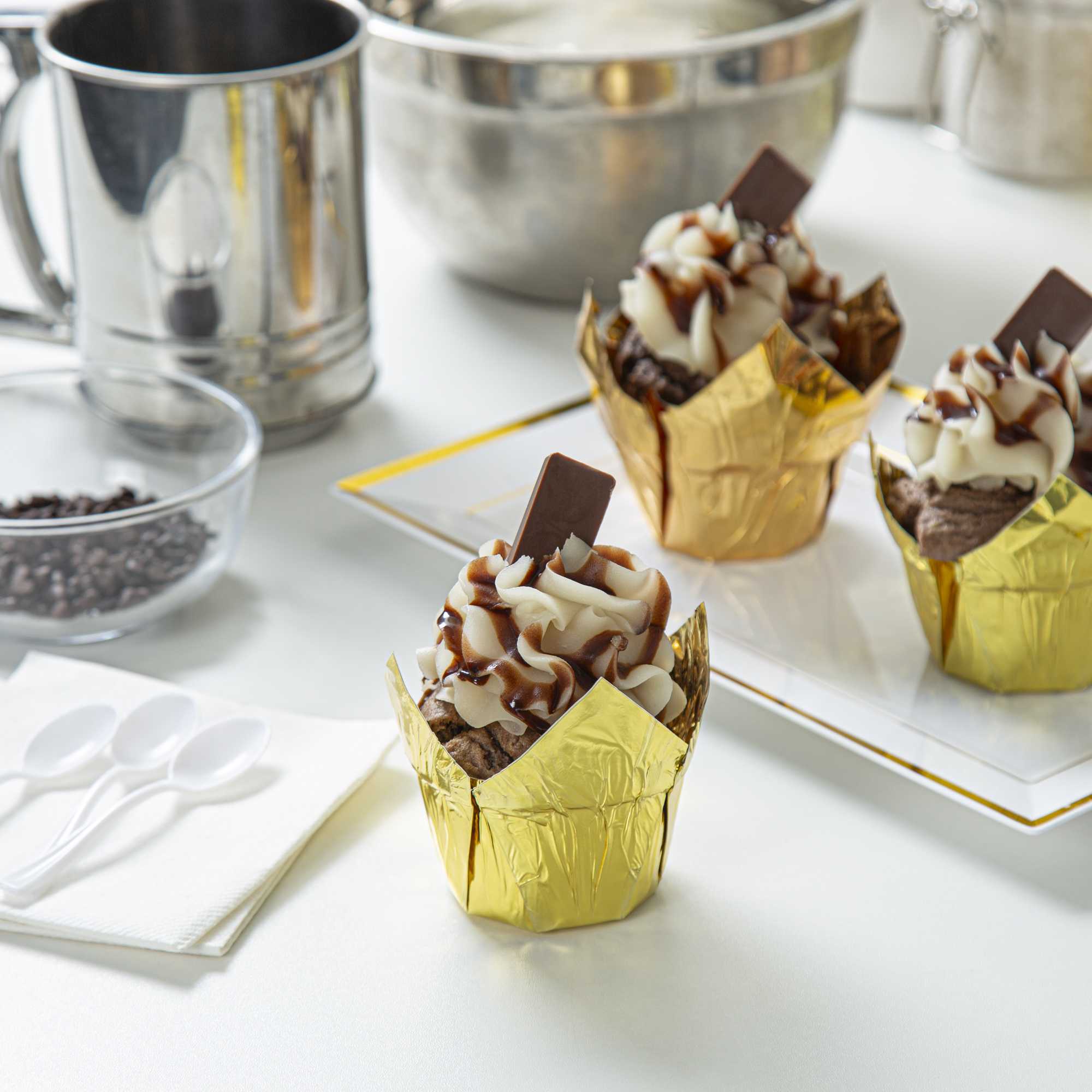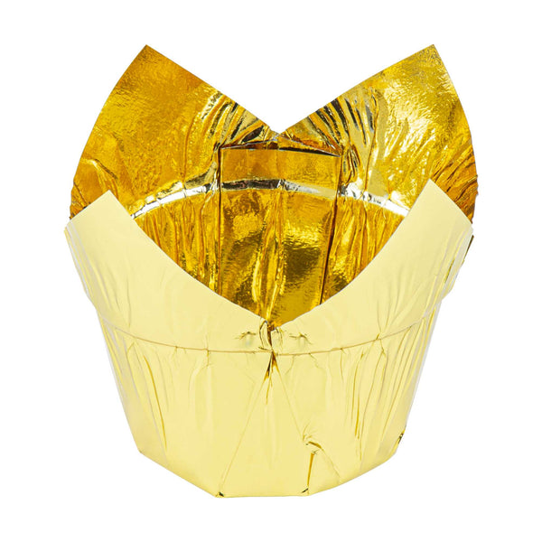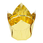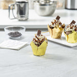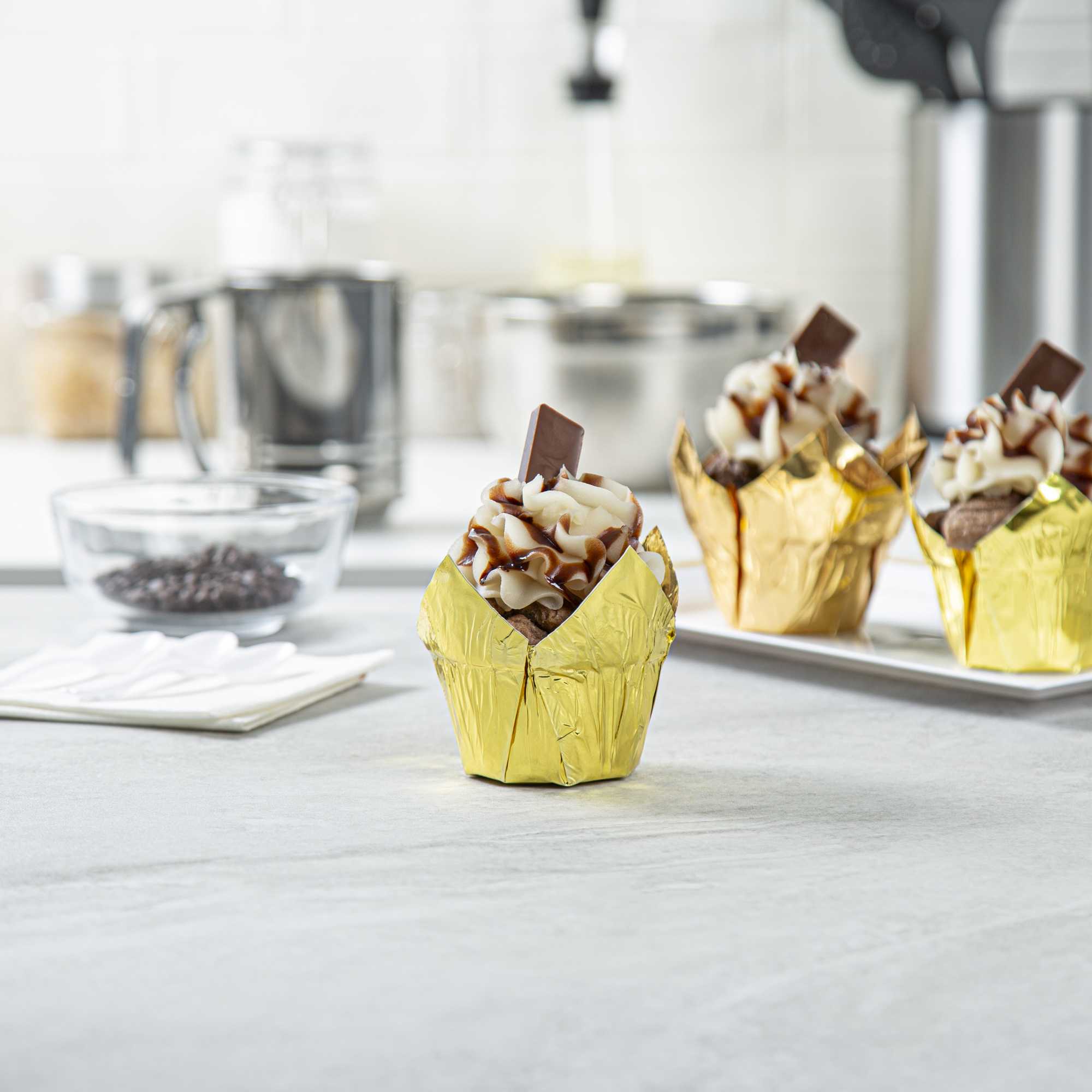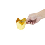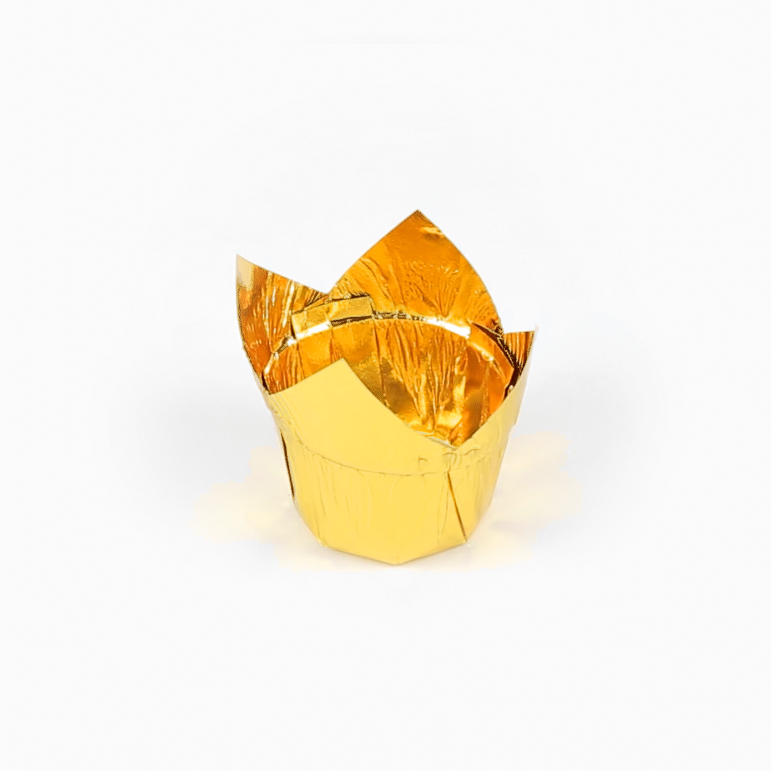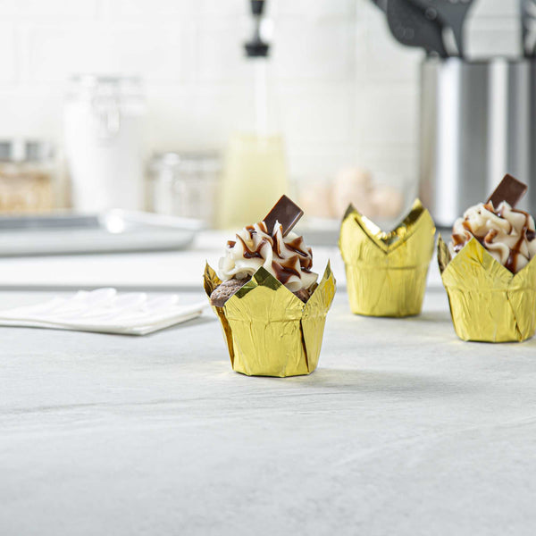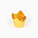 Give your sweet treats some glitz and glamour with our Panificio 4-ounce Tulip Rose Gold Paper Regular Baking Cups. Featuring a four-pointed tulip design, these baking cups beautifully frame miniature cupcakes and bite-sized desserts. The impermeable-to-grease construction of these cupcake liners avoids unsightly messes and grease splotches. Conveniently oven-ready and freezable up to 450F, these gold cupcake wrappers are ideal for baking warm and cold pastries at bakeries, cake shops, and catering events. Constructed from metallic-coated paper, these glittering gold cupcake liners make your bakery packaging supplies shine. These baking liner cups are disposable to streamline the cleaning process. Holding up to 4 ounces, each paper baking cup measures 2.2 inches in diameter by 1.5 inches in height. Shipped in 200 count box.