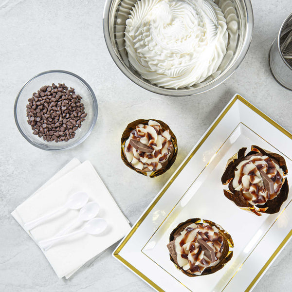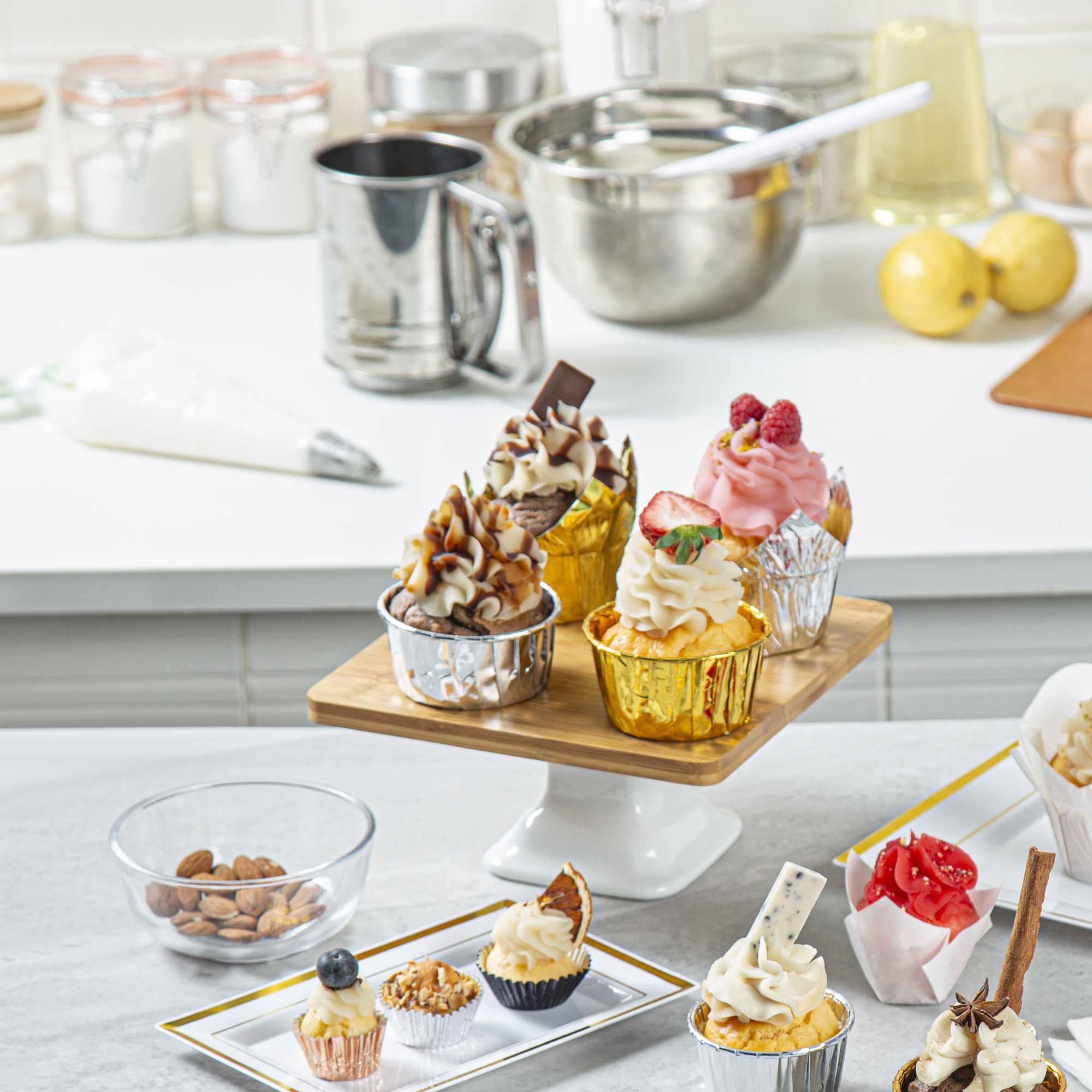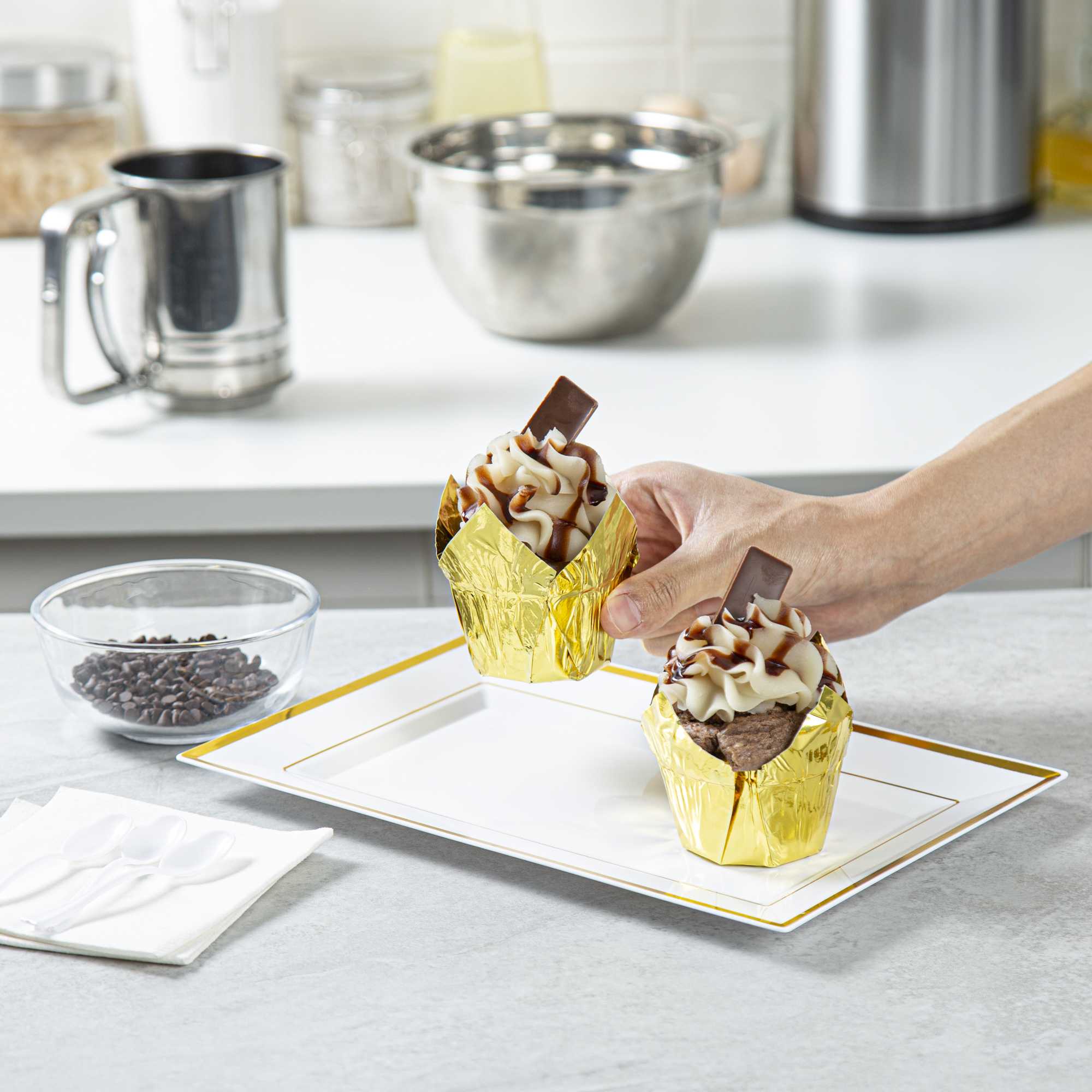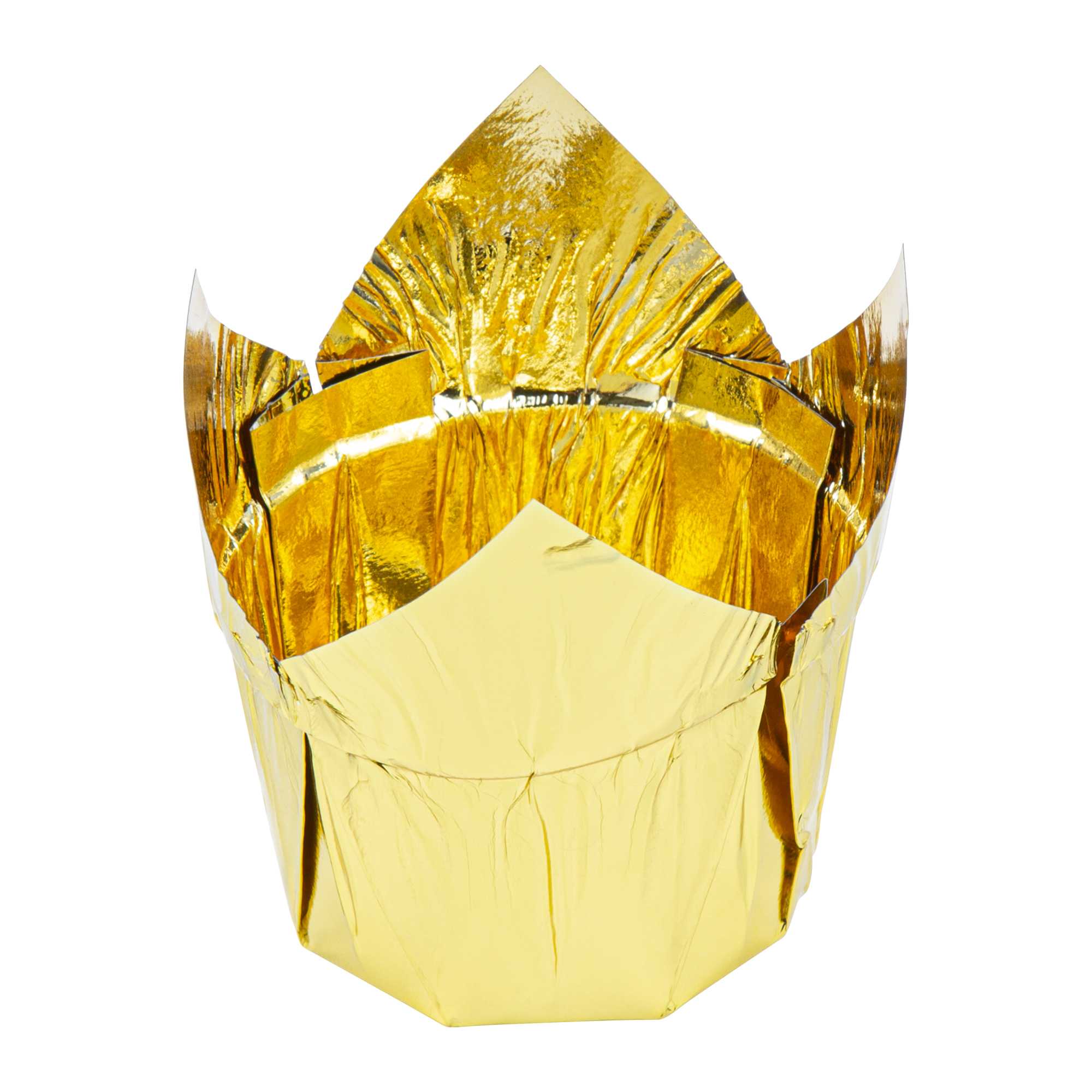 Give your sweet treats some glitz and glamour with our Panificio 4-ounce Tulip Rose Gold Paper Regular Baking Cups. Featuring a four-pointed tulip design, these baking cups beautifully frame miniature cupcakes and bite-sized desserts. The impermeable-to-grease construction of these cupcake liners avoids unsightly messes and grease splotches. Conveniently oven-ready and freezable up to 450F, these gold cupcake wrappers are ideal for baking warm and cold pastries at bakeries, cake shops, and catering events. Constructed from metallic-coated paper, these glittering gold cupcake liners make your bakery packaging supplies shine. These baking liner cups are disposable to streamline the cleaning process. Holding up to 4 ounces, each paper baking cup measures 2.2 inches in diameter by 1.5 inches in height. Shipped in 200 count box.