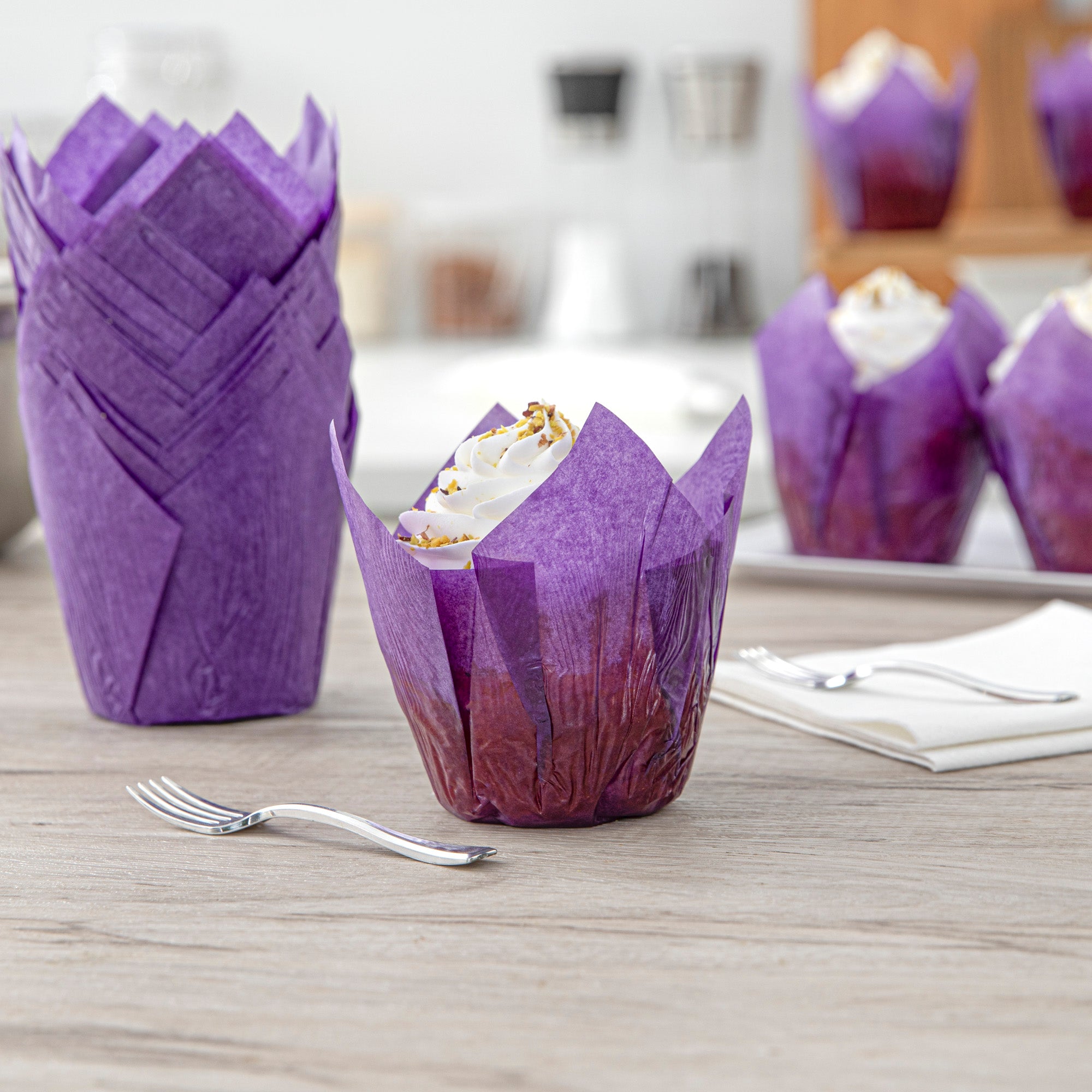 Revamp your desserts using our Panificio 4-ounce Violet Paper Tulip Baking Cups. Featuring a four-pointed petal design, these tulip baking cups are a great way to frame and showcase your personal-sized treats. These paper baking cups are conveniently freezer-safe and oven-safe up to 425F. Made from premium paper, these tulip muffin liners are designed to easily peel away and maintain their shape and look. The grease-resistant feature helps retain moisture in your recipes and prevents oily batters or buttery frostings from leaking through. Each of these cupcake wrappers features an eye-catching purple color that looks great in bakery display cases or dessert displays. Containing up to 4 ounces, these purple cupcake liners measure 3.5 inches in diameter by 3.5 inches in height. Sold in a 200 count box.