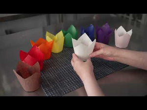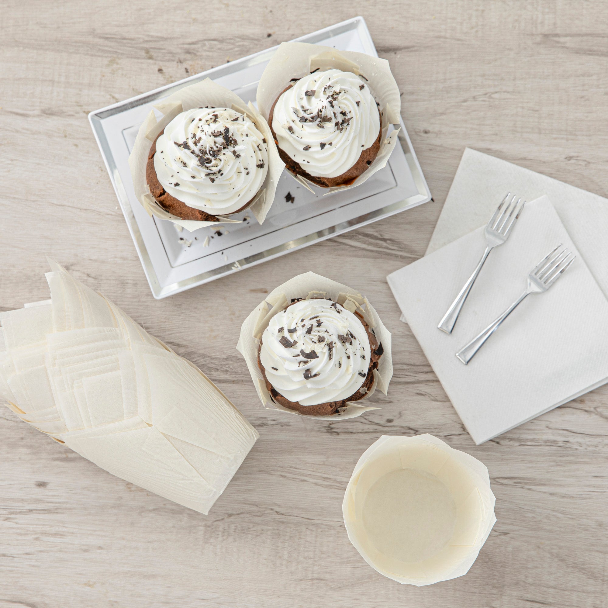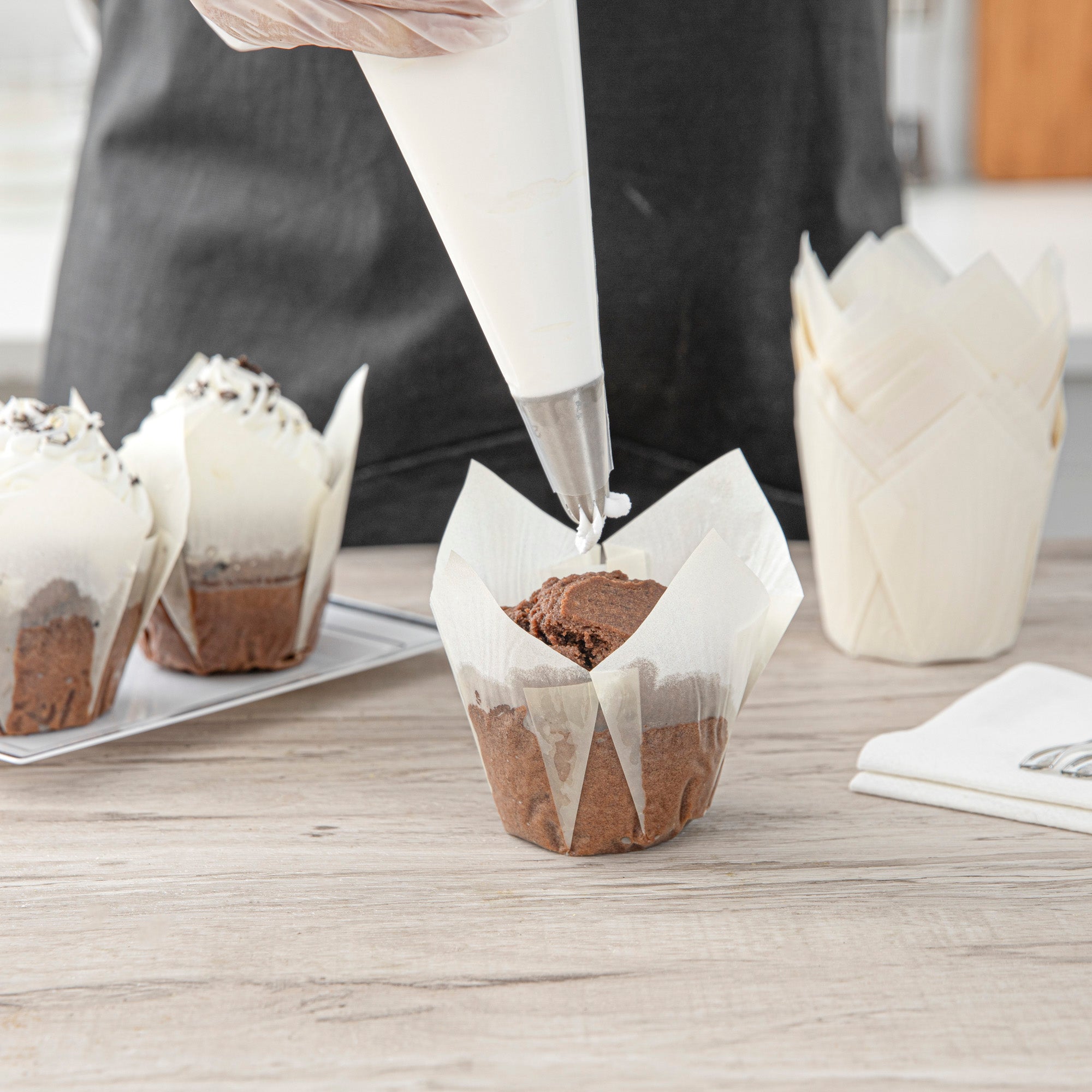 Create a professional look for your baked goods with these Panificio 4-ounce White Paper Tulip Baking Cups. Designed with four pointed petals, these paper cupcake liners beautifully showcase treats and instantly attract your guests' attention. Their pristine white finish provides a refreshing background for your delicious goods, while their four-petaled design adds a unique flair to your dessert presentations. Crafted from high-quality greaseproof paper, these white cupcake liners can be effortlessly peeled away from baked goods to ensure they maintain their shape and always look their best. Each of these premium paper baking cups can contain up to 4 ounces and has a diameter of 3.5 inches. These paper baking cups are freezer-safe and oven-safe up to 425°F. Shipped in a 200 count box.