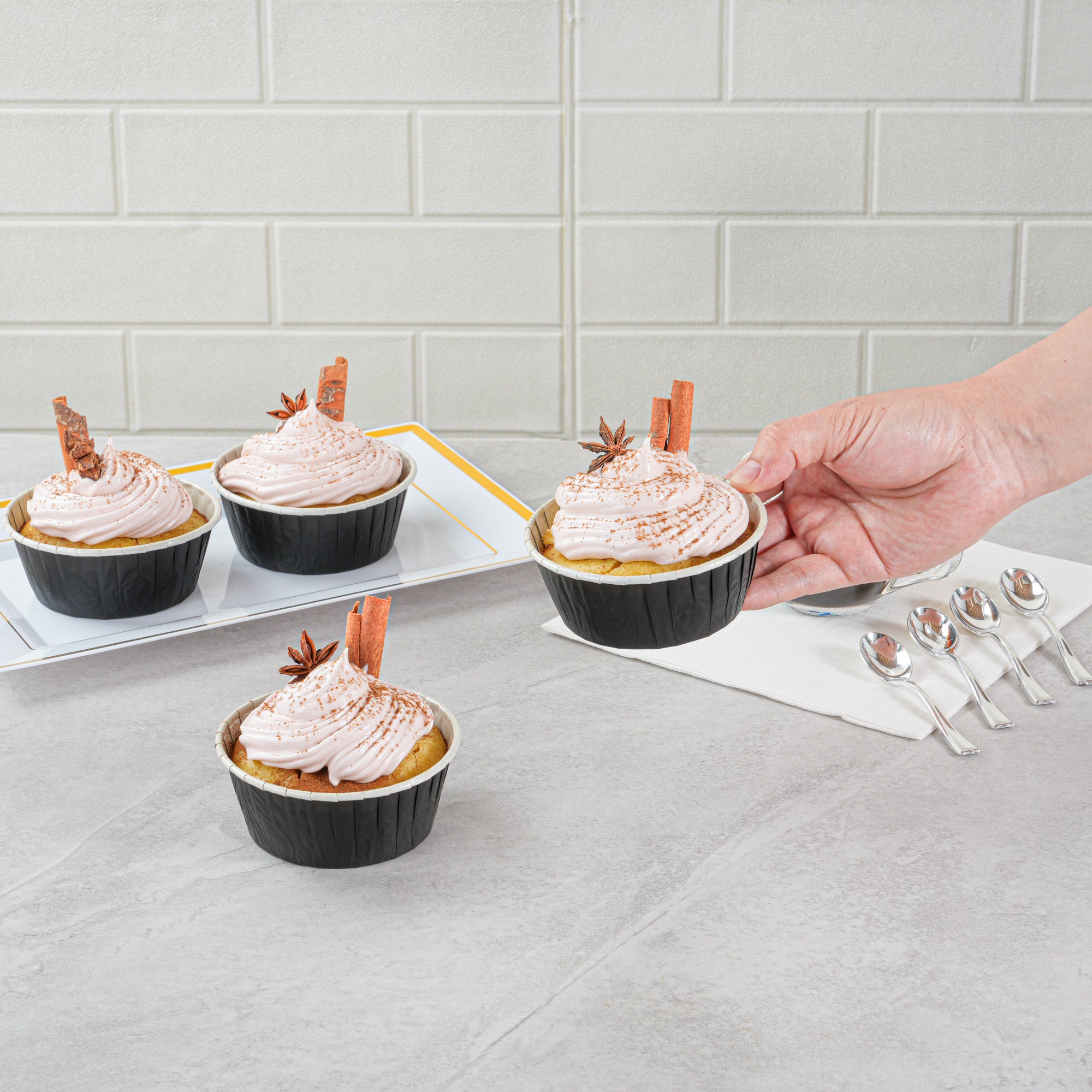 Prevent messy baking mishaps with grease-resistant liners. Panificio Grease-Resistant Black Paper Cupcake Liners ensure easy release of treats, thanks to their specialized coating that keeps your cupcakes looking pristine. These cupcake liners are crafted from heavyweight paper, designed to withstand oven temperatures up to 425 degrees Fahrenheit, which ensures consistent baking results for busy kitchens. Their pleated design beautifully accentuates cookies, muffins, and cupcakes, elevating the visual appeal of your baked creations and impressing your customers. With a versatile 3.65 inches in length and width, these liners fit standard baking trays, making them ideal for catering and bakery settings. The sleek black color adds a touch of elegance, making them perfect for upscale events or everyday use in cafes. Upgrade your baking essentials with these muffin cups and elevate your presentation effortlessly. Sold in a 200 count box.