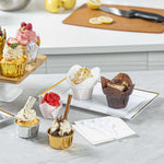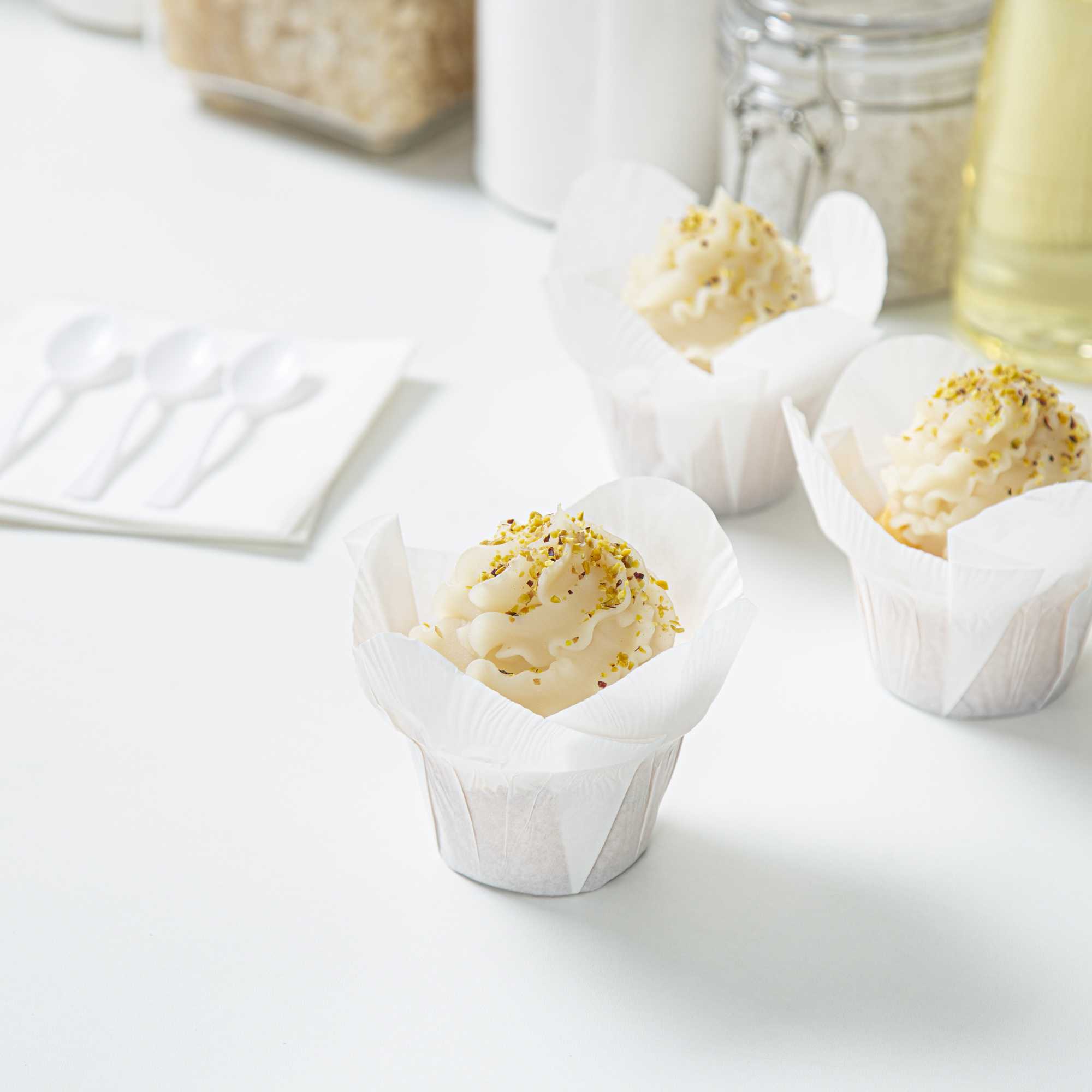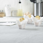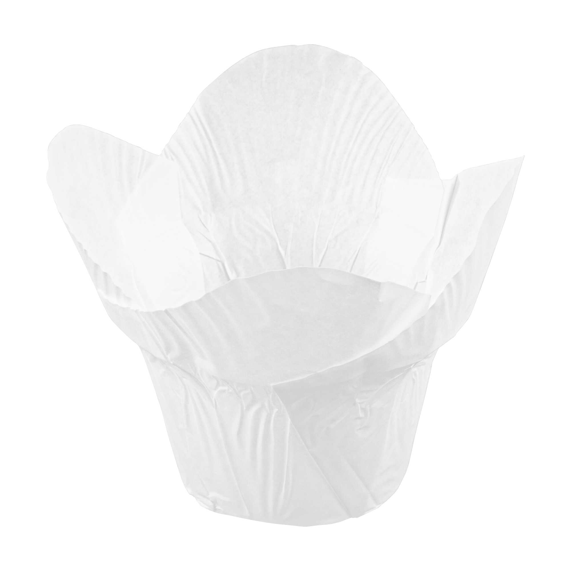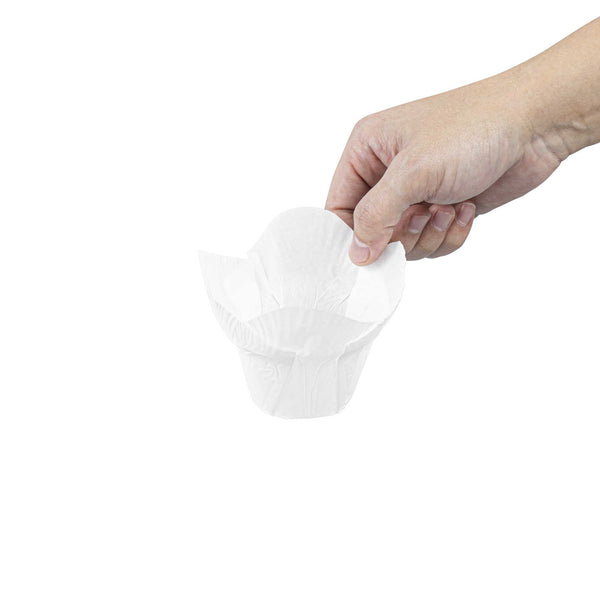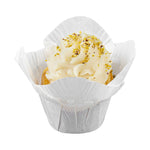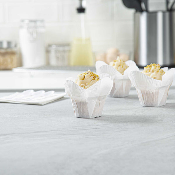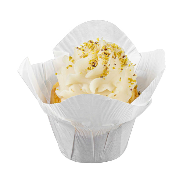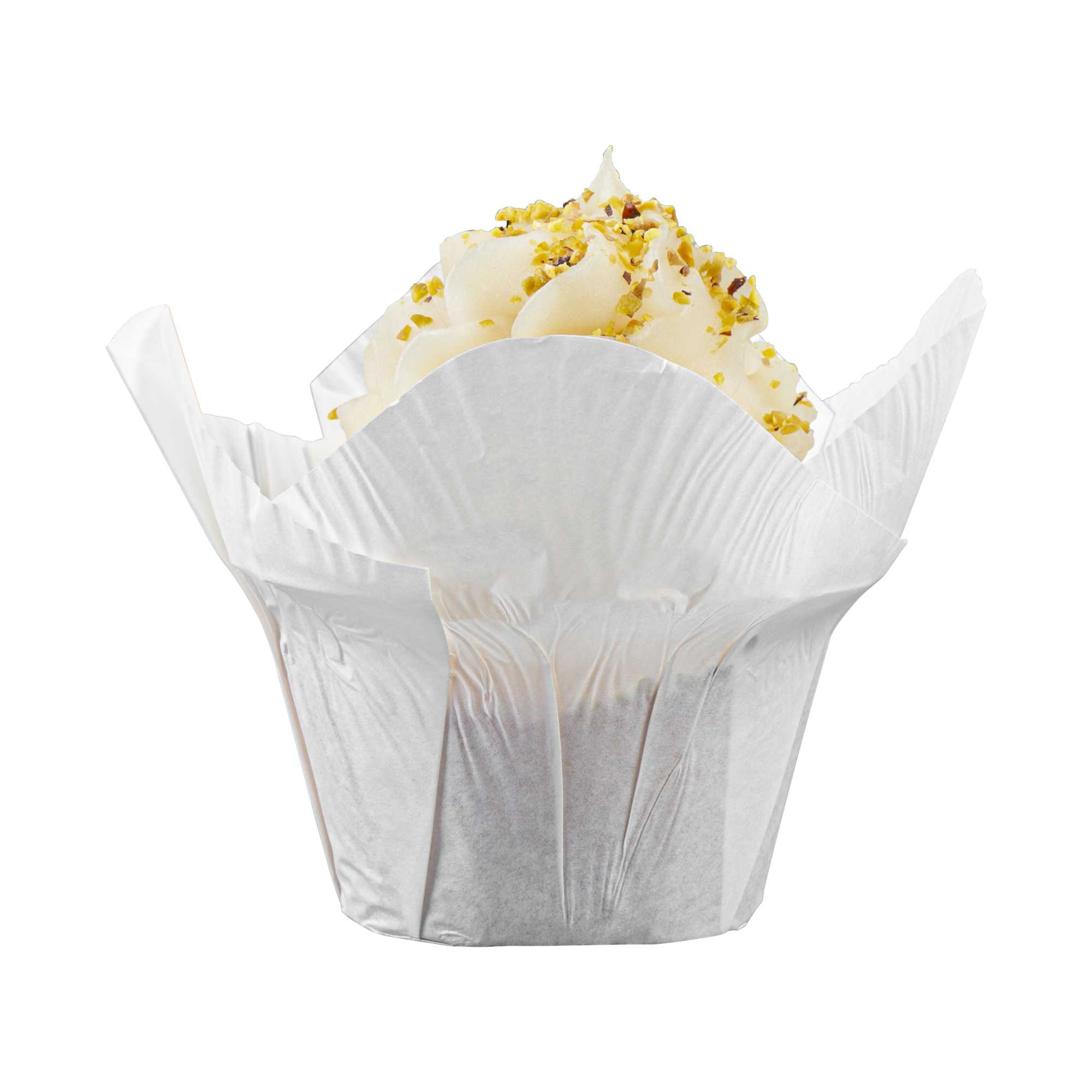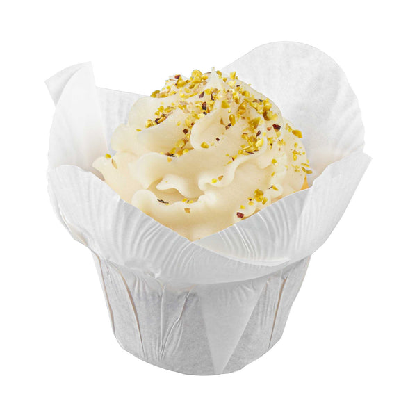 Dress up cupcakes and bite-sized desserts in these Panificio 6-ounce Daffodil White Paper Baking Cups. With a grease-resistant interior coating, these mini muffin liners effortlessly shrug off grease to maintain their pristine white paper construction. These muffin batter liners have four-petaled exterior beautifully frames your baked goods and sweet treats. To quickly bake and serve your delectable cupcakes for a large event, these white paper cupcake liners are oven-safe up to 425F. For a smooth cleanup after parties, these baking cups are disposable. These cupcake cups can also be popped in the freezer to cool desserts conveniently. With a capacity of 6 ounces, these disposable baking cups measure 3.25 in diameter by 3 inches in height. Sold in a 200 count box