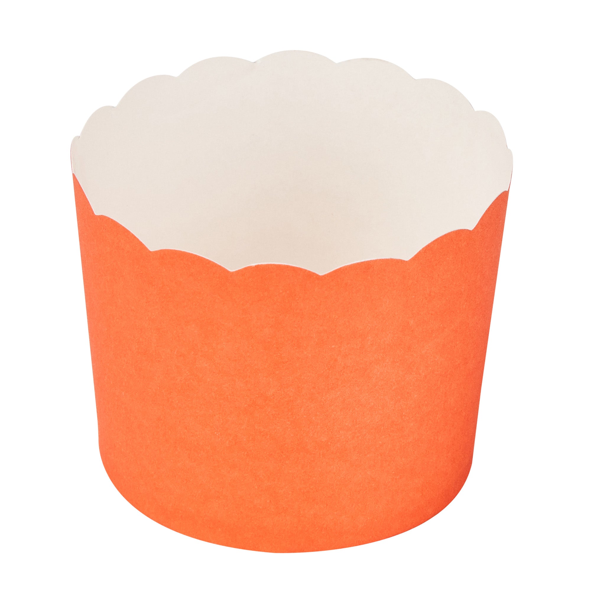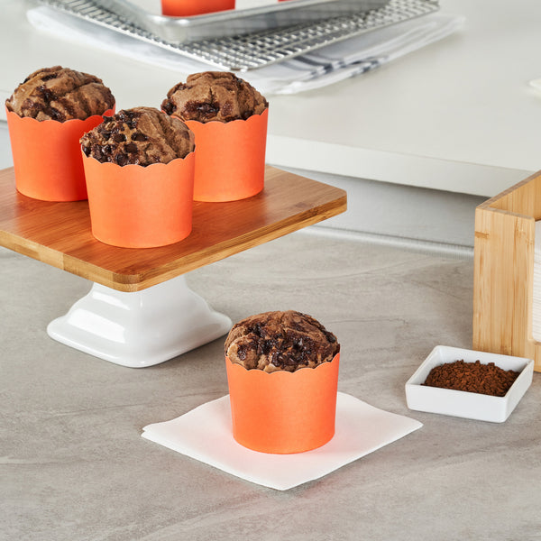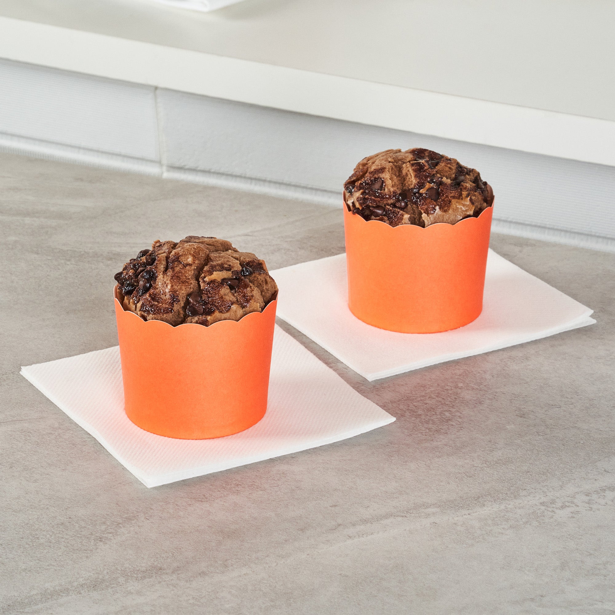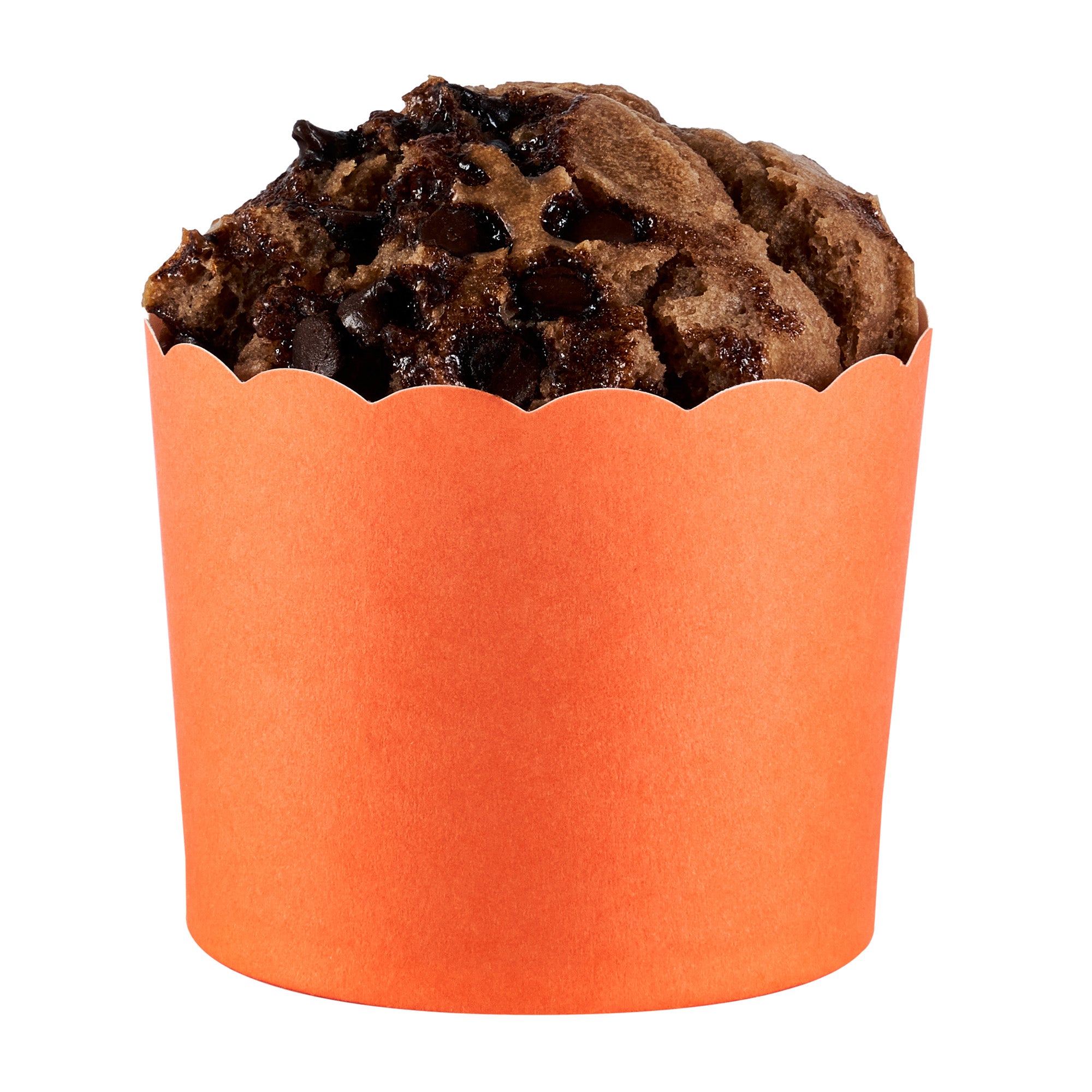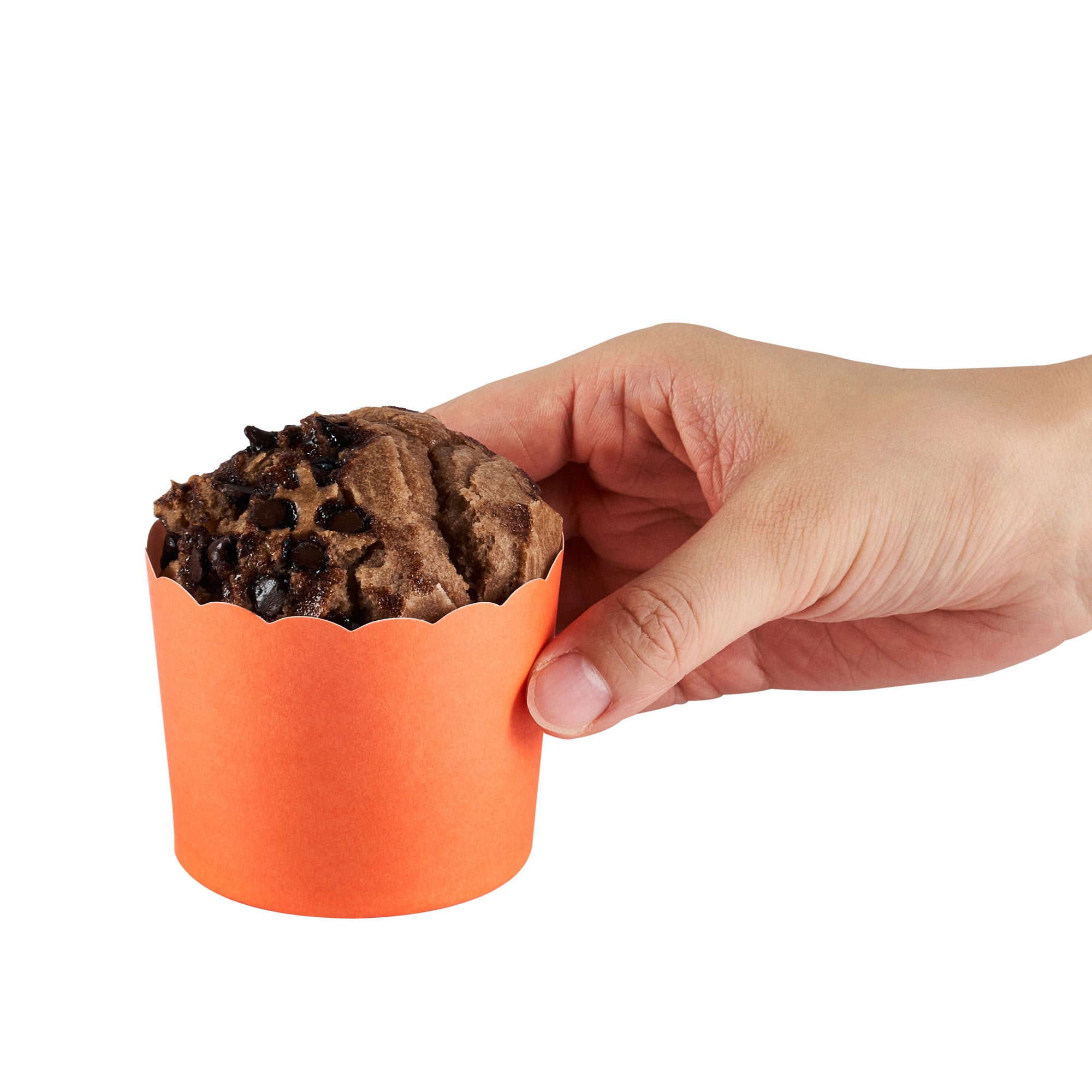 Enhance dessert presentation with stylish solutions. The Panificio Greaseproof Muffin Cups feature a robust greaseproof paper construction that withstands baking, ensuring muffins and cupcakes release cleanly and maintain their delicate shape. These disposable baking cups boast a sophisticated tulip design with scalloped edges, elevating the visual appeal of your confections and making them irresistible to customers. Their vibrant tangerine color adds a vivid pop to dessert displays, drawing attention in bakery showcases or at catering events. Ideal for coffee shops, these oven-ready muffin cups streamline your baking process, enabling you to bake directly in the cup while saving time and reducing mess. Rely on these versatile, 2.75-inch by 2.75-inch by 2.25-inch disposable baking cups for all your bakery needs. Each order includes 200 Panificio Greaseproof Muffin Cups.