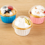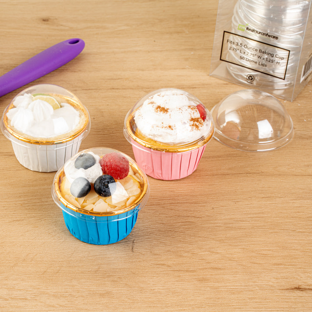 Ensure your treats stand out with elegant presentation. Panificio Dome Shape Baking Cups feature a distinctive dome design that provides extra room for toppings, keeping your creations beautifully intact and enhancing your clear dome lid displays. The clear finish of these cupcake display lids allows for quick and effortless identification of contents, making it easy to showcase your desserts with efficiency. Made from durable plastic, these round plastic lids offer reliable protection, ensuring your delectable treats remain safe during transport. Ideal for bakeries and caterers, the 2.7 inches by 2.7 inches by 1.5 inches dimensions provide a perfect fit for standard-sized cupcakes or muffins. Elevate your bakery's presentation and optimize your service with these recyclable and greaseproof baking cups. Sold in a 500 count box.