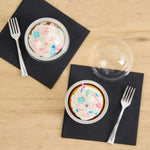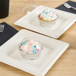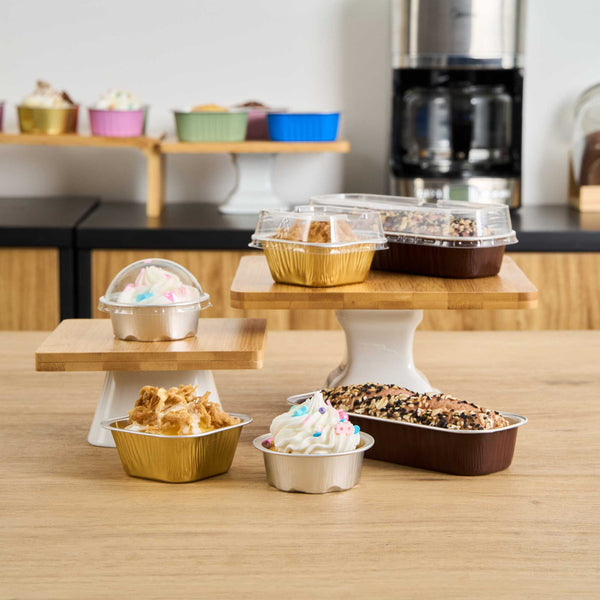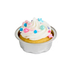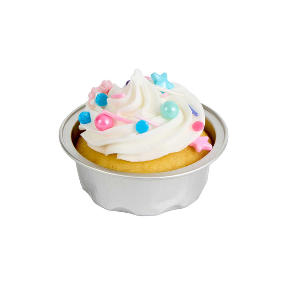 Efficiently bake and serve your desserts using our Pastry Tek 2-ounce Round Silver Aluminum Baking Cups. The dome-shaped lids included with these baking cups enable you to provide a lovely show without risking damage from the outside. Making food preparation and service quick and easy, these muffin cups are oven-safe, and freezer safe. With their disposable design, these baking cups with lids are disposable for a simplified cleaning process. Ideal for cafes or bakeries, these disposable cupcake foils make the packaging of takeaway orders a convenient process. Containing up to 2 ounces, each mini cake pan with lids measures 2.75 inches in diameter by 1 inch in height. Sold in a 100 count box.