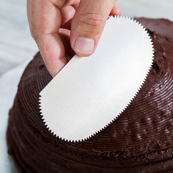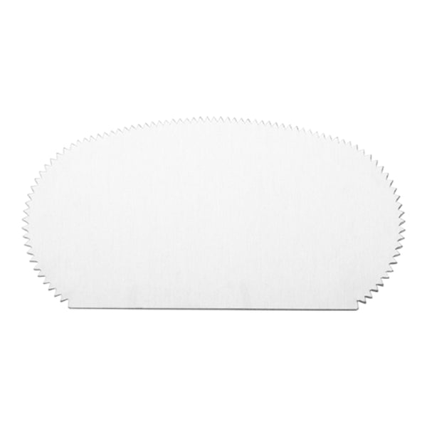 Upgrade your dessert presentations with our Pastry Tek 2-Pattern Metal Cake Scraper and Icing Comb with Fine Tooth Straight Edge. Designed with a fine-toothed edge, this handy cake scraper easily creates intricate stripes along the sides of your cakes and quickly smoothes out frosting with its flat edge. This metal cake scraper is great for quickly decorating small or large cakes at your cafe, bakery, patisserie, or other foodservice establishments. Constructed from high-quality metal, this frosting comb is shatterproof and scratch-resistant to maintain its premium construction for long-lasting use. This buttercream comb is designed with a hanging hole to conveniently store in your establishment or home. To maintain this quality of this icing scraper, we recommend hand washing only. Measuring 4.8 inches long by 2.5 inches wide, this frosting scraper is shipped in a 1 count box.