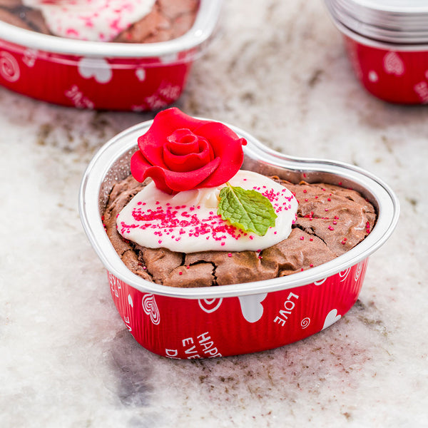 Make your special days magical with our Pastry Tek 3-ounce Heart Happy Hour Aluminum Baking Cups. These mini cake tins come with dome lids that preserve beautiful cake decorations even while being transported. The premium aluminum construction makes these single muffin tins safe for use in ovens and freezers, making them efficient in preparing desserts. Making the cleaning process super easy, these cupcake foils are disposable. With a transparent lid and festive design, these baking cups can be used for mini cakes, cupcakes, or brownies in cafes, bakeries, birthdays, or wedding parties. Containing up to 3 ounces, each mini cake foil measures 3.5 in diameter by 1.25 in height. Sold in a 100 count box.