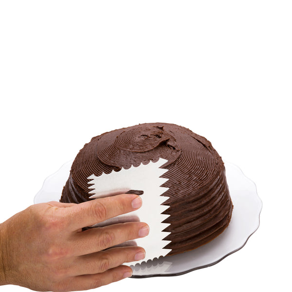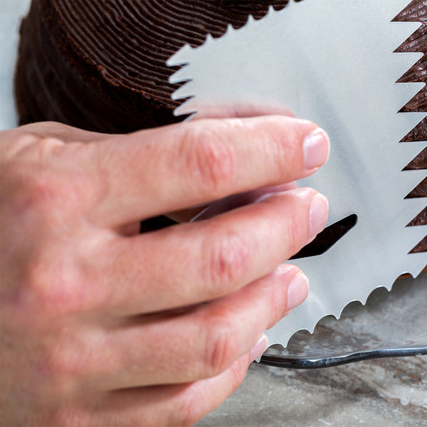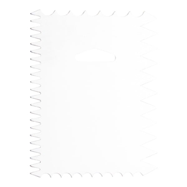 Add beautiful details to your delicious cakes with our Pastry Tek 4-Pattern Metal Cake Scraper and Icing Comb with Wave and Wide Tooth Edge. Built with assorted designs, this handy ice scraper can add thick rounded stripes or sharp thin stripes to the sides of your cakes to enhance your dessert presentation. This cake decorating tool is constructed with a hanging hole to provide convenient storage in your cafe, patisserie, bakery, or other foodservice establishment. Crafted from high-quality metal, this cake side scraper is scratch-resistant and shatterproof for long-lasting commercial use. This frosting comb is great for stylishly decorating small or large cakes and other sweet desserts. To maintain the look of this frosting scraper, we recommend hand washing only. Measuring 4.8 inches long by 3.8 inches wide, this cake comb is available in a 1 count box.