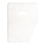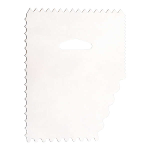 Easily decorate scrumptious cakes with our Pastry Tek 5-Pattern Metal Cake Scraper and Icing Comb with Assorted Combo Edge. Featuring 5 assorted edges, this versatile cake scraper seamlessly creates detailed thin stripes or smooth rounded stripes depending on which edge you are using. This decorating comb can also be used to make zigzag designs with up and down motions on small or large cakes. Constructed from high-quality metal, this durable decorating comb is naturally shatterproof and scratch-resistant to maintain its premium structure for long-lasting use. This handy frosting comb is built with a hanging hole to conveniently store in your bakery, cake shop, catering company, or other foodservice establishment. We recommend hand washing this icing comb to preserve its premium design. Measuring 4.8 inches long by 3.8 inches wide, this cake decorating tool is available in a 1 count box.