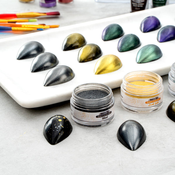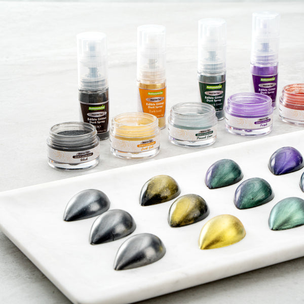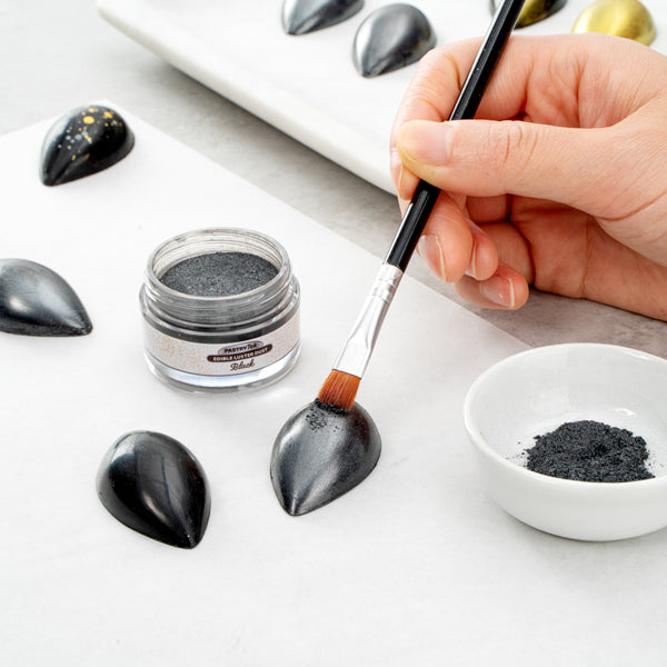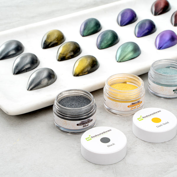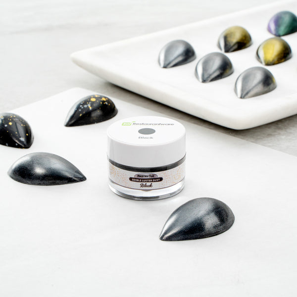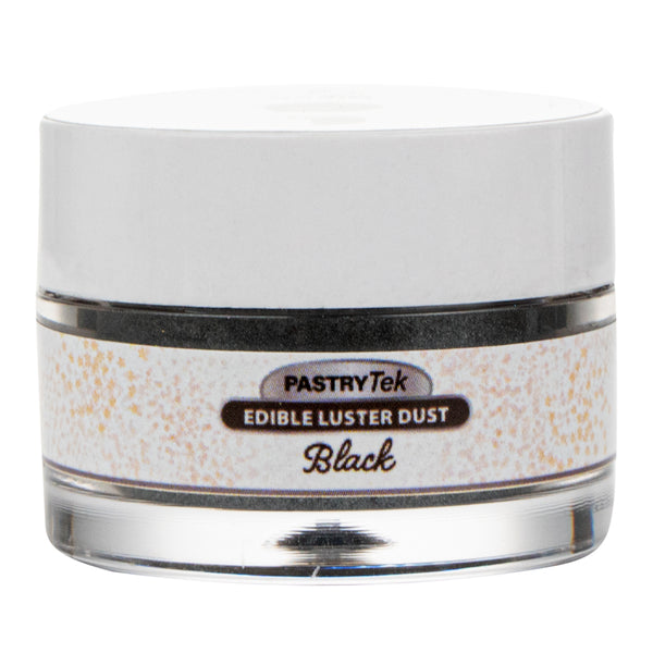 Decorate cakes, drink, or candies with our Pastry Tek 5-gram Black Edible Luster Dust. This edible glitter is FDA-approved and kosher-certified for a safe way to add some sparkle to your food presentations. With an unflavored, water-soluble design, this luster dust is perfect for mixing into wet ingredients or brushing onto dry treats without affecting the flavors. This food-grade dessert glitter features a black shimmer finish to complement the aesthetic of special events. To avoid tampering and ensure optimal quality over time, this food glitter is equipped with an inner protective seal. With a 5-gram capacity, this edible shimmer is suitable for use with hot or cold foods. Sold in a 1 count box. Store in a cool, dry place away from direct sunlight to preserve the quality of this cake glitter.