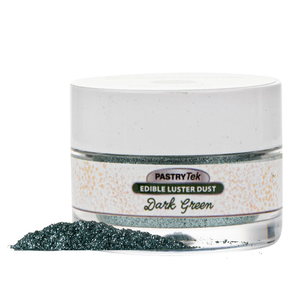 Add some sparkle to all of your baked goods with our Pastry Tek 5-gram Dark Green Edible Luster Dust. Made from FDA-approved and kosher-certified ingredients, this edible glitter is suitable to use on any type of food. With a water-soluble composition, this luster dust can easily be mixed into cold beverages or sprinkled on warm cookies. This food-grade dessert glitter has a shimmer dark green finish to effortlessly complement any party theme. To prevent messy spills and retain optimal quality, this edible luster dust is equipped with a tamper-evident, protective inner seal. This food glitter has a total capacity of 5 grams. Store in a cool, dry place away from direct sunlight to preserve the quality of this cake glitter.