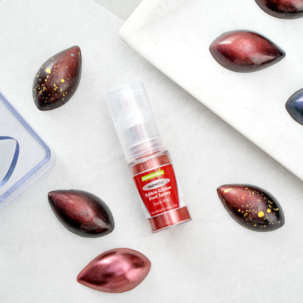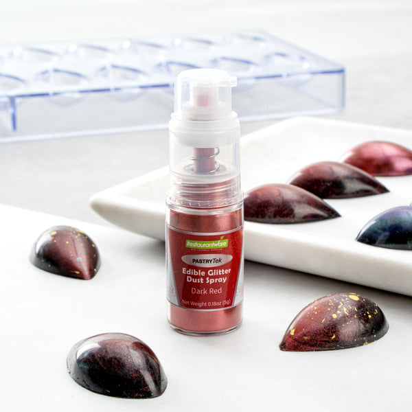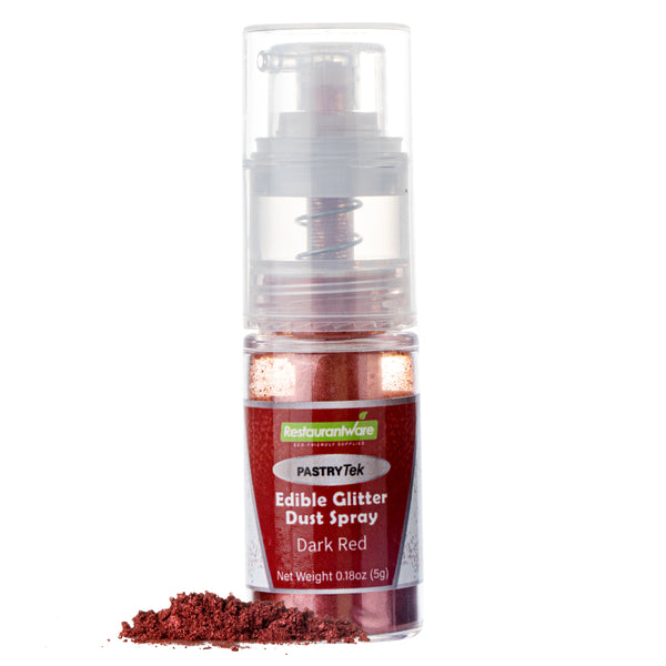 Create stunningly decorated desserts with our Pastry Tek 5-Gram Dark Red Edible Glitter Dust Spray. Great for entrees or frozen treats, this edible glitter dust can be used on hot or cold foods. This food glitter can be mixed with your beverage concoctions to give an extra sparkle to your presentations. Featuring a non-aerosol pump spray, these edible sparkles evenly decorate your baked goods with every pump. Perfect for serving customers with specific diets, this cake glitter dust is FDA-approved, vegan and kosher-certified. When storing, place this edible shimmer dust in a cool, dry place away from direct sunlight, frost, or heat. With a dark red color, this cake glitter matches your Valentine's day decorations and sweets. This red edible glitter contains 5 grams of sparkles. Sold in a 1 count box.
