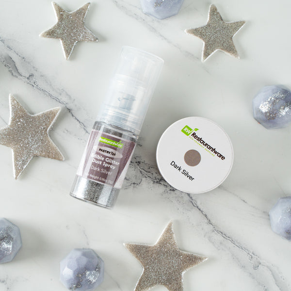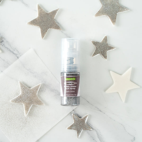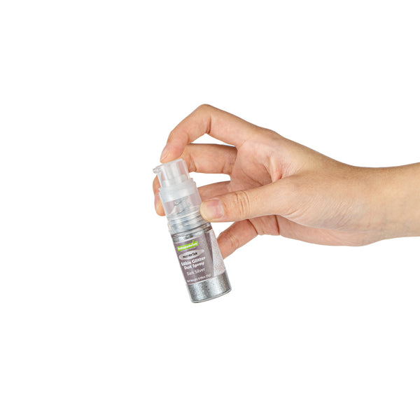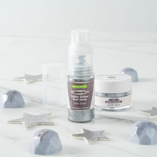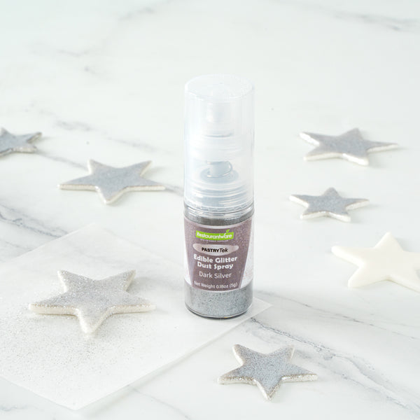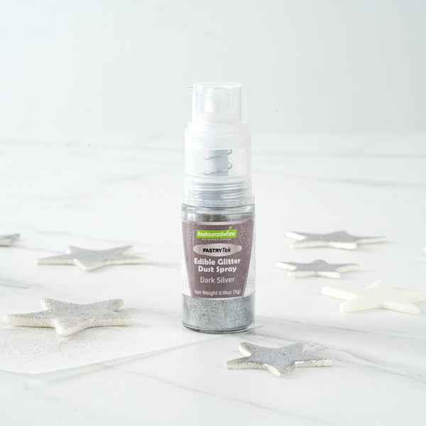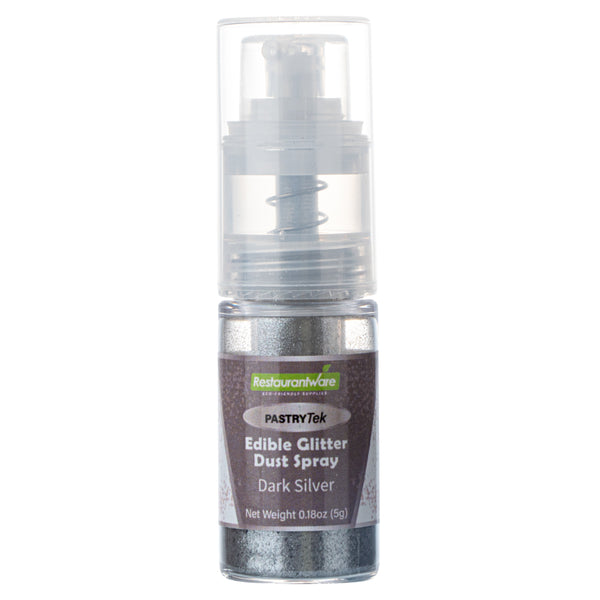 Elegantly decorate fondant with our Pastry Tek 5-Gram Dark Silver Edible Glitter Dust Spray. Made for putting on desserts, this edible sparkle is FDA-approved and food-grade for decorating hot or cold foods. Ideal for mixing into drinks, this food glitter is water-soluble and gives your beverages a one-of-a-kind look. The non-aerosol pump spray of this cake glitter lets out an even amount of sprinkles for effortless decorating. To easily serve customers with restrictive diets, this cupcake glitter is Kosher-certified and vegan. This edible shimmer dust must be stored in a cool, dry place that is away from direct sunlight, frost, or heat. Featuring a dark silver color, this shimmer spray for cakes gives your pastries a cool and chic appearance. This edible glitter powder contains 5 grams of sparkles. Sold in a 1 count box.