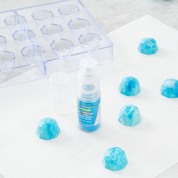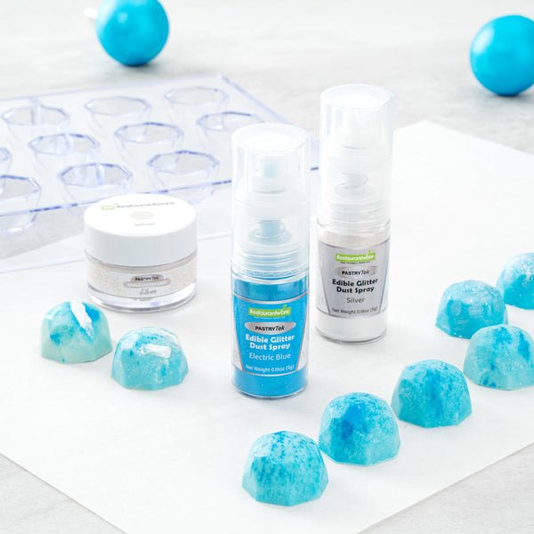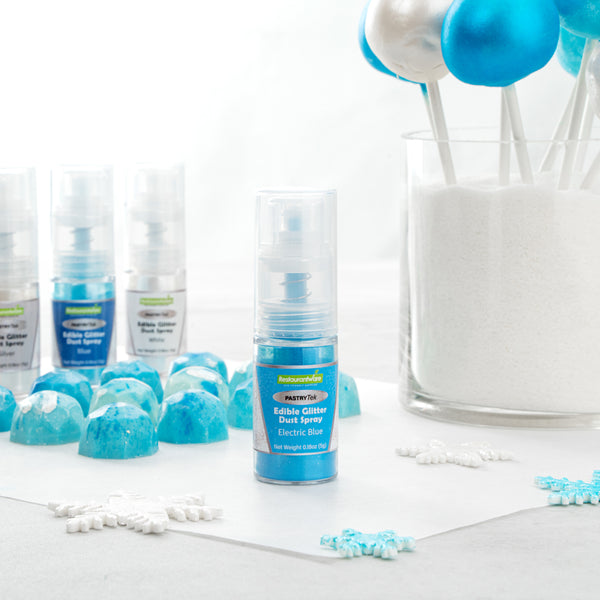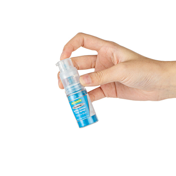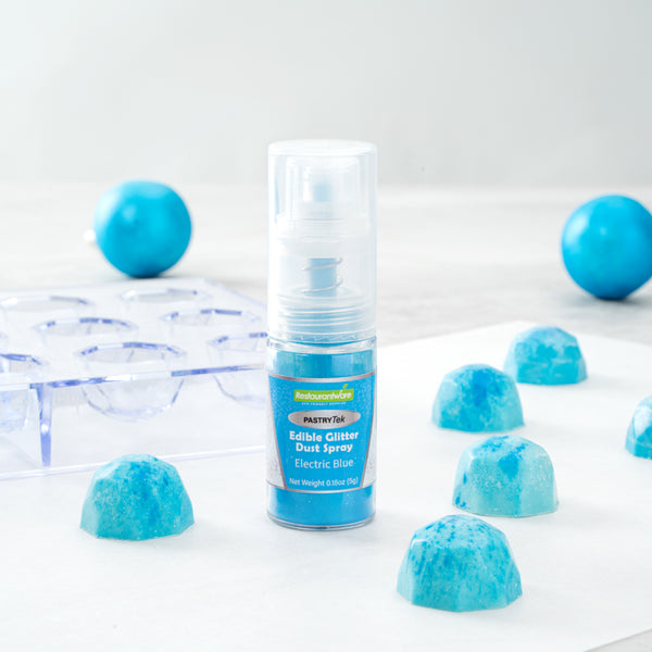 Show off your sparkling cupcakes by using our Pastry Tek 5-Gram Electric Blue Edible Glitter Dust Spray. Ideal for using on hot or cold foods, this cake glitter is edible, FDA-approved, and food-grade. For given drinks an extra appealing look, this cupcake glitter is water-soluble. Equipped with a non-aerosol pump spray, this edible shimmer dust spurts out a steady stream of glitter for even coating. To satisfy the taste of customers with restrictive diets, this shimmer spray for cakes is Kosher-certified and vegan. This edible glitter dust for strawberries must be stored in a cool, dry place which does not receive direct sunlight, frost, or heat. The electric blue color of this edible glitter makes your desserts match the decorations at your event. This cake glitter spray holds 5 grams of sparkles. Sold in a 1 count box.